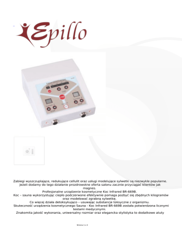 Zabiegi wyszczuplające, redukujące cellulit oraz usługi modelujące sylwetki są niezwykle popularne. Jeżeli dodamy do tego działanie prozdrowotne oferta salonu zacznie przyciągać klientów jak magnes. Profesjonalne urządzenie kosmetyczne Koc Infrared BR-669B. Koc – sauna wykorzystując ciepło podczerwone efektywnie pomaga pozbyć się zbędnych kilogramów oraz modelować zgrabną sylwetkę. Co więcej działa detoksykująco – usuwając substancje toksyczne z organizmu. Skuteczność urządzenia kosmetycznego Sauna - Koc Infrared BR-669B została potwierdzona licznymi testami medycznymi. Znakomita jakość wykonania, uniwersalny rozmiar oraz elegancka stylistyka to dodatkowe atuty Strona 1 z 2 modelu BR-669B. Oto szczegóły: Koc Infrared to profesjonalne urządzenie, które wykorzystuje ciepło podczerwone, wspomaga wyszczuplanie, modelowanie sylwetki oraz wydalanie toksyn z organizmu, z niezależnie regulowanymi strefami grzewczymi. Badania medyczne wykazały niezwykłe rezultaty zdrowotne działania promieniowania cieplnego. Promienie podczerwone, ulegają prawie w całości absorbcji i zamianie w ciepło w powierzchownych warstwach skóry. Promienie te przenikają w głąb skóry do 4 cm i docierają do tkanki podskórnej, bogato unaczynionej, a nawet do mięśni. W wyniku znacznego przyspieszenia przemiany materii, organizm wydala wodę, ale również produkty spalania tłuszczów, metale ciężkie i inne toksyczne substancje. Wspomaga cyrkulację płynów ustrojowych. Jednoczy starą już i uznaną metodę zabiegów techniką ciepła, która to jest wykorzystywana w bardzo wielu zabiegach. Przemiana materii w strefach odpornych nawet na dietę zostaje przez to zwiększona i rozpoczyna się proces utraty tłuszczu. Dopiero po takim oddziaływaniu na włókna skóry może rozpocząć się proces spalania tłuszczu. Dobrze ukrwione włókna podskórne pomagają w spalaniu tłuszczu i poprzez układ krwionośny jest on transportowany do wątroby. To jest punktem wyjściowym umożliwiającym zrzucenie zbędnych kilogramów. Dzięki wykorzystaniu przez urządzenie niskiego napięcia 36V nie stwarzamy zagrożenia porażenia pacjenta. Najnowszy, bardzo wytrzymały materiał PVC z którego wykonana jest kołdra jest łatwy w utrzymaniu czystości, dzięki czemu z powodzeniem może być stosowany w salonach kosmetycznych, odchudzania oraz wellness & spa. Funkcje urządzenia: - modelowanie i odchudzanie całego ciała analogicznie do tradycyjnej sauny na podczerwień; zdecydowane ujędrnienie skóry – redukcja rozciągniętej skóry po dużej utracie wagi np. po ciąży, dietach lub przebytych chorobach; - poprawa struktury skóry i tkanki łącznej – w efekcie redukcja cellulitu oraz rozstępów; - wspomaga wchłanianie preparatów odżywczych, usuwa zmęczenie; - zmniejszenie bólu poprzez promieniowanie podczerwieniowe w przypadku uciążliwości reumatycznych; - poprawa krążenia; - redukcja ciśnienia; - terapia fizyczna urazów mięśni i nerwów; - efektywne odprężenie napiętych lub „zakwaszonych” mięśni; - intensywna poprawa samopoczucia (poprzez antydepresyjne działanie podczerwieni); - poprawa snu, pomoc w przypadku bezsenności; - przyśpieszenie – polepszenie funkcji przemiany materii w organizmie; - oczyszczenie organizmu z toksyn (poprzez uaktywnienie układu limfatycznego); - posiada pozytywne działanie na funkcje wątroby; - silne uaktywnienie układu immunologicznego; Strona 2 z 2