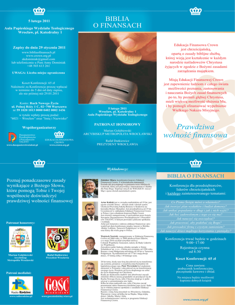 5 lutego 2011 Aula Papieskiego Wydziału Teologicznego Wrocław, pl. Katedralny 1 BIBLIA O FINANSACH Edukacja Finansowa Crown jest chrześcijańską, opartą o zasady biblijne służbą, której wizją jest kształcenie w każdym narodzie naśladowców Chrystusa żyjących w zgodzie z Bożymi zasadami zarządzania majątkiem. Zapisy do dnia 29 stycznia 2011 www.bibliaofinansach.pl www.crown.org.pl [email protected] lub telefonicznie u Pani Anny Dominiak +48 503 613 261 UWAGA: Liczba miejsc ograniczona Koszt Konferencji: 65 zł Należność za Konferencje proszę wpłacać w terminie do 5 dni od daty zapisu, ale nie później niż 29.01.2011 Konto: Ruch Nowego Życia ul. Polnej Róży 1 C, 02−798 Warszawa nr 59 1020 1013 0000 0402 0002 1436 w tytule wpłaty proszę podać: "6021 − Wrocław" oraz "Imię i Nazwisko" Współorganizatorzy Duszpasterstwo Przedsiębiorców i Pracodawców TALENT www.duszpasterstwotalent.pl EDUKACJA FINANSOWA CROWN www.crown.org.pl 5 lutego 2011 Wrocław, pl. Katedralny 1 Aula Papieskiego Wydziału Teologicznego PATRONAT HONOROWY Marian Gołębiewski ARCYBISKUP METROPOLITA WROCŁAWSKI Misją Edukacji Finansowej Crown jest zapewnienie ludziom z całego świata możliwości poznania, zastosowania i nauczania Bożych zasad finansowych po to, by poznali głębiej Chrystusa, mieli większą możliwość służenia Mu, i by pomogli sfinansować wypełnienie Wielkiego Nakazu Misyjnego. Prawdziwa wolność finansowa Rafał Dutkiewicz PREZYDENT WROCŁAWIA Wykładowcy: Poznaj ponadczasowe zasady wynikające z Bożego Słowa, które pomogą Tobie i Twojej wspólnocie doświadczyć prawdziwej wolności finansowej Patronat honorowy: Marian Gołębiewski Rafał Dutkiewicz Arcybiskup Metropolita Wrocławski Prezydent Wrocławia Patroni medialni: www.radiorodzina.pl www.goscniedzielny.wiara.pl BIBLIA O FINANSACH Zdzisław Miara, koordynator krajowy Edukacji Finansowej Crown. Z wykształcenia matematyk. Posiada dar przystępnego wyjaśniania treści biblijnych. Człowiek, który jest przywódcą i innowatorem w służbie dla Pana Boga. Inspiruje innych do WIELKICH rzeczy! Mąż i ojciec dwóch nastoletnich synów. Artur Kalicki jest w związku małżeńskim od 19 lat, jest ojcem czwórki dzieci – dwóch córek i dwóch synów. Ukończył Prywatną Szkołę Biznesu w Krakowie na kierunku Biznes Menadżer. Jest przedsiębiorcą od 19 lat. Uczestniczył w zakładaniu Edukacji Finansowej Crown w Polsce i jest członkiem krajowej Rady Crown. Jest również zaangażowany w prowadzone przez księży Sercanów Duszpasterstwo Przedsiębiorców i Pracodawców TALENT, w którym prowadzi cykliczne spotkania i wykłady. Artur jest trenerem z zakresu edukacji finansowej i prowadził już duże konferencje między innymi w Bielsku -Białej, Lublinie, Tarnowie Podgórnym i w Gdyni oraz kursy dla wielu grup w Polsce. Wojciech Nowicki, zaangażowany w Edukację Finansową Crown od 2008 roku, w 2009 ukończył kurs liderów, a w maju 2010 uzyskał certyfikat mówcy. Członek Wspólnoty Genezaret, należy do Rady Liderów we Wspólnocie. Zawodowo pełni funkcję członka zarządu w firmie Schattdecor sp. z o.o., z którą jest związany od 1996 roku. Razem z żoną Małgorzatą mieszkają od 10 lat w Tarnowie Podgórnym. Są małżeństwem od 17 lat i mają dwoje dzieci, 15 letnią córkę i 10 letniego syna. Konferencja dla przedsiębiorców, liderów chrześcijańskich i każdego zainteresowanego tematami: Co Pismo Święte mówi o własności? Jak tworzyć plan wydatków i budżet domowy? Jak unikać popadania w długi i jak z nich wyjść? Jak być zadowolonym z tego co się ma? Jak nauczyć się oszczędzać? Jak pracować, aby podobać się Bogu? Jak prowadzić firmę z czystym sumieniem? Jak nauczyć dzieci mądrego korzystania z pieniędzy? Konferencja trwać będzie w godzinach 9:00−17:00 Rejestracja czynna od 8:30 Koszt Konferencji: 65 zł 20 lat temu, kiedy nasz kraj decydował się na transformację systemu, przejście z socjalistycznej beznadziei do kapitalistycznego raju, Piotr Werwiński był studentem ekonomii w Poznaniu i zdecydował się na transformację swojego życia. Przejście od życia skupionego na sobie do życia skupionego na Chrystusie. Kiedy po skończeniu studiów inni absolwenci zaczęli zmieniać oblicze naszej gospodarki on przyłączył się do Ruchu Nowego Życia, żeby Chrystus mógł go w pełni używać w przemienianiu serc ludzi. Kilka lat temu nadszedł czas, żeby Chrystus zaczął przemieniać także finansową dziedzinę jego życia. Stało się to właśnie poprzez spotkanie z zasadami Edukacji Finansowej Crown. Razem z żoną Anią mieszkali we Wrocławiu, Gdańsku, Warszawie i teraz od kilku lat na Śląsku. Mają trójkę dzieci: Jakuba, Martę i Julię. Jest woluntariuszem i mówcą w programie Edukacji Finansowej Crown. Cena zawiera: podręcznik konferencyjny, poczęstunki kawowe i obiad. Na miejscu będzie możliwość kupienia dobrych książek www.crown.org.pl