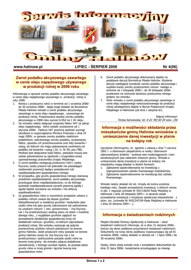 www.halinow.pl LIPIEC - ŚERPIEŃ 2006 6. Zwrot podatku akcyzowego zawartego w cenie oleju napędowego używanego w produkcji rolnej w 2006 roku Informacaja w sprawie zwrotu podatku akcyzowego zawartego w cenie oleju napędowego używanego w produkcji rolnej w roku 2006 1. Rolnicy ( producenci rolni) w terminie od 1 września 2006r do 30 września 2006r . będą mogli składać do Burmistrza Miasta Halinów wnioski o zwrot podatku akcyzowego zawartego w cenie oleju napędowego , używanego do produkcji rolnej. Proponowana stawka zwrotu podatku akcyzowego w 2006 roku wynosi 0,45zł na 1 litr oleju. 2. Do wniosku należy dołączać oryginały faktur VAT za zakup oleju napędowego, które zostały wystawione od 1 stycznia 2006r . Faktura VAT powinna spełniać wymogi określone w rozporządzeniu Ministra Finansów z dnia 25 maja 2005r. w sprawie zwrotu podatku niektórym podatnikom, zaliczkowego zwrotu podatku, wystawiania faktur, sposobu ich przechowywania oraz listy towarów i usług, do których nie mają zastosowania zwolnienia od podatku od towarów i usług ( Dz. U. Nr 95, poz.798). Możliwe jest dołączenie kopii faktur, jednakże muszą one zostać potwierdzone za zgodnośc z oryginałem przez upoważnionego pracownika Urzędu Miejskiego. 3. O zwrot podatku występują producenci rolni ( osoby fizyczne, osoby prawne lub jednostki nie posiadające osobowości prawnej) będący posiadaczem lub współposiadaczem gospodarstwa rolnego. 4. W przypadku, gdy grunty gospodarstwa rolnego stanowią przedmiot współposiadania, zwrot podatku akcyzowego przysługuje temu współposiadaczowi, co do którego pozostali współposiadczacze wyrazili pisemną zgodę ( zgoda będzie wyrażana we wniosku i nie dotyczy współmałżonków). 5. Za gospodarstwo rolne w rozumieniu przepisów ustawy o podatku rolnym uważa się obszar gruntów sklasyfikowanych w ewidencji gruntów i budynków jako użytki rolne lub jako grunty zakrzewione lub zadrzewione na użytkach rolnych ( min. powierzchnia – 1ha fizyczny lub 1 ha przeliczeniowy) według stanu na dzień 1 kwietnia danego roku , z wyjątkiem gruntów zajętych na prowadzenie działalności gospodarczej innej niż działalność rolnicza i gruntów, na których zaprzestano produkcji rolnej. We wniosku wykazuje się jedynie powierzchnię użytków rolnych położonych na terenie gminy Halinów. Jeżeli producent rolny posiada na terenie gminy Halinów mniej niż 1ha fizyczny lub 1 ha przeliczeniowy i jednocześnie posiada użytki rolne na terenie innej gminy do wniosku załącza dodatkowe oświadczenie, z którego wynikać będzie, że posiada także grunty rolne w innej gminie i łącznie tworzą one gospodarstwo rolne. 7. Nr 4(06) Zwrot podatku akcyzowego dokonywany będzie na podstawie decyzji Burmistrza Miasta Halinów. Wydanie decyzji ustalającej wysokość zwrotu podatku akcyzowego i wypłata kwoty zwrotu producentom rolnym nastąpi w terminie od 1 listopada 2006 r. do 30 listopada 2006r. przelewem na rachunek bankowy producenta rolnego podany we wniosku. Wzór wniosku o zwrot podatku akcyzowego zawartego w cenie oleju napędowego wykorzystywanego do produkcji rolnej udostępniony będzie w Biurze Podawczym Urzędu Miejskiego w Halinowie (od dnia 1 sierpnia br). Więcej informacji: Teresa Karwowska, tel. 0-22 783 60 20 wew. 156 Informacja o możliwości składania przez mieszkańców gminy Halinów wniosków o umieszczenie danej inwestycji w planie na kolejny rok Uprzejmie informujemy, że zgodnie z ustawą z dnia 7 czerwca 2001 r. o zbiorowym zaopatrzeniu w wodę i zbiorowym odprowadzaniu ścieków - budowa sieci wodociągowych i sieci kanalizacyjnych jest zadaniem własnym gminy. Wnioski o umieszczenie danej inwestycji w planie na kolejny rok mieszkańcy mogą składać w dwóch formach: 1. Zgłoszenie zapotrzebowania na inwestycję z zaproponowaniem udziału finansowego mieszkańców 2. Zgłoszenie zapotrzebowania na inwestycję bez udziału finansowego. Wnioski należy składać do tut. Urzędu do końca września każdego roku. Zasady prowadzenia inwestycji, o których mowa w pkt. 1 reguluje uchwała Nr XIV/136/03 Rady Miejskiej w Halinowie z dnia 28 listopada 2003 r. w sprawie zasad prowadzenia inwestycji z inicjatywy społecznej mieszkańców z pózn. zm. (uchwała Nr XXII/247/04 Rady Miejskiej w Halinowie z dnia 20 sierpnia 2004 r .). Informacja o świadczeniach rodzinnych Miejski Ośrodek Pomocy Społecznej w Halinowie – dział świadczeń rodzinnych informuje, że w dniu 31 sierpnia 2006r . kończy się okres zasiłkowy przyznanych świadczeń rodzinnych. Dokumenty na nowy okres zasiłkowy rozpoczynający się od 01 września 2006r. należy składać w okresie od : 1 lipca 2006.r do 30 września 2006r. Osoby, które złożą wnioski wraz z kompletem dokumentów do dnia 31 lipca 2006r. świadczenia przysługujące za miesiąc Strona 1 z 2 wrzesień, będą miały wypłacone świadczenia do 30 września 2006r. W przypadku, gdy wniosek zostanie złożony w okresie od 1 sierpnia do 30 września 2006r. świadczenia przysługujące za wrzesień, zostaną wypłacone do końca października 2006r. Budowa systemu kanalizacji sanitarnej wraz z przyłączami w gminie Halinów Bliższych informacji na temat świadczeń rodzinnych udziela Miejski Ośrodek Pomocy Społecznej w Halinowie ul. Spółdzielcza 1, tel: ( 022) 783-69-04 lub 783-60-20 wew.109 Wyrównywanie szans edukacyjnych w gminie Halinów W maju 2006 r. Program został wysłany na konkurs ogłoszony przez Mazowieckiego Kuratora Oświaty działającego w imieniu Wojewody Mazowieckiego na realizację Rządowego programu wspierania i realizacji regionalnych i lokalnych programów wyrównywania szans edukacyjnych dzieci i młodzieży w 2006 r. „Aktywizacja i wspieranie jednostek samorządu terytorialnego i organizacji pozarządowych w zakresie udzielania uczniom pomocy materialnej o charakterze edukacyjnym”. W wyniku rozstrzygnięcia tego konkursu, program „Wyrównywanie szans eduka