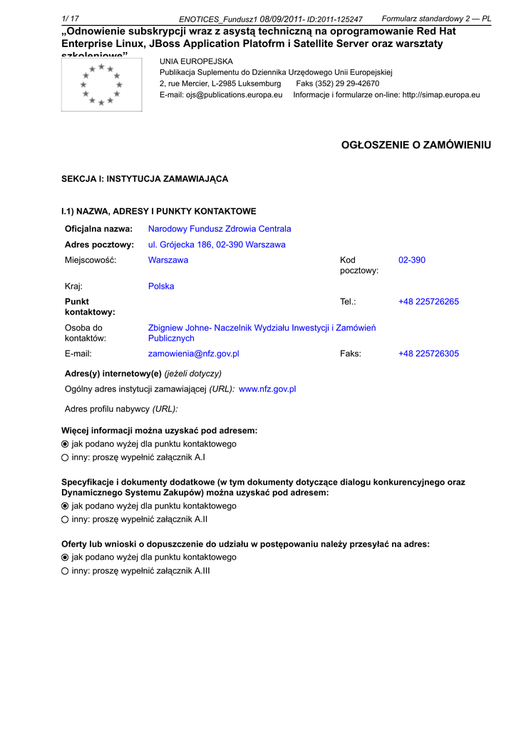ENOTICES_Fundusz1 08/09/2011- ID:2011-125247 1/ 17 Formularz standardowy 2 — PL „Odnowienie subskrypcji wraz z asystą techniczną na oprogramowanie Red Hat Enterprise Linux, JBoss Application Platofrm i Satellite Server oraz warsztaty szkoleniowe”. UNIA EUROPEJSKA Publikacja Suplementu do Dziennika Urzędowego Unii Europejskiej 2, rue Mercier, L-2985 Luksemburg Faks (352) 29 29-42670 E-mail: [email protected] Informacje i formularze on-line: http://simap.europa.eu OGŁOSZENIE O ZAMÓWIENIU SEKCJA I: INSTYTUCJA ZAMAWIAJĄCA I.1) NAZWA, ADRESY I PUNKTY KONTAKTOWE Oficjalna nazwa: Narodowy Fundusz Zdrowia Centrala Adres pocztowy: ul. Grójecka 186, 02-390 Warszawa Miejscowość: Warszawa Kraj: Polska Punkt kontaktowy: Kod pocztowy: 02-390 Tel.: +48 225726265 Osoba do kontaktów: Zbigniew Johne- Naczelnik Wydziału Inwestycji i Zamówień Publicznych E-mail: [email protected] Faks: +48 225726305 Adres(y) internetowy(e) (jeżeli dotyczy) Ogólny adres instytucji zamawiającej (URL): www.nfz.gov.pl Adres profilu nabywcy (URL): Więcej informacji można uzyskać pod adresem: jak podano wyżej dla punktu kontaktowego inny: proszę wypełnić załącznik A.I Specyfikacje i dokumenty dodatkowe (w tym dokumenty dotyczące dialogu konkurencyjnego oraz Dynamicznego Systemu Zakupów) można uzyskać pod adresem: jak podano wyżej dla punktu kontaktowego inny: proszę wypełnić załącznik A.II Oferty lub wnioski o dopuszczenie do udziału w postępowaniu należy przesyłać na adres: jak podano wyżej dla punktu kontaktowego inny: proszę wypełnić załącznik A.III ENOTICES_Fundusz1 08/09/2011- ID:2011-125247 2/ 17 Formularz standardowy 2 — PL „Odnowienie subskrypcji wraz z asystą techniczną na oprogramowanie Red Hat Enterprise Linux, JBoss Application Platofrm i Satellite Server oraz warsztaty szkoleniowe”. I.2) RODZAJ INSTYTUCJI ZAMAWIAJĄCEJ I GŁÓWNY PRZEDMIOT LUB PRZEDMIOTY DZIAŁALNOŚCI Ministerstwo lub inny organ krajowy lub federalny, w tym jednostki regionalne i lokalne Agencja/Urząd krajowy lub federalny Ogólne usługi publiczne Organ władzy regionalnej lub lokalnej Środowisko Agencja/Urząd regionalny lub lokalny Podmiot prawa publicznego Instytucja/agencja europejska lub organizacja międzynarodowa Inne (proszę określić): Obrona Porządek i bezpieczeństwo publiczne Sprawy gospodarcze i finansowe Zdrowie Budownictwo i obiekty komunalne Ochrona socjalna Rekreacja, kultura i religia Edukacja Inne (proszę określić): Instytucja zamawiająca dokonuje zakupu w imieniu innych instytucji zamawiających: tak nie ENOTICES_Fundusz1 08/09/2011- ID:2011-125247 3/ 17 Formularz standardowy 2 — PL „Odnowienie subskrypcji wraz z asystą techniczną na oprogramowanie Red Hat Enterprise Linux, JBoss Application Platofrm i Satellite Server oraz warsztaty szkoleniowe”. SEKCJA II: PRZEDMIOT ZAMÓWIENIA II.1) OPIS II.1.1) Nazwa nadana zamówieniu przez instytucję zamawiającą „Odnowienie subskrypcji wraz z asystą techniczną na oprogramowanie Red Hat Enterprise Linux, JBoss Application Platofrm i Satellite Server oraz warsztaty szkoleniowe”. II.1.2) Rodzaj zamówienia oraz lokalizacja robót budowlanych, miejsce realizacji dostawy lub świadczenia usług (Wybrać wyłącznie jedną kategorię – roboty budowlane, dostawy lub usługi – która najbardziej odpowiada konkretnemu przedmiotowi zamówienia lub zakupu) a) Roboty budowlane Wykonanie b) Dostawy Kupno Zaprojektowanie i wykonanie Dzierżawa Wykonanie, za pomocą dowolnych środków, obiektu budowlanego, odpowiadającego wymogom określonym przez instytucję zamawiającą Najem c) Usługi Kategoria usługi: nr 7 (dla usług kategorii 1-27 zob. załącznik II do dyrektywy 2004/18/ WE) Leasing Połączenie powyższych form Główne miejsce lub lokalizacja robót budowlanych Główne miejsce realizacji dostawy Główne miejsce świadczenia usług Narodowy Fundusz Zdrowia Centrala, Warszawa, ul. Grójecka 186 Kod NUTS II.1.3) Ogłoszenie dotyczy Zamówienia publicznego Zawarcia umowy ramowej Utworzenia dynamicznego systemu zakupów (DSZ) II.1.4) Informacje na temat umowy ramowej (jeżeli dotyczy) Umowa ramowa z kilkoma wykonawcami Umowa ramowa z jednym wykonawcą Liczba LUB, jeżeli dotyczy,maksymalna liczba uczestników planowanej umowy ramowej Czas trwania umowy ramowej: Okres w latach: lub miesiącach: Uzasadnienie dla umowy ramowej, której czas trwania przekracza okres czterech lat: Szacunkowa całkowita wartość zakupów w całym okresie obowiązywania umowy ramowej (jeżeli dotyczy; podać wyłącznie dane liczbowe): Szacunkowa wartość bez VAT: LUB Zakres: między Waluta: a Waluta: Częstotliwość oraz wartość zamówień, które zostaną udzielone (jeżeli możliwe do określenia):: 4/ 17 ENOTICES_Fundusz1 08/09/2011- ID:2011-125247 Formularz standardowy 2 — PL „Odnowienie subskrypcji wraz z asystą techniczną na oprogramowanie Red Hat Enterprise Linux, JBoss Application Platofrm i Satellite Server oraz warsztaty szkoleniowe”. II.1.5) Krótki opis zamówienia lub zakupu(ów) Przedmiotem zamówienia jest: Odnowienie subskrypcji dla systemu operacyjnego Red Hat Enterprise Linux dla 50 serwerów, obsługującego co najmniej 2 fizyczne procesory w serwerze wraz z bezpośrednim wsparciem producenta systemu operacyjnego przez okres minimum 1 roku z możliwością późniejszego rozszerzenia okresu wsparcia technicznego. Wsparcie producenta systemu operacyjnego musi być realizowane w trybie 7x24x365 z czasem reakcji na zgłaszane problemy do 1 godziny. Wsparcie techniczne winno być realizowane przez telefon/web/email. Odnowienie subskrypcji systemu operacyjnego Red Hat Enterprise Linux Desktop for Workstation dla 5 stacji roboczych, wraz z bezpośrednim wsparciem producenta systemu operacyjnego przez okres minimum 1 roku z możliwością późniejszego rozszerzenia okresu wsparcia technicznego. Wsparcie producenta systemu operacyjnego musi być realizowane w trybie 5x8 (pon-pt 9-17) z czasem reakcji na