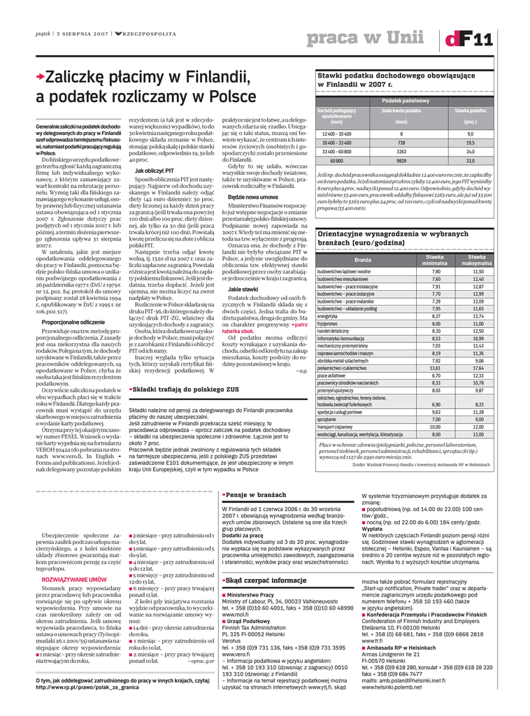 praca w Unii piątek | 3 sierpnia 2007 | ◊rzeczpospolita >Zaliczkę płacimy w Finlandii, a podatek rozliczamy w Polsce Generalnie zaliczki na podatek dochodowy delegowanych do pracy w Finlandii szef odprowadza tamtejszemu fiskusowi, natomiast podatki pracujący regulują w Polsce. Do fińskiego urzędu podatkowego trzeba zgłosić każdą zagraniczną firmę lub indywidualnego wykonawcę, z którym zamawiający zawarł kontrakt na rekrutację personelu. Wymóg taki dla fińskiego zamawiającego wykonanie usługi, osoby prawnej lub fizycznej ustanawia ustawa obowiązująca od 1 stycznia 2007 r. Zgłoszenie dotyczy prac podjętych od 1 stycznia 2007 r. lub później, a termin złożenia pierwszego zgłoszenia upływa 31 sierpnia 2007 r. W ustaleniu, jakie jest miejsce opodatkowania oddelegowanego do pracy w Finlandii, pomocna będzie polsko-fińska umowa o unikaniu podwójnego opodatkowania z 26 października 1977 r. (DzU z 1979 r. nr 12, poz. 84; protokół do umowy podpisany został 28 kwietnia 1994 r., opublikowany w DzU z 1995 r. nr 106, poz. 517). Proporcjonalne odliczenie Przewiduje ona tzw. metodę proporcjonalnego odliczenia. Z zasady jest ona niekorzystna dla naszych rodaków. Polega na tym, że dochody uzyskiwane w Finlandii, także przez pracowników oddelegowanych, są opodatkowane w Polsce, chyba że osoba taka jest fińskim rezydentem podatkowym. Oczywiście zaliczki na podatek w obu wypadkach płaci się w trakcie roku w Finlandii. Dlatego każdy pracownik musi wystąpić do urzędu skarbowego w miejscu zatrudnienia o wydanie karty podatkowej. Otrzyma przy tej okazji tymczasowy numer PESEL. Wniosek o wydanie karty wypełnia się na formularzu VEROH 5042a (do pobrania na stronach www.vero.fi, In English > Forms and publications). Jeżeli jednak delegowany pozostaje polskim rezydentem (a tak jest w zdecydowanej większości wypadków), to do 30 kwietnia następnego roku podatkowego składa zeznanie w Polsce, stosując polską skalę i polskie stawki podatkowe, odpowiednio 19, 30 lub 40 proc. Jak obliczyć PIT Sposób obliczenia PIT jest następujący. Najpierw od dochodu uzyskanego w Finlandii należy odjąć diety (42 euro dziennie): 30 proc. diety liczonej za każdy dzień pracy za granicą (jeśli trwała ona powyżej 100 dni) albo 100 proc. diety dziennej, ale tylko za 30 dni (jeśli praca trwała krócej niż 100 dni). Powstałą kwotę przelicza się na złote i oblicza polski PIT. Następnie trzeba odjąć kwotę wolną, tj. 1320 zł na 2007 r. oraz zaliczki zapłacone za granicą. Powstała różnica jest kwotą należną do zapłaty polskiemu fiskusowi. Jeśli jest dodatnia, trzeba dopłacić. Jeżeli jest ujemna, nie można liczyć na zwrot nadpłaty w Polsce. Rozliczenie w Polsce składa się na druku PIT-36, do którego należy dołączyć druk PIT-ZG, właściwy dla uzyskujących dochody z zagranicy. Osoba, która dodatkowo uzyskuje dochody w Polsce, musi połączyć je z zarobkami z Finlandii i obliczyć PIT od ich sumy. Inaczej wygląda tylko sytuacja tych, którzy uzyskali certyfikat fińskiej rezydencji podatkowej. W Stawki podatku dochodowego obowiązujące w Finlandii w 2007 r. Podatek państwowy praktyce nie jest to łatwe, a u delegowanych zdarza się rzadko. Ubiegając się o taki status, muszą oni bowiem wykazać, że centrum ich interesów życiowych (osobistych i gospodarczych) zostało przeniesione do Finlandii. Gdyby to się udało, wówczas wszystkie swoje dochody światowe, także te uzyskiwane w Polsce, pracownik rozliczałby w Finlandii. Będzie nowa umowa Ministerstwo Finansów rozpoczęło już wstępne negocjacje o zmianie przestarzałej polsko-fińskiej umowy. Podpisanie nowej zapowiada na 2007 r. Wtedy też ma zmienić się metoda na tzw. wyłączenie z progresją. Oznacza ona, że dochody z Finlandii nie byłyby obciążane PIT w Polsce, a jedynie uwzględniane do obliczenia tzw. efektywnej stawki podatkowej przez osoby zarabiające jednocześnie w kraju i za granicą. Jakie stawki Podatek dochodowy od osób fizycznych w Finlandii składa się z dwóch części. Jedna trafia do budżetu państwa, druga do gminy. Ma on charakter progresywny >patrz tabelka obok. Od podatku można odliczyć koszty wynikające z uzyskania dochodu, odsetki od kredytu na zakup mieszkania, koszty podróży do rodziny pozostawionej w kraju. —a.g. >Składki trafiają do polskiego ZUS Składki należne od pensji za delegowanego do Finlandii pracownika płacimy do naszej ubezpieczalni. Jeśli zatrudnienie w Finlandii przekracza sześć miesięcy, to pracodawca odprowadza – oprócz zaliczek na podatek dochodowy – składki na ubezpieczenia społeczne i zdrowotne. Łącznie jest to około 7 proc. Pracownik będzie jednak zwolniony z regulowania tych składek na tamtejsze ubezpieczenia, jeśli z polskiego ZUS przedstawi zaświadczenie E101 dokumentujące, że jest ubezpieczony w innym kraju Unii Europejskiej, czyli w tym wypadku w Polsce Dochód podlegający opodatkowaniu (euro) ROZWIĄZYWANIE UMÓW Stosunek pracy wypowiadany przez pracodawcę lub pracownika rozwiązuje się po upływie okresu wypowiedzenia. Przy umowie na czas nieokreślony zależy on od okresu zatrudnienia. Jeśli umowę wypowiada pracodawca, to fińska ustawa o umowach pracy (Työsopimuslaki 26.1.2001/55) ustanawia następujące okresy wypowiedzenia: ∑1 miesiąc – przy okresie zatrudnienia trwającym do roku, ∑2 miesiące – przy zatrudnieniu od 1 do 5 lat, ∑3 miesiące – przy zatrudnieniu od 5 do 9 lat, ∑ 4 miesiące – przy zatrudnieniu od 9 do 12 lat, ∑ 5 miesięcy – przy zatrudnieniu od 12 do 15 lat, ∑ 6 miesięcy – przy pracy trwającej ponad 15 lat. Z kolei gdy inicjatywa rozstania wyjdzie od pracownika, to wyczekiwanie na rozwiązanie umowy wynosi: ∑ 14 dni – przy okresie zatrudnienia do roku, ∑ 1 miesiąc – przy zatrudnieniu od roku do 10 lat, ∑ 2 miesiące – przy pracy trwającej ponad 10 lat. —oprac. g.or O tym, jak oddelegować zatrudnionego do p
