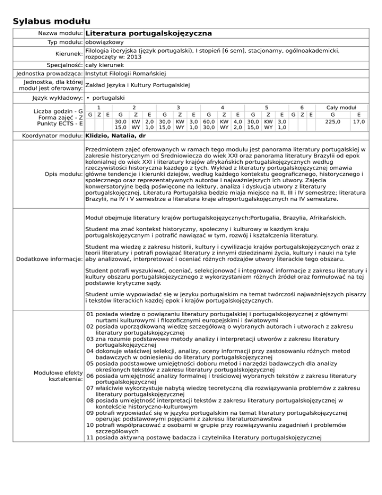 Sylabus modułu Nazwa modułu: Literatura portugalskojęzyczna Typ modułu: obowiązkowy Kierunek: Filologia iberyjska (język portugalski), I stopień [6 sem], stacjonarny, ogólnoakademicki, rozpoczęty w: 2013 Specjalność: cały kierunek Jednostka prowadząca: Instytut Filologii Romańskiej Jednostka, dla której Zakład Języka i Kultury Portugalskiej moduł jest oferowany: Język wykładowy: • portugalski 1 2 3 4 5 6 Liczba godzin - G G Z E G Z E G Z E G Z E G Z E G Z E Forma zajęć - Z 30,0 KW 2,0 30,0 KW 3,0 60,0 KW 4,0 30,0 KW 3,0 Punkty ECTS - E Cały moduł G E 225,0 17,0 15,0 WY 1,0 15,0 WY 1,0 30,0 WY 2,0 15,0 WY 1,0 Koordynator modułu: Klidzio, Natalia, dr Przedmiotem zajeć oferowanych w ramach tego modułu jest panorama literatury portugalskiej w zakresie historycznym od Średniowiecza do wiek XXI oraz panorama literatury Brazylii od epok kolonialnej do wiek XXI i literatury krajów afrykańskich portugalskojęzycznych według rzeczywistości historyczna kazdego z tych. Wykład z literatury portugalskojęzycznej omawia Opis modułu: główne tendencje i kierunki dziejów, według każdego kontekstu geograficznego, historycznego i społecznego oraz reprezentatywnych autorów i najważniejszych ich utwory. Zajęcia konwersatoryjne będą poświęcone na lektury, analiza i dyskucja utwory z literatury portugalskojęcznej, Literatura Portugalska bedzie miaja miejsce na II, III i IV semestrze; literatura Brazylii, na IV i V semestrze a literatura kraje afroportugalskojęcznych na IV semestzre. Moduł obejmuje literatury krajów portugalskojęzycznych:Portugalia, Brazylia, Afrikańskich. Student ma znać kontekst historyczny, społeczny i kulturowy w kazdym kraju portugalskojęzycznym i potrafić nawiązać w tym, rozwój i kształczenia literatury. Student ma wiedzę z zakresu historii, kultury i cywilizacje krajów portugalskojęzycznych oraz z teorii literatury i potrafi powiązać literatury z innymi dziedzinami życia, kultury i nauki na tyle Dodatkowe informacje: aby analizować, interpretować i oceniać różnych rodzajów utwory literackie tego obszaru. Student potrafi wyszukiwać, oceniać, selekcjonować i integrować informacje z zakresu literatury i kultury obszaru portugalskojezycznego z wykorzystaniem różnych żródeł oraz formułować na tej podstawie krytyczne sądy. Student umie wypowiadać się w jezyku portugalskim na temat twórczośi najważniejszych pisarzy i tekstów literackich kazdej epok i krajów portugalskojęzycznych. 01 posiada wiedzę o powiązaniu literatury portugalskiej i portugalskojęzycznej z głównymi nurtami kulturowymi i filozoficznymi europejskimi i światowymi 02 posiada uporządkowaną wiedzę szczegółową o wybranych autorach i utworach z zakresu literatury portugalskojęzycznej 03 zna rozumie podstawowe metody analizy i interpretacji utworów z zakresu literatury portugalskojęzycznej 04 dokonuje właściwej selekcji, analizy, oceny informacji przy zastosowaniu różnych metod badawczych w odniesieniu do literatury portugalskojęzycznej 05 posiada podstawowe umiejętności doboru metod i narzędzi badawczych dla analizy określonych tekstów z zakresu literatury portugalskojęzycznej Modułowe efekty 06 posiada umiejętność analizy formalnej i treściowej wybranych tekstów z zakresu literatury kształcenia: portugalskojęzycznej 07 właściwie wykorzystuje nabytą wiedzę teoretyczną dla rozwiązywania problemów z zakresu literatury portugalskojęzycznej 08 posiada umiejętność interpretacji tekstów z zakresu literatury portugalskojęzycznej w kontekście historyczno-kulturowym 09 potrafi wypowiadać się w języku portugalskim na temat literatury portugalskojęzycznej operując podstawowymi pojęciami z zakresu literaturoznawstwa 10 potrafi współpracować z osobami w grupie przy rozwiązywaniu zagadnień i problemów szczegółowych 11 posiada aktywną postawę badacza i czytelnika literatury portugalskojęzycznej