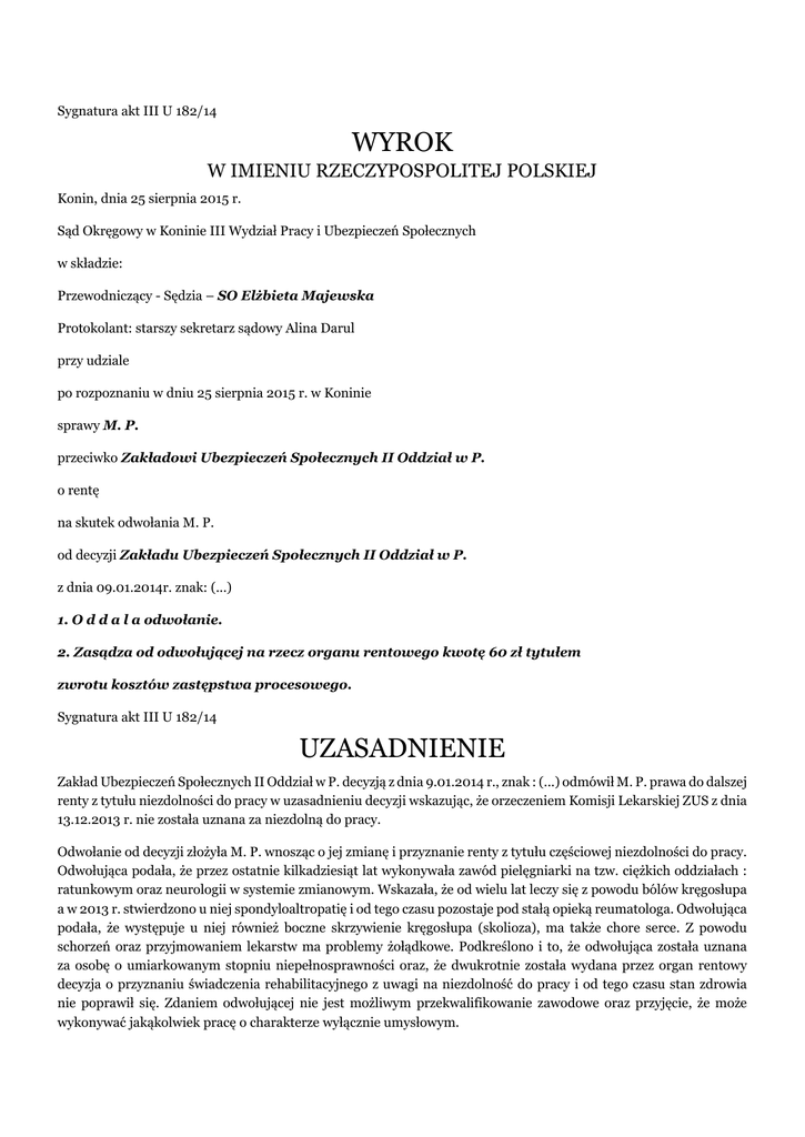 Sygnatura akt III U 182/14 WYROK W IMIENIU RZECZYPOSPOLITEJ POLSKIEJ Konin, dnia 25 sierpnia 2015 r. Sąd Okręgowy w Koninie III Wydział Pracy i Ubezpieczeń Społecznych w składzie: Przewodniczący - Sędzia – SO Elżbieta Majewska Protokolant: starszy sekretarz sądowy Alina Darul przy udziale po rozpoznaniu w dniu 25 sierpnia 2015 r. w Koninie sprawy M. P. przeciwko Zakładowi Ubezpieczeń Społecznych II Oddział w P. o rentę na skutek odwołania M. P. od decyzji Zakładu Ubezpieczeń Społecznych II Oddział w P. z dnia 09.01.2014r. znak: (...) 1. O d d a l a odwołanie. 2. Zasądza od odwołującej na rzecz organu rentowego kwotę 60 zł tytułem zwrotu kosztów zastępstwa procesowego. Sygnatura akt III U 182/14 UZASADNIENIE Zakład Ubezpieczeń Społecznych II Oddział w P. decyzją z dnia 9.01.2014 r., znak : (...) odmówił M. P. prawa do dalszej renty z tytułu niezdolności do pracy w uzasadnieniu decyzji wskazując, że orzeczeniem Komisji Lekarskiej ZUS z dnia 13.12.2013 r. nie została uznana za niezdolną do pracy. Odwołanie od decyzji złożyła M. P. wnosząc o jej zmianę i przyznanie renty z tytułu częściowej niezdolności do pracy. Odwołująca podała, że przez ostatnie kilkadziesiąt lat wykonywała zawód pielęgniarki na tzw. ciężkich oddziałach : ratunkowym oraz neurologii w systemie zmianowym. Wskazała, że od wielu lat leczy się z powodu bólów kręgosłupa a w 2013 r. stwierdzono u niej spondyloaltropatię i od tego czasu pozostaje pod stałą opieką reumatologa. Odwołująca podała, że występuje u niej również boczne skrzywienie kręgosłupa (skolioza), ma także chore serce. Z powodu schorzeń oraz przyjmowaniem lekarstw ma problemy żołądkowe. Podkreślono i to, że odwołująca została uznana za osobę o umiarkowanym stopniu niepełnosprawności oraz, że dwukrotnie została wydana przez organ rentowy decyzja o przyznaniu świadczenia rehabilitacyjnego z uwagi na niezdolność do pracy i od tego czasu stan zdrowia nie poprawił się. Zdaniem odwołującej nie jest możliwym przekwalifikowanie zawodowe oraz przyjęcie, że może wykonywać jakąkolwiek pracę o charakterze wyłącznie umysłowym. W odpowiedzi na odwołanie organ rentowy wniósł o oddalenie odwołania oraz zasądzenie kosztów zastępstwa procesowego według norm przepisanych, w uzasadnieniu podtrzymując argumentację zawartą w zaskarżonej decyzji. Sąd ustalił i zważył, co następuje : M. P. urodziła się (...) Odwołująca pracowała jako pielęgniarka, ostatnio od 1987 r. w (...) w K.. W 2012 r. przed organem rentowym odwołująca ubiegała się o przyznanie prawa do renty z tytułu niezdolności do pracy i otrzymała decyzję odmowną, jednakże w toku tego postępowania w związku z rokowaniem odzyskania zdolności do pracy istniały okoliczności uzasadniające przyznanie odwołującej prawa do świadczenia rehabilitacyjnego na okres najpierw 3 miesięcy, a następnie 9 miesięcy tj. do dnia 17.11.2013 r. Odwołująca z powodu rozpoznania przez lekarza orzecznika ZUS zwyrodnienia kręgosłupa szyjnego z przewlekłym zespołem bólowym przebywała w sanatorium uzdrowiskowym w U. w okresie od 26.01.2013 r. do 18.02.2013 r. W ośrodku została rozpoznana u odwołującej spondyloartopatia zapalna z zajęciem stawów krzyżowo – biodrowych i obwodowych, zaawansowana choroba zwyrodnieniowa kręgosłupa z objawami lewostronnej rwy barkowej i lewostronnej rwy kulszowej. Dodatkowo rozpoznano zespół niewydolności zatoki tt. szyjnych objawowy – stan po wszczepieniu stymulatora oraz astmę oskrzelową. Orzeczeniem (...) w K. z dnia 17.10.2012 r. M. P. została zaliczona do umiarkowanego stopnia niepełnosprawności z ustalonym stopnień niepełnosprawności od dnia 18.09.2012 r. W dniu 8.10.2013 r. M. P. zgłosiła do organu rentowego wniosek o przyznanie renty z tytułu niezdolności do pracy. Orzeczeniem lekarza orzecznika ZUS z dnia 31.10.2013 r. odwołująca nie została uznana za osobę niezdolną do pracy. W związku z wniesieniem sprzeciwu Komisja Lekarska ZUS orzeczeniem z dnia 13.12.2013 r. również nie uznała jej za osobę niezdolną do pracy. W oparciu o powyższe organ rentowy zaskarżoną decyzją odmówił M. P. prawa do renty z tytułu niezdolności do pracy. W toku postępowania Sąd w oparciu o treść przepisu art. 278 k.p.c. przeprowadził dowód ze wspólnej opinii biegłego ortopedy, kardiologa oraz reumatologa na okoliczność ustalenia, czy odwołująca jest niezdolna do pracy, od kiedy, w jakim stopniu i na jaki okres. We wspólnej opinii biegli z okręgu Sądu Okręgowego w Kaliszu : reumatolog T. R. – G., ortopeda K. S. oraz kardiolog M. D. rozpoznali u odwołującej początkowe zmiany zwyrodnieniowe kręgosłupa lędźwiowo – krzyżowego, stan po implantacji stymulatora serca i repozycji elektrody w 2012 r. z prawidłową pracą stymulatora. Do dalszej diagnostyki uznano obserwację w kierunku zapalenia stawów krzyżowo – biodrowych. Biegli wskazali, że odwołująca jest osobą zdolną do pracy, gdyż z powodu początkowych zmian zwyrodnieniowych kręgosłupa występuje u odwołującej zespół bólowy, który może być leczony w ramach krótkotrwałych zwolnień lekarskich. Wymagające dalszej diagnostyki zmiany radiologiczne w stawach krzyżowo – biodrowych aktualnie nie rodzą skutków orzeczniczych. Zwrócono również uwagę na prawidłową pracę wszczepionego stymulatora serca. Z powyższą opinią nie zgodziła się odwołująca, która wniosła o przeprowadzenie uzupełniającej opinii poprzez udzielenie przez biegłych odpowiedzi na pytania zawarte w piśmie procesowym z dnia 25.06.2014 r. Wniesiono również o przeprowadzenie dowodu z opinii biegłego z medycyny pracy na okoliczność tego czy stwierdzone u odwołującej schorzenia pozwalają wykonywać przez nią pracę w charakterze pielęgniarki. W uzupełniającej opinii biegli udzielili odpowiedzi na zadane pytania, a Sąd w uwzględnieniu zgłoszoneg