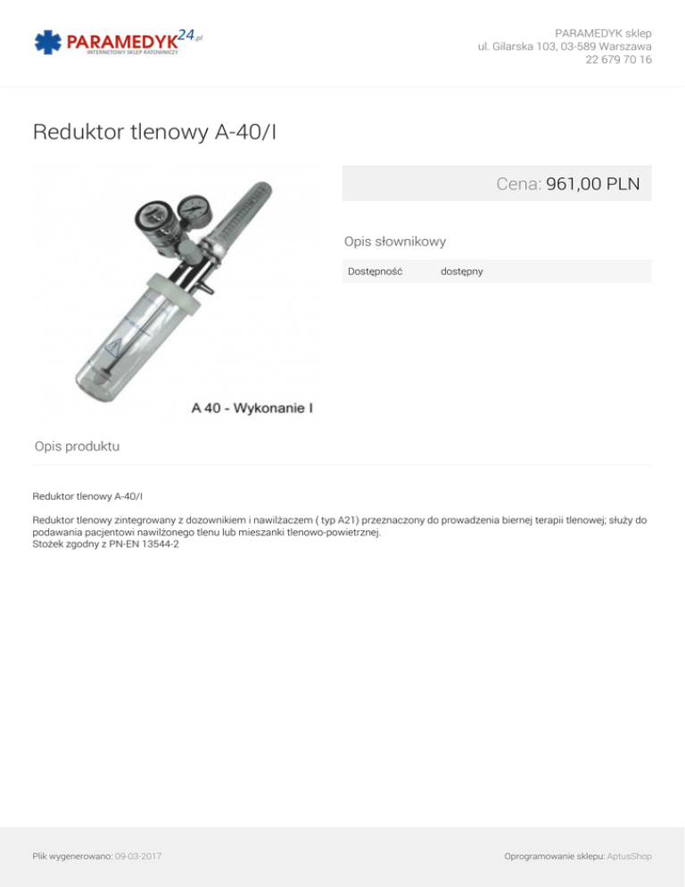 PARAMEDYK sklep ul. Gilarska 103, 03-589 Warszawa 22 679 70 16 Reduktor tlenowy A-40/I Cena: 961,00 PLN Opis słownikowy Dostępność dostępny Opis produktu Reduktor tlenowy A-40/I Reduktor tlenowy zintegrowany z dozownikiem i nawilżaczem ( typ A21) przeznaczony do prowadzenia biernej terapii tlenowej; służy do podawania pacjentowi nawilżonego tlenu lub mieszanki tlenowo-powietrznej. Stożek zgodny z PN-EN 13544-2 Plik wygenerowano: 09-03-2017 Powered by TCPDF (www.tcpdf.org) Oprogramowanie sklepu: AptusShop
