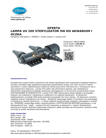 PitoszPiotr Adamczyk Pszczelińska 102 05-805 Otrębusy tel. +48 790 354 038 tel. +48 501 858 218 Zapraszamy do sklepu www.pitosz.pl OFERTA LAMPA UV 209 STERYLIZATOR 9W DO AKWARIUM I OCZKA kategoria: Narzędzia > OGRÓD > Oczko wodne > Lampy UVC Producent: WESTLANDS Cena brutto: 125,00 zł Cena netto: 101,63 zł Kod QR: CHARAKTERYSTYKA: Krystalicznie czysta woda w akwarium lub stawie ogrodowym jest marzeniem każdego hodowcy ryb.Aby umożliwić jego spełnienie proponuję zastosowanie lampy CUV-136 .Są one w stanie wychwycić z wody najdrobniejsze widoczne zanieczyszczenia mechaniczne z unoszącymi się w niej zawiesinami włącznie. Lampa CUV pełni rolę eliminatora glonów, jest niezbędnym elementem wyposażenia każdego akwarysty pomagającym w utrzymaniu przejrzystości wody. ZASTOSOWANIE W AKWARYSTYCE Lampa CUV 36W nieocenione usługi oddaje w przypadku hodowli ryb wrażliwych i delikatnych, podatnych na infekcje bakteryjne. W akwarium słodkowodnym na każde 100l wody powinien przypadać 5w mocy lampy. W akwarium morskim najlepiej wybrać największą moc lampy. Wydatnie wspomaga walkę z chorobami ryb,pozwalając w bezpieczny sposób ograniczyć , a nawet zupełnie wyeliminować potegony pływające w wodzie np: MORSKIEJ -wspomaga walkę z pierwotniakiem CRYPTOCARYON IRRITANS powodujący u ryb słonowodnych tzw. "ospę". Lampa CUV jest wskazana w akwariach z rybami drapieżnymi , karmionymi dużymi ilościami pokarmów mięsnych, gdzie pomaga wq utrzymaniu czystości wody chroniąc je przed zakwitami pierwotniaków. DANE TECHNICZNE: Pobór mocy : 12 Moc Lampy : 9W Żywotność około : 6000h Maksymalna pojemność zbiornika : 80.000L Max Ciśnienie : 0,3 BAR Max Przepływ : 1500 L/h strona: 1/2 wydrukowano: 09-03-2017 http://www.pitosz.pl/lampa-uv-209-sterylizator-9w-do-akwarium-i-oczka.html Średnica Krućców : 3/4''-1,5'' Długość : 490mm Napięcie : 230V Waga netto : 2,7kg strona: 2/2 wydrukowano: 09-03-2017 http://www.pitosz.pl/lampa-uv-209-sterylizator-9w-do-akwarium-i-oczka.html