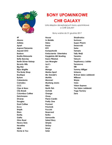 BONY UPOMINKOWE CHR GALAXY Lista sklepów akceptujących bony upominkowe w CHR GALAXY Bony ważne do 31 grudnia 2017 4F Abono Adidas Apart Asprod Piekarnia Aquael ZOO Badura Basilia Ristorante Betty Barclay Berlin Döner Kebap Beverly Hills Big Star Bijou Brigitte The Body Shop Boutique Bytom Calzedonia Camaieu CCC Cipo & Baxx City Break Columbus Coffee Deichmann Diverse Douglas Duet Coffee Ecco Empik Etam Esotiq Gatta Gino Rossi Heavy Duty Hexeline H&M Home & You House In Mobilo Itaka Kazar KFC Komputronik Kwiaciarnia Orientalna Kręgielnia MK Bowling Ksero Plikdruk Lee Wrangler Levi’s LKJ Mango Martes Sport Mc Donald’s Mohito Monnari Mustang Jeans Nike North Fish Ochnik Orange Orsay Pierre Cardin Pretty One Promod Próchnik Puccini Reserved Ryłko Samsonite Salad Story Simple SinSay Smyk Solar Stradivarius SunLoox Super-Pharm Swarovski Swiss Tamaris Tally Weijl Taranko Tatuum Terpiłowscy Jubiler Terranova Tiffi Tommy Hilfiger Unisono W.Kruk Salon Jubilerski Willsoor Wojas Vans Vision Express Yes Salon Jubilerski Yogo Factory Zara