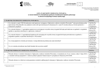 Załącznik nr 2 do Uchwały 138/1706/2016 Zarządu Województwa Podlaskiego z dnia 24 maja 2016r. LISTA WARUNKÓW UDZIELENIA WSPARCIA w ramach działania 9.1 Rewitalizacja społeczna i kształtowanie kapitału społecznego w zakresie Europejskiego Funduszu Społecznego 1. WARUNKI TECHNICZNE UDZIELENIA WSPARCIA: 1 Czy wniosek w części VIII Oświadczenia został opatrzony wymaganą w Ogłoszeniu o naborze wniosków/Wezwaniu127 pieczęcią (imienną osoby uprawnionej i/lub jednostki) oraz podpisem osoby/osób upoważnionej/ych wskazanej/ych w części II wniosku (dotyczy również partnerów i realizatorów projektu)? 2 Czy wniosek złożono w 1 egzemplarzu papierowym zawierającym wszystkie strony (oryginał lub kopia poświadczona za zgodność z oryginałem zgodnie ze sposobem określonym w ogłoszeniu o naborze)? 3 Czy wniosek złożono w 2 egzemplarzach papierowych zawierających wszystkie strony (oryginał lub kopia poświadczona za zgodność z oryginałem zgodnie ze sposobem określonym w Wezwaniu)? 4 Czy wersja papierowa wniosku jest tożsama z wersją elektroniczną (identyczna suma kontrolna)? 5 Czy we wniosku stwierdzono inne braki formalne lub oczywiste omyłki? 2. WARUNKI FORMALNE UDZIELENIA WSPARCIA: 1 Wniosek złożono w terminie wskazanym w Ogłoszeniu o naborze wniosków/Wezwaniu, w rozumieniu art. 41 ust. 2 ustawy z dnia 11 lipca 2014 r. o zasadach realizacji programów w zakresie polityki spójności finansowanych w perspektywie finansowej 2014-2020. 2 Wniosek złożono we właściwej wersji generatora wniosków aplikacyjnych wskazanej w Ogłoszeniu o naborze wniosków/Wezwaniu. 127 OCENA Tak/Nie/Nie dotyczy/Do Uzupełnienia Tak/Nie/Nie dotyczy/Do Uzupełnienia Tak/Nie/Nie dotyczy/Do Uzupełnienia Tak/Nie/Nie dotyczy/Do Uzupełnienia Tak/Nie/Nie dotyczy/Do Uzupełnienia OCENA Tak/Nie/Nie dotyczy/Do Uzupełnienia Tak/Nie/Nie dotyczy/Do Uzupełnienia Niepotrzebne skreślić. 1 3 Okres realizacji projektu jest zgodny z Ogłoszeniem o naborze wniosków/Wezwaniu. Tak/Nie/Nie dotyczy/Do Uzupełnienia 4 Projekt o wartości nieprzekraczającej wyrażonej w PLN równowartości kwoty 100 000 EUR wkładu publicznego128 jest rozliczany uproszczonymi metodami, o których mowa w Wytycznych w zakresie kwalifikowalności wydatków w ramach Europejskiego Funduszu Rozwoju Regionalnego, Europejskiego Funduszu Społecznego oraz Funduszu Spójności na lata 2014-2020, a projekt o wartości przekraczającej 100 000 EUR wkładu publicznego129 - na podstawie rzeczywiście poniesionych wydatków. Tak/Nie/Nie dotyczy/Do Uzupełnienia 5 Udział wkładu własnego jest zgodny z ogłoszeniem o naborze wniosków/wezwaniem. 6 Poziom kosztów pośrednich rozliczanych ryczałtem jest zgodny z Wytycznymi w zakresie kwalifikowalności wydatków w ramach Europejskiego Funduszu Rozwoju Regionalnego, Europejskiego Funduszu Społecznego oraz Funduszu Spójności na lata 2014-2020. 7 8 9 10 Wnioskodawca oraz partnerzy (o ile dotyczy) nie podlegają wykluczeniu z możliwości otrzymania dofinansowania, w tym wykluczeniu, o którym mowa w: - art. 207 ust. 4 ustawy z dnia 27 sierpnia 2009 r. o finansach publicznych. - art. 12 ust. 1 pkt 1 ustawy z dnia 15 czerwca 2012 r. o skutkach powierzania wykonywania pracy cudzoziemcom przebywającym wbrew przepisom na terytorium Rzeczypospolitej Polskiej (Dz. U. poz. 769); - art. 9 ust. 1 pkt 2a ustawy z dnia 28 października 2002 r. o odpowiedzialności podmiotów zbiorowych za czyny zabronione pod groźbą kary (t. j. Dz. U. 2014 r. poz. 1417). Wnioskodawca, zgodnie z Regionalnym Programem Operacyjnym Województwa Podlaskiego na lata 2014-2020 oraz ze Szczegółowym Opisem Osi Priorytetowych RPOWP, jest podmiotem uprawnionym do ubiegania się o dofinansowanie w ramach właściwego typu operacji w ramach Działania 9.1 RPOWP. W przypadku projektu partnerskiego spełnione zostały wymogi dotyczące: 1) wyboru partnerów spoza sektora finansów publicznych, o których mowa w art. 33 ust. 2-4 ustawy o zasadach realizacji programów w zakresie polityki spójności finansowanych w perspektywie 2014-2020 (o ile dotyczy) oraz 2) braku powiązań, o których mowa w art. 33 ust. 6 ustawy o zasadach realizacji programów w zakresie polityki spójności finansowanych w perspektywie 2014-2020 oraz w Szczegółowym Opisie Osi Priorytetowych RPOWP, pomiędzy podmiotami tworzącymi partnerstwo. Wnioskodawca oraz partnerzy krajowi130 (o ile dotyczy), ponoszący wydatki w danym projekcie, posiadają łączny obrót za ostatni zatwierdzony rok obrotowy zgodnie z ustawą z dnia 29 września 1994 r. o rachunkowości (Dz. U. z 2013 r. poz. 330, z późn. zm.) (jeśli dotyczy) lub za ostatni zamknięty i zatwierdzony rok kalendarzowy równy lub wyższy od łącznych rocznych wydatków w ocenianym projekcie131. Tak/Nie/Nie dotyczy/Do Uzupełnienia Tak/Nie/Nie dotyczy/Do Uzupełnienia Tak/Nie/Nie dotyczy/Do Uzupełnienia Tak/Nie/Nie dotyczy/Do Uzupełnienia Tak/Nie/Nie dotyczy/Do Uzupełnienia Tak/Nie/Nie dotyczy/Do Uzupełnienia Do przeliczenia ww. kwoty na PLN należy stosować miesięczny obrachunkowy kurs wymiany stosowany przez KE aktualny na dzień ogłoszenia konkursu. Do przeliczenia ww. kwoty na PLN należy stosować miesięczny obrachunkowy kurs wymiany stosowany przez KE aktualny na dzień ogłoszenia konkursu. 130 W przypadku podmiotów niebędących jednostkami sektora finansów publicznych jako obroty należy rozumieć wartość przychodów (w tym przychodów osiągniętych z tytułu otrzymanego dofinansowania na realizację projektów) osiągniętych w ostatnim zatwierdzonym roku przez danego wnioskodawcę/ partnera (o ile dotyczy) na dzień składania wniosku o dofinansowanie. Kryterium nie dotyczy jednostek sektora finansów publicznych. W przypadku realizacji 2 128 129 11 Projekt jest skierowany do grup docelowych (zgodnie z katalogiem grup docelowych dla danego typu operacji w ramach Działania 9.1 RPOWP) z obszaru danej Lokalnej Grupy Działania (w przypadku osób fizycznych