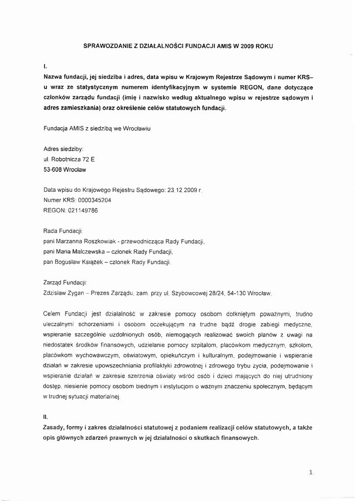 sPRAWozDANlE z DzlAŁALNoŚcl FUNDACJl AMls w 2oo9 RoKU t. NaŻwa fundacji, iej siedziba i adres, data wpisu w Krajowyth Rejest.ze sądowym i numer KRs_ u wraz ze statystycznym numerem adentyfikacyjnym w systemie REGoN, dane dotyczące czlonków zażądu fundacii (imię inazwisko według aktualnego wpisu w rejestŻe sądowym i adres zamiesŻkania) olaz określenie celów statutowych lundacji. Fundacja AIIls z siedŻibą we Wrocławiu Adres siedziby: Ul RobotnicŻa 72 E 53$08 Wroclaw Data wpisu do Krajowego Rejestru sądowego: 23 12 2009 r Numer KRS 0000345204 REGONT 021149786 Rada Fundacji paniMarzanna Roszkowrak _ prŻewodnicząca Rady Fundacj] pani Maria Malczewska _ członek Rady Fundacji, pan Boguslaw Kslążek - członek Rady Fundacji zarząd Fundac]l: zdzjs]aw zygan PreŻes zarządu zań pŻy U| sŻybowcowej 28/24 54-130 Wrocław celem Fundac]i jest dzialalnośc w zakrese pomocy osobom dotkniętym powaŹnyml' |rudno ueczalnymi schorŻeniami iosobom oczekującym na trudne bądż drogle zabregi medyczne' wspieranie szczególnie uzdolnonych osób' niemogących realizowac swoich planów z Uwagl na niedostatek środkóW finansowych' udzielanie pomocy szpitalom, placóWkom medycznym szkolom, placóWkom Wychowawczym' oświaiowym' opiekuńcŻym i kulturalnym' pode]mowanle lwsp€ranle clŻiałań w zakresle upowszechniania profilaktyki zdrowotnel izdrowego trybu zycia' podejmowanle i Wspieranie dz]ałań W zakresie sŻerzenla oświaty wśrÓd osób idzieci rnających do niej utrLJdnlony dostęp niesienie pomocy osobom blednym llnstytuc]om o Ważnym znaczeniu społecznym' będącym w trudnej sytuacji materjalnel [. zasady, formy i zakres działalnościstatutowej z podaniem realizacji celów statutowych, a także opis głównych zdażeń prawnych w jej działalnościo skutkach finansowych' Fundacja realizuje swój cel poprzez] 1 2 3 4 5 6 7 8 9 organizowanje i i finansowanie zakupu podstawowego specjalistycznego spżętu medycznego' rehabilitacyjnego lub spońowego' wyposaŹanie placóWek' ośrodków i instytucji W sprzęt medyczny' rehabilitacyjny lub sportowy' organizowanie i finansowanie zabiegóW medycznych' kuracji i zabiegów rehabilitacyjnych w ośrodkach i placówkach po]skich i zagranicznych' pomoc finansowąi Żeczową' organizowanie ifinansowanie imprez sportowych, rekreacyjnych i kulturalnych prowadzenie akcji szkoleniowych i informacyjnych, fundowaniestypendióW' organizowanie afinansowanie kolonii iWyciecŻek dla dzieci i młodzieży' finansowanie i realizację inwestycji polegających w szczególności na budowie' remontach lub modernizacjach placówek slużby zdrowia' p]acóWek medycznych lub rehabjlitacyjnych W 2009 roku Fundacja: 1 2 3 została ustanowaona aktem notarialnym z dnia 15 05 2009 loku Zawarła umowę podnajmu w dniu 26 08 2009 roku W dniu 12 10 2009 roku ztożyła wniosek o rejestrację W Krajowym Rejestrze sądowym Wraz ze zgłoszeniem 4 identyfikacyjnym NlP-2 oraz Wnioskiem o wpis do Kąowego Rejestru Urzędowego PodmiotÓw Gospodarki Narodowej zoslala wpisana do Krajowego Rejestru sądowego postanoMenlem sądu Rejonowego dla Wrocławia-Fabrycznej We Wlocławiu z dnia 23 12 2009 roku t. lnfo.macja o plowadzonej działalnościgospodarczej wedłUg wpisu do lejestru peedsiębiorców Krajowego Rejestf! sądowego Fundacja AMls ma prawo prowadzenia dziala|noŚci gospodarczej w zakresie: 1 2 3 4 5 6 7 8 I poligrafia i reptodukcja zapasanych noŚników informacji produkcja gier i zabawek, maskotek z logo Fundacji, spżedaż deta]iczna gier a zabawek prowadzona logo Fundacji, spŻedaż detalaczna wyrobów zw|ązanych W Wyspecjalizowanych sklepach' maskotek z z kulturą i rekreacją prowadzona w wyspecjalizowanych sklepach, sprŻedaŻ detaliczna odzieŻy ' spŻedaŻ detaliczna na straganach i targowiskach' polegająca na spżedaży maskotek z logo Fundacji, działalnośćwydawnicza' wynajemizarządzanienleruchomoścjamiw]asnymi|ubdzleżawionymi, reklama, 10 1'l. działalnoŚć W zakresie nagrań dŹwiękowych i muzycznych' pozostałe formy udzielania kredytów' w zakresie jakim nie zostato zastazeŻone dla dzia]alnoŚci banków' 12 13 14 15 WypoŻyczanieidzieżawaspżętulekreacyjnegoispoltowego, działalnośćzwiązana z grami losowymi i zakładami wzajemnymi, pozostałą działalnośczwiązana ze spońem' pozostała dŻiałalnoŚć rozrywkowa gdzie indziej nie sklasyfikowana; imprezy d|a dzieci i dofosłych' polegająca na organizowaniu imprez' koncertów' konkursów W roku 2009 Fundacja nie prowadziła działalnościgospodarczej odpisy uchwał za.ządu fundacji W okresie sprawozdawczym Rada Fundacji i zażąd Fundacjl nie podejmowały uchwał lnformacia o wysokości uzyskanych plzychodów, z wyodrębnieniem ich źródeł(np. spadek' zapis, darowizna, środki pochodzące ze źlódeł publicznych, w tym z budźetu państwa i budżetu gminy), odpłatnych świadczeńrealizowanych plzez fundację w ramach celów statutowych z uwzględnieniem kosztów tych świadczeń; jeżeli prowadzono dziatalność gospodarczą' wynik finansowy tei działalnościoaaz procentowy stosunek przychodu osiągniętego z działalnościgospodarczej do plzychodu osiągniętego z pozostałych źródeł. Dochody w oklesie sprawozdawczym wyniosły 0'- zł W tym: a) b) c) darowiznv od osób frzycznych] 0'00 zł' darowizny od osób prawnych: 0 00 zł' darowizny i wpłaty na dŻiałalnośćstatutową oddatną: 0'00 zl odplatne śWiadczeniarealizowane przez Fundację w lamach celóW statutowych: nie dotyczy DziałalnoŚć gospodarcza W 2009 roku przyniosła dochód/ stratę W Wysokości: nle dotyczy Procentowy udział przychodu z działalnościgospodarczej do przychodu osiągniętego z pozosta]ych żńdelI nie dotyczy lnfolmacja o poniesionych kosztach na realizację celów śtatutowych, administ.acię (czynsze, opłaty telefoniczne, pocztowe itp.), dŻiałalnośćgospodarczą, pozostałe koszty. Koszty działalnościstatutowej w 2009 r wynios]y 0'00 Żl W tym: Koszty dŻiałalnościgospodarczej w 2009 