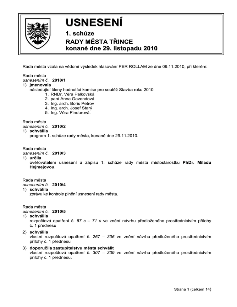 USNESENÍ 1. schůze RADY MĚSTA TŘINCE konané dne 29. listopadu 2010 Rada města vzala na vědomí výsledek hlasování PER ROLLAM ze dne 09.11.2010, při kterém: Rada města usnesením č. 2010/1 1) jmenovala následující členy hodnotící komise pro soutěž Stavba roku 2010: 1. RNDr. Věra Palkovská 2. paní Anna Gavendová 3. Ing. arch. Boris Petrov 4. Ing. arch. Josef Starý 5. Ing. Věra Pindurová. Rada města usnesením č. 2010/2 1) schválila program 1. schůze rady města, konané dne 29.11.2010. Rada města usnesením č. 2010/3 1) určila ověřovatelem usnesení a zápisu 1. schůze rady města místostarostku PhDr. Miladu Hejmejovou. Rada města usnesením č. 2010/4 1) schválila zprávu ke kontrole plnění usnesení rady města. Rada města usnesením č. 2010/5 1) schválila rozpočtová opatření č. 57 s – 71 s ve znění návrhu předloženého prostřednictvím přílohy č. 1 přednesu 2) schválila vlastní rozpočtová opatření č. 267 – 306 ve znění návrhu předloženého prostřednictvím přílohy č. 1 přednesu 3) doporučila zastupitelstvu města schválit vlastní rozpočtová opatření č. 307 – 339 ve znění návrhu předloženého prostřednictvím přílohy č. 1 přednesu. Strana 1 (celkem 14) Rada města usnesením č. 2010/6 1) doporučila zastupitelstvu města pověřit radu města provedením posledních úprav rozpočtu města na rok 2010, které budou projednány radou města v období od posledního zasedání zastupitelstva města v roce 2010 do 31.12.2010 včetně. Rada města usnesením č. 2010/7 1) doporučila zastupitelstvu města schválit předložený rozpočtový výhled města Třince na rok 2012 – 2013 ve znění návrhu předloženého prostřednictvím přílohy č. 1 přednesu 2) doporučila zastupitelstvu města schválit rozpočet města Třince na rok 2011 ve výši 793.160.000 Kč příjmů, 804.831.000 Kč výdajů a 11.671.000 Kč financování ve znění návrhu předloženého prostřednictvím přílohy č. 1 přednesu upraveného dle připomínek členů rady města specifikovaných v příloze č. 2 3) doporučila zastupitelstvu města schválit poskytnutí půjček ze Sociálního fondu pro rok 2011 v celkové výši 800.000 Kč 4) doporučila zastupitelstvu města schválit poskytnutí půjček z Fondu rozvoje bydlení pro rok 2011 v celkové výši 2.000.000 Kč 5) doporučila zastupitelstvu města schválit příspěvky na provoz pro příspěvkové organizace města na rok 2011 ve znění návrhu předloženého prostřednictvím přílohy č. 1 přednesu. Rada města usnesením č. 2010/8 1) doporučila zastupitelstvu města stanovit radě města pro rok 2011 provádění a) všech rozpočtových opatření týkajících se přijetí dotací ze státního rozpočtu, Národního fondu, prostředků Evropské unie, státních fondů, rozpočtů územních samosprávných celků a ostatních rozpočtů a jejich použití b) všech rozpočtových opatření týkajících se přijetí daňových příjmů, peněžních příspěvků, darů, pojistných náhrad a jejich použití c) ostatních rozpočtových opatření do úhrnné výše 20% schváleného rozpočtu vlastních příjmů na rok 2011 d) stanovení a úprav závazných ukazatelů příspěvkových organizací města v rozsahu bodu a) až c) s tím, že přehled všech provedených rozpočtových opatření bude vždy předložen nejbližšímu následujícímu zasedání zastupitelstva města. Rada města usnesením č. 2010/9 1) rozhodla uzavřít smlouvu o dílo č. 2010/02/142/No na provedení prací „Terénní úpravy na ul. Lidická v Třinci“ mezi městem Třinec a zhotovitelem Nehlsen Třinec, s. r. o., Jablunkovská 392, Třinec, IČ 253 55 996, ve znění návrhu předloženého prostřednictvím přílohy č. 1 přednesu. Strana 2 (celkem 14) Rada města usnesením č. 2010/10 1) rozhodla o rozšíření rozsahu díla stavby „Chodník ul. Hraniční - nemocnice“ 2) rozhodla o navýšení ceny díla stavby „Chodník ul. Hraniční - nemocnice“ o částku 89.490 Kč (včetně DPH), částka bude kryta z rozpočtu odboru investic 3) rozhodla uzavřít dodatek č. 1 ke smlouvě o dílo č. 2010/02/0073/No ze dne 15.06.2010 na stavbu „Chodník ul. Hraniční - nemocnice“ s dodavatelskou firmou L. GREKO, s. r. o., Konská 468, Třinec, IČ 476 79 352 ve znění návrhu předloženého prostřednictvím přílohy č. 1 přednesu. Rada města usnesením č. 2010/11 1) rozhodla uzavřít Darovací smlouvu č. 2010/01/021/Ga mezi městem Třinec a Moravskoslezským krajem, se sídlem 28. října 117, 702 18 Ostrava, IČ 708 90 692, na základě které město přijímá peněžitý dar ve výši 25.000 Kč v rámci projektu „Intenzifikace odděleného sběru a využívání vytříděných složek komunálního odpadu včetně jeho obalové složky v Moravskoslezském kraji“, a to ve znění návrhu předloženého prostřednictvím přílohy č. 1 přednesu. Rada města usnesením č. 2010/12 1) schválila tyto dodatky ke smlouvám na údržbu veřejné zeleně města Třince: Dodatek č. 14 ke smlouvě č. 2002/01/008 ze dne 25.01.2002 pro sektor č. 1 uzavřené mezi městem a UPG, s.r.o., Jablunkovská 407, 739 61 Třinec, IČ 253 66 807 Dodatek č. 16 ke smlouvě č. 2002/01/009 ze dne 25.01.2002 pro sektor č. 2 uzavřené mezi městem a Ing. Zuzanou Klusovou, Lidická 661, 739 61 Třinec, IČ 465 40 393 Dodatek č. 17 ke smlouvě č. 2002/01/010 ze dne 25.01.2002 pro sektor č. 3 uzavřené mezi městem a Ing. Zuzanou Klusovou, Lidická 661, 739 61 Třinec, IČ 465 40 393 Dodatek č. 12 ke smlouvě č. 2002/01/011 ze dne 25.01.2002 pro sektor č. 4 uzavřené mezi městem a Petrem Dudkem, Bezručova 474, 739 61 Třinec, IČ 623 48 876 Dodatek č. 15 ke smlouvě č. 2002/01/012 ze dne 25.01.2002 pro sektor č. 5 uzavřené mezi městem a Ing. Zuzanou Klusovou, Lidická 661, 739 61 Třinec, IČ 465 40 393 D