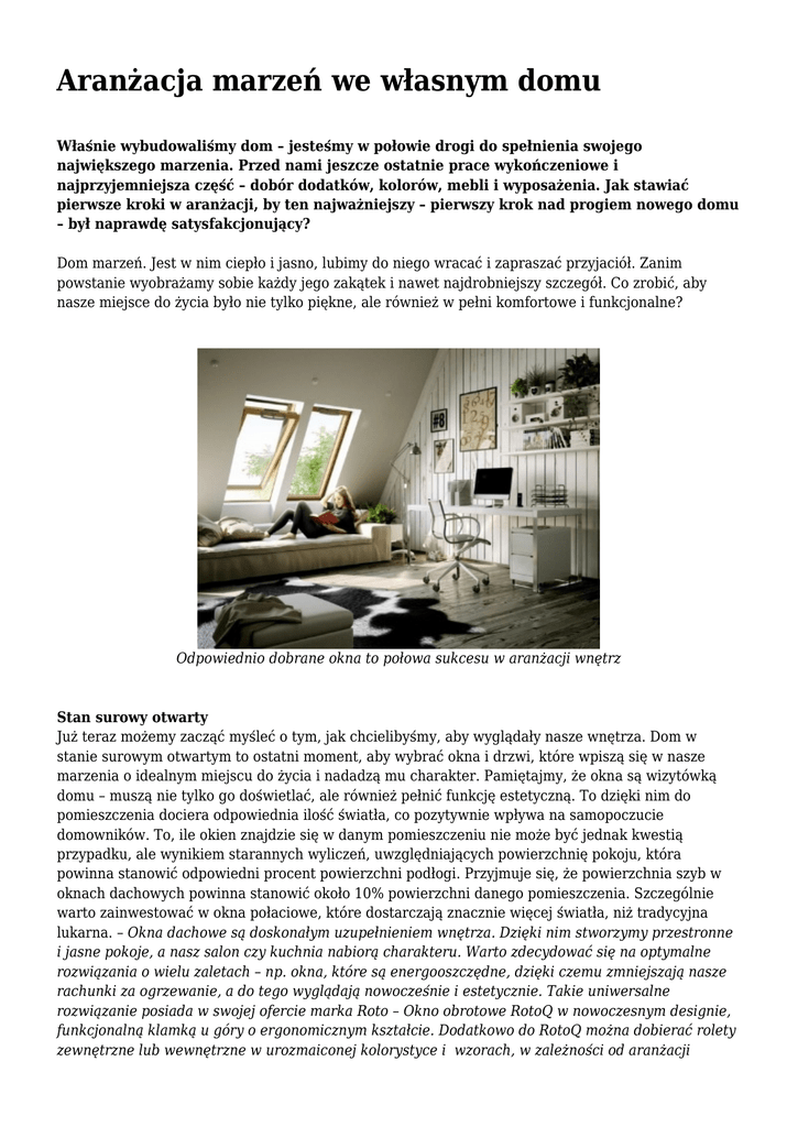 Aranżacja marzeń we własnym domu Właśnie wybudowaliśmy dom – jesteśmy w połowie drogi do spełnienia swojego największego marzenia. Przed nami jeszcze ostatnie prace wykończeniowe i najprzyjemniejsza część – dobór dodatków, kolorów, mebli i wyposażenia. Jak stawiać pierwsze kroki w aranżacji, by ten najważniejszy – pierwszy krok nad progiem nowego domu – był naprawdę satysfakcjonujący? Dom marzeń. Jest w nim ciepło i jasno, lubimy do niego wracać i zapraszać przyjaciół. Zanim powstanie wyobrażamy sobie każdy jego zakątek i nawet najdrobniejszy szczegół. Co zrobić, aby nasze miejsce do życia było nie tylko piękne, ale również w pełni komfortowe i funkcjonalne? Odpowiednio dobrane okna to połowa sukcesu w aranżacji wnętrz Stan surowy otwarty Już teraz możemy zacząć myśleć o tym, jak chcielibyśmy, aby wyglądały nasze wnętrza. Dom w stanie surowym otwartym to ostatni moment, aby wybrać okna i drzwi, które wpiszą się w nasze marzenia o idealnym miejscu do życia i nadadzą mu charakter. Pamiętajmy, że okna są wizytówką domu – muszą nie tylko go doświetlać, ale również pełnić funkcję estetyczną. To dzięki nim do pomieszczenia dociera odpowiednia ilość światła, co pozytywnie wpływa na samopoczucie domowników. To, ile okien znajdzie się w danym pomieszczeniu nie może być jednak kwestią przypadku, ale wynikiem starannych wyliczeń, uwzględniających powierzchnię pokoju, która powinna stanowić odpowiedni procent powierzchni podłogi. Przyjmuje się, że powierzchnia szyb w oknach dachowych powinna stanowić około 10% powierzchni danego pomieszczenia. Szczególnie warto zainwestować w okna połaciowe, które dostarczają znacznie więcej światła, niż tradycyjna lukarna. – Okna dachowe są doskonałym uzupełnieniem wnętrza. Dzięki nim stworzymy przestronne i jasne pokoje, a nasz salon czy kuchnia nabiorą charakteru. Warto zdecydować się na optymalne rozwiązania o wielu zaletach – np. okna, które są energooszczędne, dzięki czemu zmniejszają nasze rachunki za ogrzewanie, a do tego wyglądają nowocześnie i estetycznie. Takie uniwersalne rozwiązanie posiada w swojej ofercie marka Roto – Okno obrotowe RotoQ w nowoczesnym designie, funkcjonalną klamką u góry o ergonomicznym kształcie. Dodatkowo do RotoQ można dobierać rolety zewnętrzne lub wewnętrzne w urozmaiconej kolorystyce i wzorach, w zależności od aranżacji naszego wnętrza. – podpowiada Karina Frydrych, Specjalista ds. Marketingu Roto. Harmonia i funkcjonalność W domu o stanie zamkniętym możemy już swobodnie wizualizować sobie ostateczny wygląd naszej przestrzeni. Dopiero teraz jesteśmy w stanie określić, czy nasza wymarzona aranżacja będzie wyglądała dokładnie tak, jak sobie wyobrażaliśmy – nie zawsze to, co spodobało nam się w czasopiśmie czy u znajomych, ma szansę sprawdzić się w naszym, zupełnie innym, wnętrzu. Szeroka dostępność materiałów aranżacyjnych pozwala nam jednak swobodnie wybierać, postawmy więc na takie, które wizualnie będą korespondować z estetyką okien czy drzwi, układem ścian i naszą wizją domu. To pozwoli nam stworzyć spójną aranżację w całym mieszkaniu i uniknąć niepotrzebnego chaosu. Korytarz, który wizualnie nawiązuje do salonu, podobna kolorystyka kuchni i jadalni, powtarzające się we wszystkich pokojach motywy – taka konsekwencja wprowadzi do domu harmonię i elegancję. Pamiętajmy też o podstawowych zasadach złudzenia optycznego, na który poza oknami, mają wpływ również kolory – ciemne sprawią, że pokój będzie wydawał się mniejszy, a jasne – otworzą go i wizualnie powiększą. Duże okna i jasne kolory optycznie powiększą wnętrze. Weźmy pod uwagę fakt, że moda w aranżacji wnętrz zmienia się niemal tak szybko, jak moda na wybiegach. Nigdy więc nie decydujmy się na konkretny styl wnętrza tylko dlatego, że podszeptują nam to aktualne trendy. Lepiej, jeśli nasz wybór będzie przemyślany i stworzy wnętrze nie tylko piękne, ale również funkcjonalne – to właśnie tę cechę szczególnie docenimy po latach.