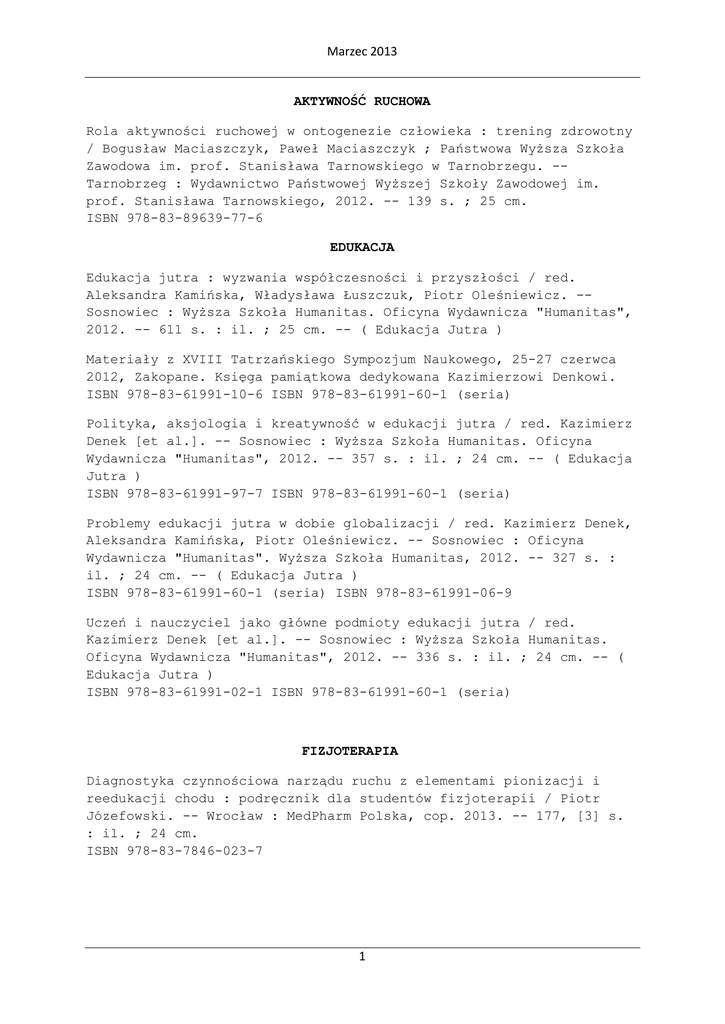 Marzec 2013 AKTYWNOŚĆ RUCHOWA Rola aktywności ruchowej w ontogenezie człowieka : trening zdrowotny / Bogusław Maciaszczyk, Paweł Maciaszczyk ; Państwowa Wyższa Szkoła Zawodowa im. prof. Stanisława Tarnowskiego w Tarnobrzegu. -Tarnobrzeg : Wydawnictwo Państwowej Wyższej Szkoły Zawodowej im. prof. Stanisława Tarnowskiego, 2012. -- 139 s. ; 25 cm. ISBN 978-83-89639-77-6 EDUKACJA Edukacja jutra : wyzwania współczesności i przyszłości / red. Aleksandra Kamińska, Władysława Łuszczuk, Piotr Oleśniewicz. -Sosnowiec : Wyższa Szkoła Humanitas. Oficyna Wydawnicza "Humanitas", 2012. -- 611 s. : il. ; 25 cm. -- ( Edukacja Jutra ) Materiały z XVIII Tatrzańskiego Sympozjum Naukowego, 25-27 czerwca 2012, Zakopane. Księga pamiątkowa dedykowana Kazimierzowi Denkowi. ISBN 978-83-61991-10-6 ISBN 978-83-61991-60-1 (seria) Polityka, aksjologia i kreatywność w edukacji jutra / red. Kazimierz Denek [et al.]. -- Sosnowiec : Wyższa Szkoła Humanitas. Oficyna Wydawnicza "Humanitas", 2012. -- 357 s. : il. ; 24 cm. -- ( Edukacja Jutra ) ISBN 978-83-61991-97-7 ISBN 978-83-61991-60-1 (seria) Problemy edukacji jutra w dobie globalizacji / red. Kazimierz Denek, Aleksandra Kamińska, Piotr Oleśniewicz. -- Sosnowiec : Oficyna Wydawnicza "Humanitas". Wyższa Szkoła Humanitas, 2012. -- 327 s. : il. ; 24 cm. -- ( Edukacja Jutra ) ISBN 978-83-61991-60-1 (seria) ISBN 978-83-61991-06-9 Uczeń i nauczyciel jako główne podmioty edukacji jutra / red. Kazimierz Denek [et al.]. -- Sosnowiec : Wyższa Szkoła Humanitas. Oficyna Wydawnicza "Humanitas", 2012. -- 336 s. : il. ; 24 cm. -- ( Edukacja Jutra ) ISBN 978-83-61991-02-1 ISBN 978-83-61991-60-1 (seria) FIZJOTERAPIA Diagnostyka czynnościowa narządu ruchu z elementami pionizacji i reedukacji chodu : podręcznik dla studentów fizjoterapii / Piotr Józefowski. -- Wrocław : MedPharm Polska, cop. 2013. -- 177, [3] s. : il. ; 24 cm. ISBN 978-83-7846-023-7 1 Marzec 2013 Masaż tkanek głębokich : materiały pomocnicze do ćwiczeń / Marcin Wytrążek. -- Poznań : Wydawnictwo Wyższej Szkoły Edukacji i Terapii, 2013. Metodyka i technika ćwiczeń leczniczych w kinezyterapii : podręcznik dla studentów fizjoterapii / Ilias Dumas. -- Wrocław : MedPharm Polska, cop. 2013. -- 58, [2] s. : il. ; 24 cm. ISBN 978-83-7846-024-4 GERONTOLOGIA Praca a długowieczność : materiały z konferencji naukowej "Długowieczność i praca" / pod red. nauk. Stanisława Rogali ; Wyższa Szkoła Zarządzania i Administracji w Opolu. -- Opole : Wydawnictwa Wyższej Szkoły Zarządzania i Administracji : Wydawnictwo Instytut Śląski, 2012. -- 107 s. : il. ; 24 cm. -- (Monografie i Opracowania) ISBN 978-83-62683-29-1 (WSZiA) ISBN 978-83-7511-153-8 HISTORIA SPORTU Historia polskiej piłki nożnej / Robert Gawkowski, Jakub Braciszewski. -- Warszawa : Wydawnictwo SBM, 2012. Olimpiady 1896-2012. -- Warszawa : Wydawnictwo SBM, 2012. Podziemny futbol : 1939-1944 / Kulesza Juliusz. -- Warszawa : Vizja Press & IT, 2012. Sport w II Rzeczpospolitej / Robert Gawkowski. -- Warszawa : Wydawnictwo SBM, 2012. JOGA Czy ciało jest świątynią duszy? : współczesna praktyka jogi jako fenomen psychospołeczny / Krzysztof T. Konecki. -- Warszawa : Difin, 2012. -- 239 s. : il. ; 23 cm. -- ( Engram ) ISBN 978-83-7641-736-3 MARKETING W SPORCIE Marketing sportowy : na przykładzie klubów profesjonalnej ligi piłki siatkowej / Piotr Halemba, Michał Kucharski, Miron Juchimiuk. -Katowice : Akademia Wychowania Fizycznego im. Jerzego Kukuczki, 2013. 2 Marzec 2013 REHABILITACJA SPOŁECZNA Edukacja i socjalizacja w życiu osoby niepełnosprawnej / red. nauk. Anna Klinik, Dorota Prysak. -- Sosnowiec : Oficyna Wydawnicza "Humanitas". Wyższa Szkoła Humanitas, 2011. -- 255 s. : il. ; 24 cm. ISBN 978-83-61991-85-4 TRENING Trening mentalny biegacza : jak utrzymać motywację / Jeff Galloway ; [tł. Wojciech Białas]. -- Gliwice : Wydawnictwo Helion, cop. 2013. - 178 s. : il. ; 23 cm. -- ( Septem ) ISBN 978-83-246-4873-3 Trening wytrzymałości : optymalizacja metod i obciążeń treningowych / Urszula Szmatlan-Gabryś ; Państwowa Wyższa Szkoła Zawodowa im. rotmistrza [!] Witolda Pileckiego w Oświęcimiu, Laboratorium Przygotowania Fizycznego 4Sportlab Warszawa. -- Warszawa : Laboratorium Przygotowania Fizycznego 4Sportlab ; Oświęcim : Państwowa Wyższa Szkoła Zawodowa im. rotmistrza Witolda Pileckiego, 2012. -- 218 s. : il. ; 25 cm. ISBN 978-83-930661-3-1 TURYSTYKA Kłodzkie Towarzystwo Górskie 1881-1945 / Marcin Dziedzic. -- Wrocław : Quaestio, 2013. Marketing turystyczny : (elementy norm postępowania i etyki dla zarządzających) / Cezary Marcinkiewicz, Sławomir Kowalski. -Sosnowiec : Oficyna Wydawnicza "Humanitas", 2012. -- 223, [1] s. : il. ; 25 cm. ISBN 978-83-61991-38-0 Marketing w agroturystyce : ujęcie segmentacyjne / Małgorzata Czerwińska-Jaśkiewicz. -- Warszawa : Wydawnictwo Difin, 2013. -270, [2] s. ; 24 cm. ISBN 978-83-7641-754-7 Nowoczesne biuro w przedsiębiorstwie turystycznym i hotelarskim / Bożena Alejziak. -- Kraków : ALBIS, 2013. Regiony turystyczne świata. Cz. 2 / red. nauk. Włodzimierz Kurek ; aut.: Robert Faracik [et al.]. -- Warszawa : Wydawnictwo Naukowe PWN, 2012. -- 344 s. : il. ; 24 cm. -- ( Turystyka ) ISBN 978-83-01-17228-2 (cz. 2) ISBN 978-83-01-17229-9 (cz. 1-2) 3