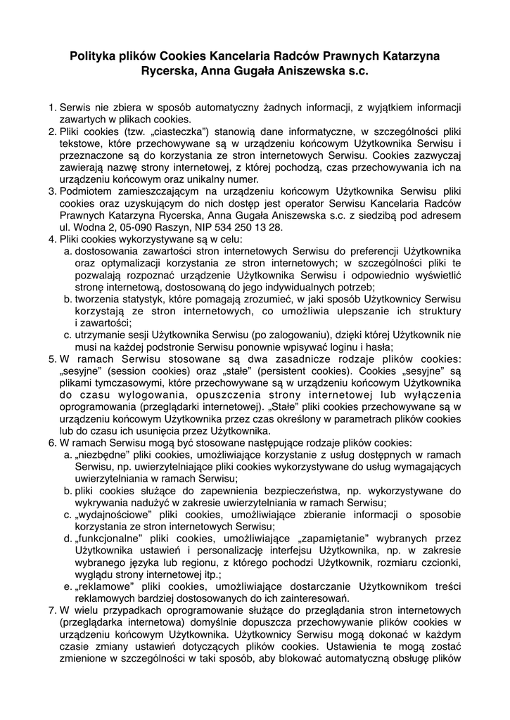 Polityka plików Cookies Kancelaria Radców Prawnych Katarzyna Rycerska, Anna Gugała Aniszewska s.c. 1. Serwis nie zbiera w sposób automatyczny żadnych informacji, z wyjątkiem informacji zawartych w plikach cookies. 2. Pliki cookies (tzw. „ciasteczka”) stanowią dane informatyczne, w szczególności pliki tekstowe, które przechowywane są w urządzeniu końcowym Użytkownika Serwisu i przeznaczone są do korzystania ze stron internetowych Serwisu. Cookies zazwyczaj zawierają nazwę strony internetowej, z której pochodzą, czas przechowywania ich na urządzeniu końcowym oraz unikalny numer. 3. Podmiotem zamieszczającym na urządzeniu końcowym Użytkownika Serwisu pliki cookies oraz uzyskującym do nich dostęp jest operator Serwisu Kancelaria Radców Prawnych Katarzyna Rycerska, Anna Gugała Aniszewska s.c. z siedzibą pod adresem ul. Wodna 2, 05-090 Raszyn, NIP 534 250 13 28. 4. Pliki cookies wykorzystywane są w celu: a. dostosowania zawartości stron internetowych Serwisu do preferencji Użytkownika oraz optymalizacji korzystania ze stron internetowych; w szczególności pliki te pozwalają rozpoznać urządzenie Użytkownika Serwisu i odpowiednio wyświetlić stronę internetową, dostosowaną do jego indywidualnych potrzeb; b. tworzenia statystyk, które pomagają zrozumieć, w jaki sposób Użytkownicy Serwisu korzystają ze stron internetowych, co umożliwia ulepszanie ich struktury i zawartości; c. utrzymanie sesji Użytkownika Serwisu (po zalogowaniu), dzięki której Użytkownik nie musi na każdej podstronie Serwisu ponownie wpisywać loginu i hasła; 5. W ramach Serwisu stosowane są dwa zasadnicze rodzaje plików cookies: „sesyjne” (session cookies) oraz „stałe” (persistent cookies). Cookies „sesyjne” są plikami tymczasowymi, które przechowywane są w urządzeniu końcowym Użytkownika do czasu wylogowania, opuszczenia strony internetowej lub wyłączenia oprogramowania (przeglądarki internetowej). „Stałe” pliki cookies przechowywane są w urządzeniu końcowym Użytkownika przez czas określony w parametrach plików cookies lub do czasu ich usunięcia przez Użytkownika. 6. W ramach Serwisu mogą być stosowane następujące rodzaje plików cookies: a. „niezbędne” pliki cookies, umożliwiające korzystanie z usług dostępnych w ramach Serwisu, np. uwierzytelniające pliki cookies wykorzystywane do usług wymagających uwierzytelniania w ramach Serwisu; b. pliki cookies służące do zapewnienia bezpieczeństwa, np. wykorzystywane do wykrywania nadużyć w zakresie uwierzytelniania w ramach Serwisu; c. „wydajnościowe” pliki cookies, umożliwiające zbieranie informacji o sposobie korzystania ze stron internetowych Serwisu; d. „funkcjonalne” pliki cookies, umożliwiające „zapamiętanie” wybranych przez Użytkownika ustawień i personalizację interfejsu Użytkownika, np. w zakresie wybranego języka lub regionu, z którego pochodzi Użytkownik, rozmiaru czcionki, wyglądu strony internetowej itp.; e. „reklamowe” pliki cookies, umożliwiające dostarczanie Użytkownikom treści reklamowych bardziej dostosowanych do ich zainteresowań. 7. W wielu przypadkach oprogramowanie służące do przeglądania stron internetowych (przeglądarka internetowa) domyślnie dopuszcza przechowywanie plików cookies w urządzeniu końcowym Użytkownika. Użytkownicy Serwisu mogą dokonać w każdym czasie zmiany ustawień dotyczących plików cookies. Ustawienia te mogą zostać zmienione w szczególności w taki sposób, aby blokować automatyczną obsługę plików cookies w ustawieniach przeglądarki internetowej bądź informować o ich każdorazowym zamieszczeniu w urządzeniu Użytkownika Serwisu. Szczegółowe informacje o możliwości i sposobach obsługi plików cookies dostępne są w ustawieniach oprogramowania (przeglądarki internetowej). 8. Operator Serwisu informuje, że ograniczenia stosowania plików cookies mogą wpłynąć na niektóre funkcjonalności dostępne na stronach internetowych Serwisu. 9. Pliki cookies zamieszczane w urządzeniu końcowym Użytkownika Serwisu i wykorzystywane mogą być również przez współpracujących z operatorem Serwisu reklamodawców oraz partnerów.