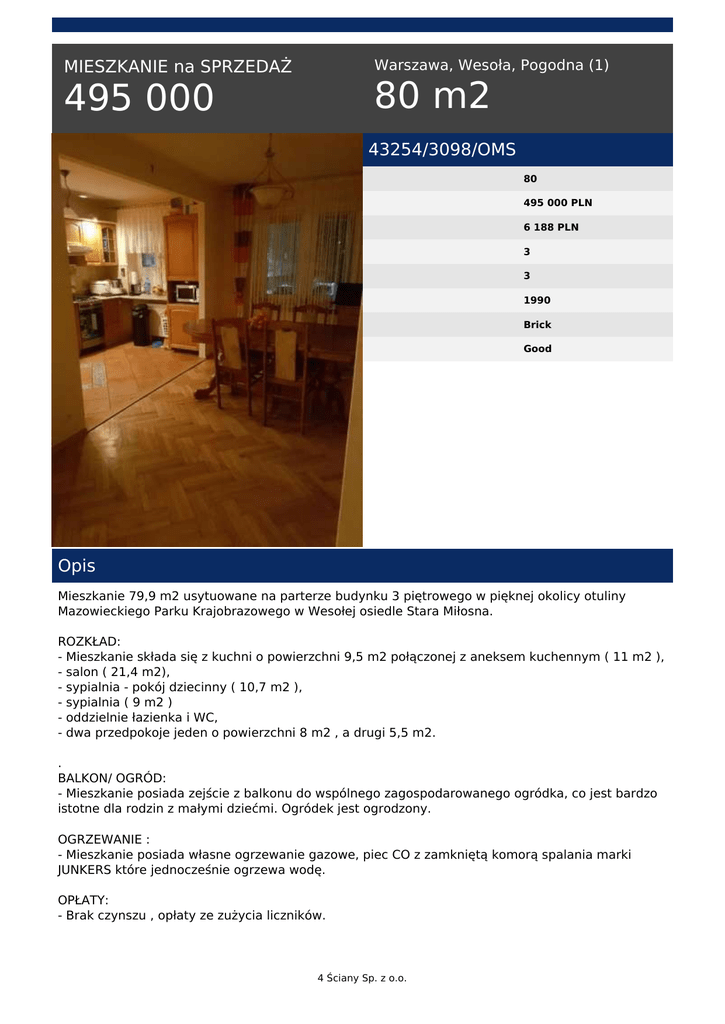 Warszawa, Wesoła, Pogodna (1) MIESZKANIE na SPRZEDAŻ 80 m2 495 000 43254/3098/OMS 80 495 000 PLN 6 188 PLN 3 3 1990 Brick Good Opis Mieszkanie 79,9 m2 usytuowane na parterze budynku 3 piętrowego w pięknej okolicy otuliny Mazowieckiego Parku Krajobrazowego w Wesołej osiedle Stara Miłosna. ROZKŁAD: - Mieszkanie składa się z kuchni o powierzchni 9,5 m2 połączonej z aneksem kuchennym ( 11 m2 ), - salon ( 21,4 m2), - sypialnia - pokój dziecinny ( 10,7 m2 ), - sypialnia ( 9 m2 ) - oddzielnie łazienka i WC, - dwa przedpokoje jeden o powierzchni 8 m2 , a drugi 5,5 m2. . BALKON/ OGRÓD: - Mieszkanie posiada zejście z balkonu do wspólnego zagospodarowanego ogródka, co jest bardzo istotne dla rodzin z małymi dziećmi. Ogródek jest ogrodzony. OGRZEWANIE : - Mieszkanie posiada własne ogrzewanie gazowe, piec CO z zamkniętą komorą spalania marki JUNKERS które jednocześnie ogrzewa wodę. OPŁATY: - Brak czynszu , opłaty ze zużycia liczników. 4 Ściany Sp. z o.o. PRZYNALEŻNE: - do mieszkania przynależna jest piwnica i miejsce parkingowe. OSIEDLE: - Teren ogrodzony LOKALIZACJA: - W odległości około 200 metrów przystanek autobusowy linii 502 do Centrum Warszawy, 411, 173, 198 do przystanku SKM. - W pobliżu : Poczta,Bank, Przychodnie Zdrowia, Szkoły, Sklepy: Lidl, Biedronka, KM. Zamieszczona oferta nie stanowi oferty w rozumieniu Kodeksu Cywilnego. licencja 4355; Zapytaj naszego Agenta o pomoc w otrzymaniu kredytu !!! 4 Ściany Sp. z o.o. tel. 22 629 80 80 email: [email protected] 4 Ściany Sp. z o.o. Powered by TCPDF (www.tcpdf.org)