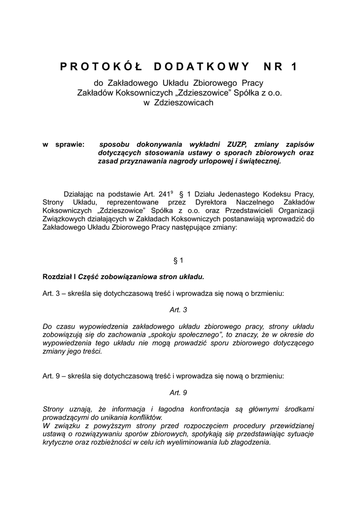 PROTOKÓŁ DODATKOWY NR 1 do Zakładowego Układu Zbiorowego Pracy Zakładów Koksowniczych „Zdzieszowice” Spółka z o.o. w Zdzieszowicach w sprawie: sposobu dokonywania wykładni ZUZP, zmiany zapisów dotyczących stosowania ustawy o sporach zbiorowych oraz zasad przyznawania nagrody urlopowej i świątecznej. Działając na podstawie Art. 2419 § 1 Działu Jedenastego Kodeksu Pracy, Strony Układu, reprezentowane przez Dyrektora Naczelnego Zakładów Koksowniczych „Zdzieszowice” Spółka z o.o. oraz Przedstawicieli Organizacji Związkowych działających w Zakładach Koksowniczych postanawiają wprowadzić do Zakładowego Układu Zbiorowego Pracy następujące zmiany: §1 Rozdział I Część zobowiązaniowa stron układu. Art. 3 – skreśla się dotychczasową treść i wprowadza się nową o brzmieniu: Art. 3 Do czasu wypowiedzenia zakładowego układu zbiorowego pracy, strony układu zobowiązują się do zachowania „spokoju społecznego”, to znaczy, że w okresie do wypowiedzenia tego układu nie mogą prowadzić sporu zbiorowego dotyczącego zmiany jego treści. Art. 9 – skreśla się dotychczasową treść i wprowadza się nową o brzmieniu: Art. 9 Strony uznają, że informacja i łagodna konfrontacja są głównymi środkami prowadzącymi do unikania konfliktów. W związku z powyższym strony przed rozpoczęciem procedury przewidzianej ustawą o rozwiązywaniu sporów zbiorowych, spotykają się przedstawiając sytuacje krytyczne oraz rozbieżności w celu ich wyeliminowania lub złagodzenia. §2 Rozdział II Zasady wynagradzania oraz przyznawania innych świadczeń związanych z pracą. W Art. 28 § 5 pkt a) wyrazy „w czerwcu” zastępuje się wyrazami „w lipcu” a po wyrazach „... nagroda urlopowa” zamiast przecinka wstawia się kropkę oraz dodaje się zdanie o treści: Szczegółowe zasady przyznawania nagrody określa Załącznik nr 5 do Zakładowego Układu Zbiorowego Pracy. W Art. 28 § 5 pkt b) cyfrę „11” zastępuje się cyfrą „10” oraz dodaje się zdanie o treści: Szczegółowe zasady przyznawania nagrody określa Załącznik nr 6 do Zakładowego Układu Zbiorowego Pracy. Po punktach a i b wprowadza się treść: Strony mogą ustalić inny termin wypłaty nagrody, o której mowa w pkt. a i b w drodze zmiany układu w przewidzianym trybie. Art. 32 § 2.1. – skreśla się dotychczasową treść i wprowadza się nową o brzmieniu: § 2.1. Specjalne wynagrodzenie wynosi 5 % podstawy wymiaru – w przyjętym okresie obliczeniowym wynoszącym miesiąc kalendarzowy – po przepracowaniu 5 lat i wzrasta o 1 % za każdy następny rok pracy, do 20 % podstawy wymiaru po 20 latach pracy. Art. 32 § 2 – wprowadza się pkt 10 o brzmieniu: 10. Podstawę wymiaru specjalnego wynagrodzenia stanowi płaca zasadnicza za czas pracy i czas usprawiedliwionej nieobecności w pracy oraz za robocze dni niezdolności do pracy z powodu choroby lub opieki, za który to czas pracownik otrzymał wynagrodzenie lub zasiłek z ubezpieczenia społecznego. 2 §3 Rozdział XI Postanowienia końcowe. Po Art. 61 wprowadza się Art. 61 A o brzmieniu: Art. 61 A 1. Wykładni treści układu dokonują jego strony. Rozmowy w przedmiocie wykładni układu trwają tak długo, jak długo strony uznają to za celowe. 2. Uzgodniona wykładnia spornych postanowień układu dokonana przez strony w formie podpisanego przez strony protokołu jest dla stron wiążąca. §4 Wprowadza się Załączniki nr 5 i 6 do Zakładowego Układu Zbiorowego Pracy o treści stanowiącej Załączniki do niniejszego Protokołu. §5 Postanowienia niniejszego Protokołu Dodatkowego wchodzą w życie po uprzednim zarejestrowaniu go przez Okręgowy Inspektorat Pracy w Opolu. Uzgodnienia: NSZZ Pracowników ZK ......................................... Joachim Korzeński MNSZZ „Solidarność” ....................................... Zbigniew Wesoły MKNSZZ „Solidarność’80” ....................................... Lesław Roman MZZ Pracowników Ruchu Ciągłego ...................................... Małgorzata Pandel ZZ „KADRA” .................................... Jerzy Halarewicz 3 Załącznik nr 5 do Zakładowego Układu Zbiorowego pracy ZASADY WYPŁACANIA NAGRODY MOTYWACYJNEJ TZW. NAGRODY URLOPOWEJ 1. Nagroda urlopowa wypłacana jest w ramach dysponowanych środków na wynagrodzenia po spełnieniu warunków określonych w Art. 28 ZUZP. 2. Wysokość kwoty nagrody na 1-go pracownika określana jest przez Pracodawcę w uzgodnieniu z organizacjami związkowymi. 3. Nagroda przysługuje pracownikom – z wyłączeniem wynagradzanych wg Art. 33 ZUZP – będącym w stanie zatrudnienia w miesiącu czerwcu danego roku. Nagroda nie przysługuje pracownikom, z którymi rozwiązana została umowa o pracę w okresie miesiąca czerwca z przyczyn innych niż: - przejście na emeryturę, rentę, świadczenia przedemerytalne lub świadczenia rehabilitacyjne, - powołanie do odbycia zasadniczej służby wojskowej, - rozpoczęcie urlopu wychowawczego, - zgon. 4. Nagroda wypłacana jest w miesiącu lipcu łącznie z wynagrodzeniem za pracę z zastrzeżeniem postanowień Art. 28 § 5. 5. Pracownicy zatrudnieni w niepełnym wymiarze czasu pracy otrzymują nagrodę urlopową w wysokości proporcjonalnej do wymiaru czasu pracy określonego w umowie. 4 Załącznik nr 6 do Zakładowego Układu Zbiorowego Pracy ZASADY WYPŁACANIA NAGRODY MOTYWACYJNEJ TZW. NAGRODY ŚWIĄTECZNEJ 1. Nagroda świąteczna wypłacana jest w ramach dysponowanych środków na wynagrodzenia po spełnieniu warunków określonych w Art. 28 ZUZP. 2. Wysokość kwoty nagrody na 1-go pracownika określana jest przez Pracodawcę w uzgodnieniu z organizacjami związkowymi. 3. Nagroda przysługuje pracownikom – z wyłączeniem wynagradzanych wg Art. 33 ZUZP – będącym w stanie zatrudnienia w miesiącu listopadzie danego roku. Nagroda nie przysługuje pracownikom, z którymi rozwiązana została umowa o pracę w okresie miesiąca listopada z 