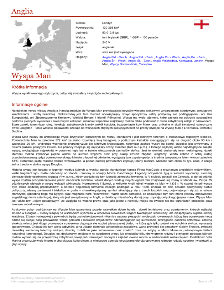 Anglia Stolica: Londyn Powierzchnia: 130 395 km² Ludność: 53 012,5 tys. Waluta: funt brytyjski (GBP), 1 GBP = 100 pensów Napięcie: 240 V Język: angielski Wiza: wiza nie jest wymagana Regiony: Anglia Płd. - Wsch., Anglia Płd. - Zach., Anglia Pn. - Wsch., Anglia Pn. - Zach., Anglia Śr. - Wsch., Anglia Śr. - Zach., Anglia Wschodnia, Kornwalia, Londyn, Wyspa Man, Wyspy Normandzkie, Yorkshire Wyspa Man Krótka informacja Wyspa wyrafinowanego stylu życia, celtyckiej atmosfery i wyścigów motocyklowych. Informacje ogólne Na dalekim morzu między Anglią a Irlandią znajduje się Wyspa Man przyciągająca turystów wieloma ciekawymi wydarzeniami sportowymi, ujmującymi krajobrazami i strefą bezcłową. Ciekawostką jest tam również obowiązujący dosyć specyficzny ustrój polityczny nie podlegającemu ani Unii Europejskiej, ani Zjednoczonemu Królestwu Wielkiej Brytanii i Irlandii Północnej. Wyspa ma wiele tajemnic, które czekają na odkrycie szczególnie podczas pieszych wycieczek i rowerowych eskapad, niemniej wspaniałe krajobrazy można także podziwiać z okien zabytkowej kolejki z parowozem. Stare zamki, tajemnicze ruiny, kolekcja zabytkowych krzyży wokół kościoła, bezogoniaste koty Manx oraz unikalne w skali światowej czterorożne owce Loaghtan – takie właśnie ciekawostki czekają na wszystkich chętnych kupujących bilet na promy płynące na Wyspę Man z Liverpoolu, Belfastu i Dublina. Wyspa Man należy do archipelagu Wysp Brytyjskich położonych na Morzu Irlandzkimi i jest nizinnym terenem o stosunkowo łagodnym klimacie. Powierzchnia Man to zaledwie 572 km² ze słabo rozwiniętą linią brzegową o podłużnym kształcie rozciągającym się na długość około 50 km i szerokość 20 km. Wybrzeże wschodnie charakteryzuje się klifowym krajobrazem, natomiast zachód wyspy na sporej długości jest wyrównany z niskimi plażami pokrytymi żwirem. Na północy znajduje się najwyższy szczyt Snaefell (620 m n.p.m.), z którego najlepiej widać najodleglejsze zakątki wyspy, wyglądające najpiękniej w porannej mgle lub w trakcie wieczornych zachodów słońca. Jest to również doskonały teren trekkingowy, dzięki któremu można zobaczyć piękne widoki na surowe wzgórza oraz przy okazji zrzucić zbędne kilogramy. Warto zabrać z sobą kurtkę przeciwdeszczową, gdyż pomimo morskiego klimatu o łagodnej odmianie, występują tam częste opady, a średnia temperatura latem wynosi zaledwie 13°C. Naturalną szatę roślinną tworzą wrzosowiska, a ponad połowę powierzchni zajmują tereny rolnicze. Mieszka tam około 80 tys. osób, z czego jedna trzecia w stolicy wyspy Douglas. Historia wyspy jest bogata w legendy, według których w wyniku starcia irlandzkiego herosa Finna MacCoole z nieznanym angielskim wojownikiem, wielki fragment lądu został oderwany od Irlandii i rzucony w odmęty Morza Irlandzkiego. Legendy oczywiście żyją w kulturze wyspiarzy, niemniej pierwsze ślady osadnictwa sięgają VI w. p.n.e., kiedy osadziła się tam ludność zbieracko-łowiecka. W V stuleciu pojawili się Celtowie, a sto lat później wyspa została schrystianizowana przez irlandzkich mnichów, wśród których według innych legend miał znajdować się znany w Irlandii św. Patryk. W późniejszych wiekach o wyspę walczyli wikingowie, Normanowie i Szkoci, a królowie Anglii objęli władzę na Man w 1333 r. W swojej historii wyspa była także siedzibą przemytników, a koronie angielskiej formalnie zaczęła podlegać w roku 1828, chociaż do dziś posiada specyficzny status polityczny, własny parlament i triskelion w godle – charakterystyczny symbol składający się z trzech ludzkich nóg pojawiających się już w sztuce starożytnej (podobną flagę ma Sycylia oraz magnacki herb Radziwiłłów). Warto także pamiętać, że obowiązuje tam funt manx (lokalny odpowiednik angielskiego funta szterlinga), który nie jest akceptowany w Anglii, a niektórzy mieszkańcy do tej pory używają celtyckiego języka manx. Wyspa Man jest także tzw. „rajem podatkowym” ze względu na własne prawo oraz jako jedno z niewielu miejsc na świecie nie ma ograniczeń prędkości poza terenem zabudowanym. Atrakcyjny pobyt podróżniczy na Wyspie Man gwarantują przede wszystkim dobre hotele, domki letniskowe oraz apartamenty, których najlepiej szukać w Douglas – stolicy leżącej na wschodnim wybrzeżu w otoczeniu niewielkich wzgórz tworzących stonowany, ale niespotykany nigdzie indziej krajobraz. Z bazy noclegowej z pewnością będą usatysfakcjonowani miłośnicy wypraw pieszych i wycieczek rowerowych, którzy bez ograniczeń mogą oddać się swojej pasji przeważnie wśród górskich i morskich krajobrazów odznaczających się surowością szczególnie podczas sztormów. Główną atrakcją miasta jest długa promenada spacerowa ciągnąca się wzdłuż piaszczystej plaży, na którą gdy tylko pojawi się odrobina słońca, wyruszają spacerowicze. Chociaż nie tam wielu zabytków, a na ulicach dominuje wiktoriańska zabudowa, warto przyjrzeć się gmachowi Gaiety Theatre, zwiedzić niewielką kamienną twierdzę służącą dawniej rozbitkom jako schronienie oraz znaleźć czas na wizytę w Manx Museum poświęconym historii naturalnej i archeologii. Douglas jest doskonałym miejscem na spędzenie urlopu lub chociażby kilku dni w gronie rodziny i przyjaciół, podczas których można wybrać się na przejażdżkę zabytkową koleją lub tramwajem konnym i zajadać owoce morza w nadmorskich restauracjach. Dodatkowo Villa Marina organizuje wiele imprez o charakterze kulturalnym, a miejscowe agencje turystyczne oferują uprawianie rożnego rodzaju sportów i wycieczki w głąb wyspy. Wydruk ze strony http://intertravel.com.pl Informacje przygotowane przez MerlinX Strona 1/4 Kuchnia Kuchnia brytyjska po okresie kulinarnego zastoju wraca do łask i staje się jedną z najbardziej rozpoznawalnych kuchni świata, opartych na narodowych tradycjach. Turyści 