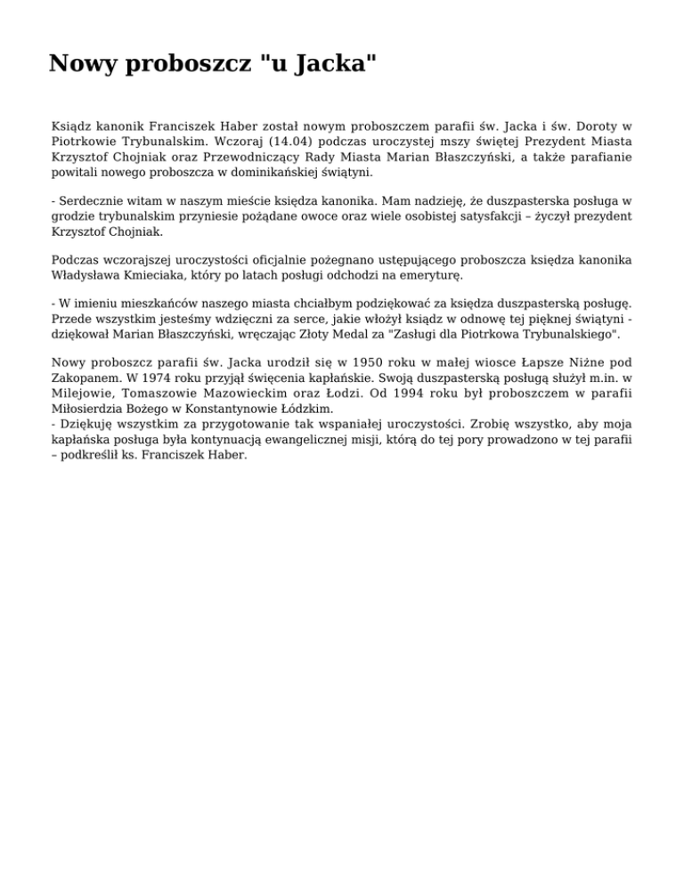 Nowy proboszcz "u Jacka" Ksiądz kanonik Franciszek Haber został nowym proboszczem parafii św. Jacka i św. Doroty w Piotrkowie Trybunalskim. Wczoraj (14.04) podczas uroczystej mszy świętej Prezydent Miasta Krzysztof Chojniak oraz Przewodniczący Rady Miasta Marian Błaszczyński, a także parafianie powitali nowego proboszcza w dominikańskiej świątyni. - Serdecznie witam w naszym mieście księdza kanonika. Mam nadzieję, że duszpasterska posługa w grodzie trybunalskim przyniesie pożądane owoce oraz wiele osobistej satysfakcji – życzył prezydent Krzysztof Chojniak. Podczas wczorajszej uroczystości oficjalnie pożegnano ustępującego proboszcza księdza kanonika Władysława Kmieciaka, który po latach posługi odchodzi na emeryturę. - W imieniu mieszkańców naszego miasta chciałbym podziękować za księdza duszpasterską posługę. Przede wszystkim jesteśmy wdzięczni za serce, jakie włożył ksiądz w odnowę tej pięknej świątyni dziękował Marian Błaszczyński, wręczając Złoty Medal za "Zasługi dla Piotrkowa Trybunalskiego". Nowy proboszcz parafii św. Jacka urodził się w 1950 roku w małej wiosce Łapsze Niżne pod Zakopanem. W 1974 roku przyjął święcenia kapłańskie. Swoją duszpasterską posługą służył m.in. w Milejowie, Tomaszowie Mazowieckim oraz Łodzi. Od 1994 roku był proboszczem w parafii Miłosierdzia Bożego w Konstantynowie Łódzkim. - Dziękuję wszystkim za przygotowanie tak wspaniałej uroczystości. Zrobię wszystko, aby moja kapłańska posługa była kontynuacją ewangelicznej misji, którą do tej pory prowadzono w tej parafii – podkreślił ks. Franciszek Haber.