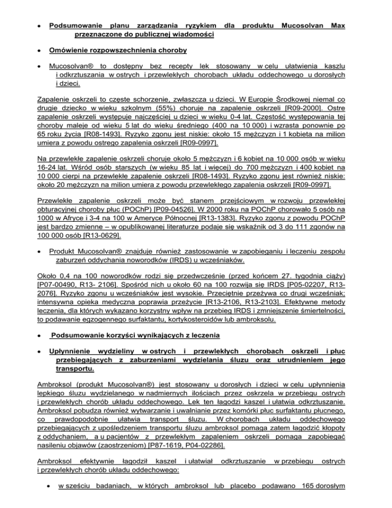 Podsumowanie planu zarządzania ryzykiem przeznaczone do publicznej wiadomości dla produktu Mucosolvan Max Omówienie rozpowszechnienia choroby Mucosolvan® to dostępny bez recepty lek stosowany w celu ułatwienia kaszlu i odkrztuszania w ostrych i przewlekłych chorobach układu oddechowego u dorosłych i dzieci. Zapalenie oskrzeli to częste schorzenie, zwłaszcza u dzieci. W Europie Środkowej niemal co drugie dziecko w wieku szkolnym (55%) choruje na zapalenie oskrzeli [R09-2000]. Ostre zapalenie oskrzeli występuje najczęściej u dzieci w wieku 0-4 lat. Częstość występowania tej choroby maleje od wieku 5 lat do wieku średniego (400 na 10 000) i wzrasta ponownie po 65 roku życia [R08-1493]. Ryzyko zgonu jest niskie: około 15 mężczyzn i 1 kobieta na milion umiera z powodu ostrego zapalenia oskrzeli [R09-0997]. Na przewlekłe zapalenie oskrzeli choruje około 5 mężczyzn i 6 kobiet na 10 000 osób w wieku 16-24 lat. Wśród osób starszych (w wieku 85 lat i więcej) do 700 mężczyzn i 400 kobiet na 10 000 cierpi na przewlekłe zapalenie oskrzeli [R08-1493]. Ryzyko zgonu jest również niskie: około 20 mężczyzn na milion umiera z powodu przewlekłego zapalenia oskrzeli [R09-0997]. Przewlekłe zapalenie oskrzeli może być stanem przejściowym w rozwoju przewlekłej obturacyjnej choroby płuc (POChP) [P09-04526]. W 2000 roku na POChP chorowało 5 osób na 1000 w Afryce i 3-4 na 100 w Ameryce Północnej [R13-1383]. Ryzyko zgonu z powodu POChP jest bardzo zmienne – w opublikowanej literaturze podaje się wskaźnik od 3 do 111 zgonów na 100 000 osób [R13-0629]. Produkt Mucosolvan® znajduje również zastosowanie w zapobieganiu i leczeniu zespołu zaburzeń oddychania noworodków (IRDS) u wcześniaków. Około 0,4 na 100 noworodków rodzi się przedwcześnie (przed końcem 27. tygodnia ciąży) [P07-00490, R13- 2106]. Spośród nich u około 60 na 100 rozwija się IRDS [P05-02207, R132076]. Ryzyko zgonu u wcześniaków jest wysokie. Przeciętnie przeżywa co drugi wcześniak; intensywna opieka medyczna poprawia przeżycie [R13-2106, R13-2103]. Efektywne metody leczenia, dla których wykazano korzystny wpływ na przebieg IRDS i zmniejszenie śmiertelności, to podawanie egzogennego surfaktantu, kortykosteroidów lub ambroksolu. Podsumowanie korzyści wynikających z leczenia Upłynnienie wydzieliny w ostrych i przewlekłych chorobach oskrzeli i płuc przebiegających z zaburzeniami wydzielania śluzu oraz utrudnieniem jego transportu. Ambroksol (produkt Mucosolvan®) jest stosowany u dorosłych i dzieci w celu upłynnienia lepkiego śluzu wydzielanego w nadmiernych ilościach przez oskrzela w przebiegu ostrych i przewlekłych chorób układu oddechowego. Lek ten łagodzi kaszel i ułatwia odkrztuszanie. Ambroksol pobudza również wytwarzanie i uwalnianie przez komórki płuc surfaktantu płucnego, co prawdopodobnie ułatwia transport śluzu. W chorobach układu oddechowego przebiegających z upośledzeniem transportu śluzu ambroksol pomaga zatem łagodzić kłopoty z oddychaniem, a u pacjentów z przewlekłym zapaleniem oskrzeli pomaga zapobiegać nasileniu objawów (zaostrzeniom) [P87-1619, P04-02286]. Ambroksol efektywnie łagodził kaszel i ułatwiał i przewlekłych chorób układu oddechowego: odkrztuszanie w przebiegu ostrych w sześciu badaniach, w których ambroksol lub placebo podawano 165 dorosłym pacjentom przez 7-22 dni, 188 przez 4 dni, a 662 leczono od 6 miesięcy do 2 lat; w dwóch badaniach z aktywnym komparatorem (ambroksol w porównaniu z Nacetylocysteiną u 30 pacjentów lub letosteiną u 80 pacjentów); w czterech badaniach z udziałem 605 dzieci (od noworodków do wieku 14 lat) leczonych do 28 dni. Profilaktyka i leczenie IRDS u kobiet ciężarnych, noworodków i niemowląt O porodzie przedwczesnym mówimy, jeśli rozpoczyna się on przed upływem 37 tygodni ciąży. Ryzyko rozwoju IRDS u noworodków urodzonych przedwcześnie jest znaczne z uwagi na niepełną dojrzałość płuc i niewystarczającą produkcję surfaktantu. Ambroksol ułatwia dojrzewanie płuc i leczenie IRDS u noworodków urodzonych przedwcześnie [R13-1690], a podawany kobietom ciężarnym podczas przedwczesnego porodu pomiędzy 28. i 34. tygodniem ciąży zapobiega rozwojowi IRDS u nienarodzonych dzieci [P95-8498, P967864, R13-1619, P00-017291. Jego skuteczność wykazano: w dwóch randomizowanych badaniach z udziałem 268 noworodków urodzonych przedwcześnie oraz analizie danych z sześciu randomizowanych badań z udziałem 823 noworodków urodzonych przedwcześnie; w trzech badaniach randomizowanych z udziałem 450 kobiet ciężarnych podczas porodu przedwczesnego (otrzymujących ambroksol lub nie). W jednym z tych badań ambroksol okazał się bardziej efektywny niż betametazon (komparator). Niewiadome związane z korzyściami z leczenia Pacjenci włączeni do badań dotyczących ambroksolu w obu wskazaniach byli reprezentatywni dla leczonej populacji pod względem płci, wieku, chorób współistniejących i innych czynników. Gromadzone przez długi czas doświadczenie po wprowadzeniu produktu na rynki na całym świecie nie wskazuje, aby wyniki leczenia różniły się w zależności od pochodzenia etnicznego pacjentów. Podsumowanie informacji dotyczących bezpieczeństwa stosowania PVI. Tabela 3. Istotne zidentyfikowane zagrożenia. Ryzyko Stan wiedzy Możliwość zapobiegania Wstrząs anafilaktyczny Wstrząs anafilaktyczny jest postacią reakcji anafilaktycznej, tj. poważnej reakcji alergicznej (reakcji nadwrażliwości) potencjalnie zagrażające życiu. Pacjenci z rozpoznaną nadwrażliwością na ambroksol lub inne składniki produktu Mucosolvan® nie mogą go przyjmować, co wymieniono jako przeciwwskazanie w dokumencie CCDS i charakterystyce produktu leczniczego (ChPL). Dowolna substancja (np. jad owadów, żywność, kosmetyki, leki) może wywołać nadmierną odpowiedź immunologiczną i spowodować reakcję anafilaktyczną. Wstrząs anafilaktyczny to stan n