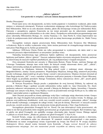 Abp Adam SZAL Metropolita Przemyski „Idźcie i głoście” List pasterski w związku z nowym rokiem duszpasterskim 2016/2017 Drodzy Diecezjanie! Przed nami nowy rok duszpasterski, na który trzeba popatrzeć w kontekście wydarzeń, jakie miały miejsce w minionych miesiącach. Ważnym wydarzeniem mijającego roku kościelnego był Nadzwyczajny Rok Miłosierdzia. Miał on na celu ukazanie ratunku, jakim dla dzisiejszego świata jest miłosierdzie Boże. Patrzenie z perspektywy papieża Franciszka na ten temat prowadzi nas do odnowienia znajomości i praktykowania uczynków miłosierdzia co do ciała i duszy. Perspektywa miłosierdzia przypomnianego nam przez sekretarkę Miłosierdzia Bożego, św. siostrę Faustynę i św. Jana Pawła II, winna doprowadzić nas z kolei do podejmowania dzieł miłosierdzia, także tych na miarę heroicznego przykładu św. Matki Teresy z Kalkuty. Szczególnie ważnym etapem przeżywania Roku Miłosierdzia były Światowe Dni Młodzieży w Krakowie. Było to wielkie wydarzenie wiary, które można porównać do ewangelicznego talentu danego nam przez Pana Boga po to, byśmy go pomnożyli. Jubileusz 1050-lecia Chrztu Polski nie tylko przypominał to wydarzenie, ale także miał w nas wzmocnić poczucie odpowiedzialności za utrzymanie i przekaz wiary. Naturalną konsekwencją tego jubileuszu będzie najbliższy rok duszpasterski, który przeżywać będziemy pod hasłem „Idźcie i głoście”. Naszym zadaniem będzie ożywienie misyjności Kościoła, zarówno tej skierowanej do naszych wspólnot parafialnych, jak i tej podejmowanej w krajach misyjnych. Owa misyjność Kościoła jest zawarta w Objawieniu Bożym. Pismo Święte, zarówno Starego jak i Nowego Testamentu, ukazuje nam wielu ludzi, do których zostały skierowane słowa „idź”, „idźcie”, będące uniwersalną zachętą do spełnienia określonego zadania – misji. Spójrzmy na Abrahama, któremu Pan Bóg polecił wyjść z rodzinnej ziemi, obiecując mu błogosławieństwo, ziemię i liczne potomstwo. Wspomnijmy Mojżesza, którego Bóg, ustanowił przywódcą narodu wybranego, doprowadził go do góry Synaj i zawarł z nim przymierze. Mojżesz również otrzymał od Pana Boga polecenie „idź” i wraz z narodem wybranym szedł przez pustynię w kierunku Ziemi Obiecanej. Jakże bogate są przykłady proroków Starego Testamentu, którzy usłyszawszy słowo „idź”, poszli głosić słowa pochodzące od samego Boga. W Nowym Przymierzu Maryja poszła z pośpiechem do swej krewnej Elżbiety, by radować się prawdą o bliskości Boga i spełniać uczynki miłosierdzia wobec matki św. Jana Chrzciciela. Św. Józef, posłuszny nakazowi otrzymanemu we śnie, poszedł z Maryją do Betlejem, Egiptu, Jerozolimy i Nazaretu, realizując tym samym wolę Bożą. Trzej Mędrcy wyszli na poszukiwanie nowego Króla po to, by oddać mu pokłon i opowiadać potem o spotkanym Mesjaszu. Sam Chrystus przyszedł na ziemię spełniając wolę Ojca i realizując misję zbawienia świata. Gorąco pragnął, aby Jego Ewangelia była przekazywana aż do końca świata i aż po krańce świata. To dlatego, już podczas swej publicznej działalności, wiele razy rozsyłał swoich uczniów z poleceniem „idźcie”, kierując ich do narodu wybranego, a następnie do całego świata. I tak jest do dzisiaj. Zbawiciel i w naszych czasach posyła nas, swoich uczniów, abyśmy do skończenia świata głosili prawdę o Nim i Jego Królestwie. Szczególnym głosicielem Ewangelii był św. Paweł. On sam doświadczył wielu przeciwności, ale mimo to nie bał się przeszkód, które mogłyby powstrzymać go od głoszenia Ewangelii. Był świadomy tego, że gdyby nie głosił Ewangelii, nie spełniłby swojego obowiązku jako Apostoł Jezusa. Dlatego napisał w jednym ze swoich listów: „Biada mi, gdybym nie głosił Ewangelii” (1 Kor 9,16). Kościół Święty, czując się zobowiązany do kontynuowania misji głoszenia prawdy o zbawieniu, ciągle na nowo uświadamia sobie ten obowiązek. W ostatnich wiekach przypominali o nim papieże. Wielokrotnie na temat ewangelizacji świata wypowiadał się święty Jan Paweł II. W swojej encyklice Redemptoris Missio ukazał ważny kierunek życia Kościoła: „Pragnę wezwać Kościół do odnowy zaangażowania misyjnego. Jest ono nastawione przede wszystkim na odnowę wiary i życia chrześci- jańskiego. Misje bowiem odnawiają Kościół, wzmacniają wiarę i tożsamość chrześcijańską, dają życiu chrześcijańskiemu nowy entuzjazm i nowe uzasadnienie. Wiara umacnia się, gdy jest przekazywana!” Znamy apel papieża Benedykta, wypowiedziany podczas Światowego Spotkania Młodzieży w Kolonii: „Ten, kto odkrył Chrystusa, musi prowadzić do Niego innych. Nie można zatrzymywać dla siebie ogromnej radości. Konieczne jest jej przekazywanie”. Podczas analogicznego spotkania w Brazylii papież Franciszek uświadomił nam, że wezwanie Chrystusa „Idźcie więc i nauczajcie wszystkie narody” dotyczy także ludzi żyjących współcześnie, mówiąc: „Tymi słowami Jezus zwraca się do każdego z was, komentując znamienne słowa: idźcie, bez obawy, bez lęku, aby służyć”. Papież Franciszek poucza, że „dzielenie się doświadczeniem wiary, dawanie świadectwa wiary, głoszenie Ewangelii jest nakazem, który Pan powierzył całemu Kościołowi, także każdemu z nas. Nakaz ten, nie wynika jednak z woli panowania czy władzy, ale z siły miłości”. Chrystus nie tylko nas posyła, ale nam towarzyszy, zawsze jest przy nas w tej misji miłości. Głoszenie Dobrej Nowiny o zbawieniu jest służbą. Nauczanie ostatnich papieży współbrzmi z wieloma artykułami Katechizm Kościoła Katolickiego, który w jednym z punktów wyraźnie stwierdza: „Kościół będąc „zwołaniem” wszystkich ludzi do zbawienia, ze swej natury jest misyjny, posłany przez Chrystusa do wszystkich narodów, aby z nich czynić uczniów”. Do obowiązku tego jest