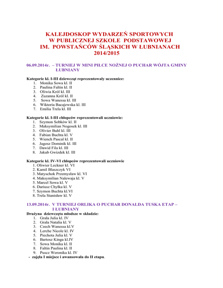KALEJDOSKOP WYDARZEŃ SPORTOWYCH W PUBLICZNEJ SZKOLE PODSTAWOWEJ IM. POWSTAŃCÓW ŚLĄSKICH W ŁUBNIANACH 2014/2015 06.09.2014r. – TURNIEJ W MINI PIŁCE NOŻNEJ O PUCHAR WÓJTA GMINY ŁUBNIANY Kategorie kl. I-III dziewcząt reprezentowały uczennice: 1. Monika Sowa kl. II 2. Paulina Faltin kl. II 3. Oliwia Król kl. III 4. Zuzanna Król kl. II 5. Sowa Wanessa kl. III 6. Wiktoria Bacajewska kl. III 7. Emilia Trela kl. III Kategorie kl. I-III chłopców reprezentowali uczniowie: 1. Szymon Sobków kl. II 2. Maksymilian Nogosek kl. III 3. Olivier Buhl kl. III 4. Fabian Buchta kl. V 5. Wiench Pascal kl. II 6. Jagosz Dominik kl. III 7. Dawid Fila kl. III 8. Jakub Gwizdek kl. III Kategorie kl. IV-VI chłopców reprezentowali uczniowie 1. Oliwier Leckner kl. VI 2. Kamil Blaszczyk VI 3. Matyschok Przemysław kl. VI 4. Maksymilian Nalewaja kl. V 5. Marcel Sowa kl. V 6. Dariusz Chyłka kl. V 7. Szymon Buchta kl.VI 8. Trela Stanisław kl. V 13.09.2014r. V TURNIEJ ORLIKA O PUCHAR DONALDA TUSKA ETAP – I ŁUBNIANY Drużyna dziewczęta młodsze w składzie: 1. Grala Julia kl. IV 2. Grala Natalia kl. V 3. Czech Wanessa kl.V 4. Lerche Nicole kl. IV 5. Piechota Julia kl. V 6. Bartosz Kinga kl.IV 7. Sowa Monika kl. II 8. Faltin Paulina kl. II 9. Puscz Weronika kl. IV - zajęła I miejsce i awansowała do II etapu. 26.09.2014r. –V TURNIEJ ORLIKA O PUCHAR DONALDA TUSKA ETAP – II POPIELÓW Drużyna dziewcząt w składzie: 1. Lerche Nicola kl. IV 2. Czech Wanesa kl. V 3. Grala Natalia kl. V 4. Grala Julia kl. V 5. Bartosz Kinga kl. IV 6. Piechota Julia kl.V 7. Sowa Monika kl. II 8. Król Zuzanna kl. II wywalczy II miejsce. 27.09.2014r. MISTRZOSTWA POWIATU W INDYWIDUALNYCH BIEGACH PRZEŁAJOWYCH –PRÓSZKÓW. IV m Wanessa Czech kl. V awans do finału wojewódzkiego VI m Kamil Blaszczyk kl. VI IX m Joanna Matyschok kl. VI X m Oliwia Westfal 04.10.2014r. MISTRZOSTWA POWIATU W SZTAFETOWYCH BIEGACH PRZEŁAJOWYCH – PRÓSZKÓW. Sztafeta dziewcząt w składzie: 1. Joanna Matyschok kl. VI 2. Natalia Grala kl. V 3. Sigburg Paulina kl. IV 4. Chyra Marta kl. IV 5. Graf Natalia kl. V 6. Piechota Julia kl. V 7. Westfal Oliwia kl. VI 8. Czech Wanessa kl. VI zajęła I miejsce i awans do finału wojewódzkiego. Sztafeta chłopców w składzie: 1. Kamil Blaszczyk kl. VI 2. Dawid Nawrat kl. IV 3. Marcel Sowa kl. V 4. Stanisław Trela kl. V 5. Dariusz Chyłka kl. V 6. Szymon Buchta kl.VI 7. Przemysław Matyschok kl. V zajęła II miejsce 07.10.2014. FINAŁ WOJEWÓDZKI W INDYWIDUALNYCH BIEGACH PRZEŁAJOWYCH – LASOCICE XXV m bieg na 1000m Wanessa Czech kl. V 16.10.2014r. FINAŁ WOJEWÓDZKI W SZTAFETOWYCH BIEGACH PRZEŁAJOWYCH – STARE OLESNO Sztafeta w składzie 1. Joanna Matyschok kl. VI 2. 3. 4. 5. 6. 7. 8. Grala Natalia kl. V Sigburg Paulina kl. IV Piechota Julia kl. V Rossa Natalia kl. VI Kasprzyk Sandra kl. VI Westfal Oliwia kl. VI Czech Wanessa kl. V zajęła X miejsce 25.10.2014r. MISTRZOSTWA GMINY W DWA OGNIE DZIEWCZĄT I CHŁOPCÓW - ŁUBNIANY Drużyna chłopców w składzie: 1. Sowa Marcel 2. Nawrat Dawid 3. Buchta Mateusz 4. Orlik Kamil 5. Jagosz Dominik 6. Nogosek Maksymilian 7. Buhl Oliver 8. Sobków Szymon 9. Buchata Fabian 10. Poliwoda Andrzej zajęła II miejsce Drużyna dziewcząt w składzie: 1. Grala Natalia 2. Grala Julia 3. Piechota Julia 4. Szymańska Julia 5. Chyra Marta 6. Kempa Justyna 7. Lerche Nicola 8. Krafczyk Roksana 9. Puscz Weronika 10. Borosz Aneta zajęła I miejsce awansując do półfinału powiatowego. 07.11 2014r. PÓŁFINAŁ POWIATU W DWA OGNIE DZIEWCZĄT – TARNÓW OPOLSKI Drużyna dziewcząt w składzie: 1. Grala Natalia 2. Piechota Julia 3. Grala Julia 4. Lerche Nicola 5. Kempa Justyna 6. Szymanska Julia 7. Bartosz Kinga 8. Krafczyk Roksana 9. Puscz Weronika 10. Chyra Marta zajęły I miejsce awansując do finału powiatowego. 07.11.2014r.OGÓLNOPOLSKIE BIEGI CROSSOWE Z OKAZJI 96 ROCZNICY ODZYSKANIA PRZEZ POLSKĘ NIEPODLEGŁOŚCI – KORFANTÓW. Bieg na 400 m – III m Paulina Faltin kl. II - XXIII m Monika Sowa kl. II - XIX m Zuzanna Król kl. II - XVI m Jakub Gwizdak kl. III Bieg na 800 m – IV m Wanessa Czech kl. V - XII m Oliwer Leckner kl. VI 14.11.2014r. MISTRZOSTWA POWIATU W DWA OGNIE DZIEWCZĄT Drużyna w składzie: 1. Grala Natalia 2. Grala Julia 3. Piechota Julia 4. Lerche Nicole 5. Kampa Justyna 6. Krafczyk Roksana 7. Szymańska Julia 8. Bartosz Kinga 9. Chyra Marta zajęła III miejsce 17.11.2014r. PÓŁFINAŁ POWIATU W HALOWEJ PIŁCE NOZNEJ DZIEWCZAT – TARNÓWOPOLSKI. Drużyna w składzie: 1. Grala Dominika kl. VI 2. Grala Natalia kl. V 3. Grala Julia kl. IV 4. Matyschok Joanna kl. VI 5. Westfal Oliwia kl. V 6. Czech Wanessa kl. V 7. Piechota Julia kl. V 8. Sowa Monika kl. II 9. Warzecha Natalia kl. VI zajęła II miejsce, awansuje do finału powiatowego 21.11.2014r. MISTRZOSTWA GMINY W HALOWEJ PIŁCE CHŁOPCÓW – ŁUBNIANY Drużyna w składzie: 1. Chyłka Dariusz kl. V 2. 2. Leckner Oliwia kl. VI 3. Blaszczyk Kamil kl.VI 4. Buchta Szymon kl. VI 5. Matyschok Przemysław kl. VI 6. Matyschok Piotr kl. VI 7. Nalewaja Maksymilian kl. V 8. Sowa Marcel kl. V 9. Trela Stanisław zdobyła II miejsce 25.11.2014r. MISTRZOSTWA POWIATU W HALOWEJ PIŁCE NOZNEJ DZIEWCZAT – DOBRZEŃ WIELKI. Drużyna w składzie: 1. Grala Dominika kl. VI 2. Matyschok Joanna kl. VI 3. Westfal Oliwia kl. VI 4. Czech Wanessa kl. V 5. Grala Natalia kl. V 6. Grala Julia kl. IV 7. Piechota Julia kl. V zdobyła IV miejsce 29.11.2014r. TURNIEJ SPARINGOWY W MINI KOSZYKÓWCE –ŁUBNIANY KONTRA KUP Drużyna dziewcząt w składzie: 1. Matyschok Joanna kl. VI 2. Westfal Oliwia kl. VI 3. Kołodziej Julia kl. VI 4. Kasprzyk Sandra kl. VI 5. Chalińska Emilia kl.VI 6. Grala Patrycja kl. VI 7. Czech Wanessa kl.V 8. Grala Natalia kl. V 9. Piechota Julia kl. V 10. Graf Natalia Drużyna chłopców w składzie: 1. Leckner Oliwier kl. VI 2. Blaszczyk Kamil kl. VI 3. Buchta Szymon kl. VI 4. Matyschok Przemysław kl. VI 5. Matyszok Piotr kl. VI 6. Chyłka Dariusz kl. V 7. Sowa Marcel kl. V 8. Świerc Sebastian 