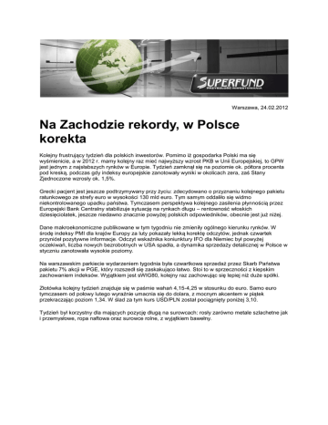 Warszawa, 24.02.2012 Na Zachodzie rekordy, w Polsce korekta Kolejny frustrujący tydzień dla polskich inwestorów. Pomimo iż gospodarka Polski ma się wyśmienicie, a w 2012 r. mamy kolejny raz mieć najwyższy wzrost PKB w Unii Europejskiej, to GPW jest jednym z najsłabszych rynków w Europie. Tydzień zamknął się na poziomie ok. półtora procenta pod kreską, podczas gdy indeksy europejskie zanotowały wyniki w okolicach zera, zaś Stany Zjednoczone wzrosły ok. 1,5%. Grecki pacjent jest jeszcze podtrzymywany przy życiu: zdecydowano o przyznaniu kolejnego pakietu ratunkowego ze strefy euro w wysokości 130 mld euro. Tym samym oddaliło się widmo niekontrolowanego upadku państwa. Tymczasem perspektywa kolejnego zasilenia płynnością przez Europejski Bank Centralny stabilizuje sytuację na rynkach długu – rentowność włoskich dziesięciolatek, jeszcze niedawno znacznie powyżej polskich odpowiedników, obecnie jest już niżej. Dane makroekonomiczne publikowane w tym tygodniu nie zmieniły ogólnego kierunku rynków. W środę indeksy PMI dla krajów Europy za luty pokazały lekką korektę odczytów, jednak czwartek przyniósł pozytywne informacje. Odczyt wskaźnika koniunktury IFO dla Niemiec był powyżej oczekiwań, liczba nowych bezrobotnych w USA spadła, a dynamika sprzedaży detalicznej w Polsce w styczniu zanotowała wysokie poziomy. Na warszawskim parkiecie wydarzeniem tygodnia była czwartkowa sprzedaż przez Skarb Państwa pakietu 7% akcji w PGE, który rozszedł się zaskakująco łatwo. Stoi to w sprzeczności z kiepskim zachowaniem indeksów. Wyjątkiem jest sWIG80, kolejny raz zachowując się lepiej niż duże spółki. Złotówka kolejny tydzień znajduje się w paśmie wahań 4,15-4,25 w stosunku do euro. Samo euro tymczasem od połowy lutego wyraźnie umacnia się do dolara, z mocnym akcentem w piątek przekraczając poziom 1,34. W ślad za tym kurs USD/PLN został pociągnięty poniżej 3,10. Tydzień był korzystny dla mających pozycję długą na surowcach: rosły zarówno metale szlachetne jak i przemysłowe, ropa naftowa oraz surowce rolne, z wyjątkiem bawełny. Departament Zarządzania i Analiz Infolinia: 0 801 588 188, +48 22 556 88 62 (od poniedziałku do piątku 9:00 - 17:30) Superfund TFI SA, Plac Trzech Krzyży 18, 00-499 Warszawa, www.superfund.pl