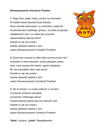 Stowarzyszenie Umarłych Poetów 1. Tego dnia, pękło niebo, prosto na mą twarz! W oddali ludzie słyszeli krzyk kobiety, która utraciła swój skarb, co miał tylko z pięć lat! W płomieniach ludzkiego gniewu, za wiele przepada zabłąkanych serc, co miały być przecież, najcenniejszą solą tej ziemi! Dopóki to się nie zmieni, dopóty śpiewać będzie o tym, nasze Stowarzyszenie Umarłych Poetów! 2. Życie bez marzeń to tylko kilka pochmurnych dni! Człowiek w ciemnościach, szuka jakiegoś znaku, żeby mieć szanse dla siebie i garść pieniędzy. Bo nie wszystkim dano tyle samo! Dopóki to się nie zmieni, dopóty śpiewać będzie o tym, nasze Stowarzyszenie Umarłych Poetów! 3. Zło to karzeł, co urosło ludziom w oczach, a przecież powinno się lękać, szczerości oddanego serca! Dopóki będzie więcej wad niż dobrych rad! Dopóki to się nie zmieni, dopóty śpiewać będzie o tym, nasze Stowarzyszenie Umarłych Poetów! Tekst: Justyna „Justa” Margielewska
