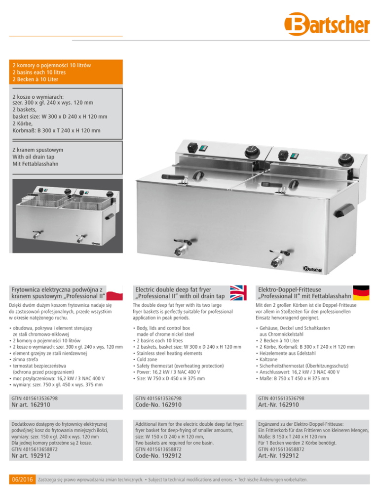 2 komory o pojemności 10 litrów 2 basins each 10 litres 2 Becken à 10 Liter 2 kosze o wymiarach: szer. 300 x gł. 240 x wys. 120 mm 2 baskets, basket size: W 300 x D 240 x H 120 mm 2 Körbe, Korbmaß: B 300 x T 240 x H 120 mm Z kranem spustowym With oil drain tap Mit Fettablasshahn Frytownica elektryczna podwójna z kranem spustowym „Professional II“ Electric double deep fat fryer „Professional II“ with oil drain tap Elektro-Doppel-Fritteuse „Professional II“ mit Fettablasshahn Dzięki dwóm dużym koszom frytownica nadaje się do zastosowań profesjonalnych, przede wszystkim w okresie natężonego ruchu. The double deep fat fryer with its two large fryer baskets is perfectly suitable for professional application in peak periods. Mit den 2 großen Körben ist die Doppel-Fritteuse vor allem in Stoßzeiten für den professionellen Einsatz hervorragend geeignet. • obudowa, pokrywa i element sterujący ze stali chromowo-niklowej • 2 komory o pojemności 10 litrów • 2 kosze o wymiarach: szer. 300 x gł. 240 x wys. 120 mm • element grzejny ze stali nierdzewnej • zimna strefa • termostat bezpieczeństwa (ochrona przed przegrzaniem) • moc przyłączeniowa: 16,2 kW / 3 NAC 400 V • wymiary: szer. 750 x gł. 450 x wys. 375 mm • Body, lids and control box made of chrome nickel steel • 2 basins each 10 litres • 2 baskets, basket size: W 300 x D 240 x H 120 mm • Stainless steel heating elements • Cold zone • Safety thermostat (overheating protection) • Power: 16,2 kW / 3 NAC 400 V • Size: W 750 x D 450 x H 375 mm • Gehäuse, Deckel und Schaltkasten aus Chromnickelstahl • 2 Becken à 10 Liter • 2 Körbe, Korbmaß: B 300 x T 240 x H 120 mm • Heizelemente aus Edelstahl • Kaltzone • Sicherheitsthermostat (Überhitzungsschutz) • Anschlusswert: 16,2 kW / 3 NAC 400 V • Maße: B 750 x T 450 x H 375 mm GTIN 4015613536798 GTIN 4015613536798 GTIN 4015613536798 Dodatkowo dostępny do frytownicy elektrycznej podwójnej: kosz do frytowania mniejszych ilości, wymiary: szer. 150 x gł. 240 x wys. 120 mm Dla jednej komory potrzebne są 2 kosze. GTIN 4015613658872 Additional item for the electric double deep fat fryer: fryer basket for deep-frying of smaller amounts, size: W 150 x D 240 x H 120 mm, Two baskets are required for one basin. GTIN 4015613658872 Ergänzend zu der Elektro-Doppel-Fritteuse: Ein Frittierkorb für das Frittieren von kleineren Mengen, Maße: B 150 x T 240 x H 120 mm Für 1 Becken werden 2 Körbe benötigt. GTIN 4015613658872 Nr art. 162910 Nr art. 192912 06/2016 Code-No. 162910 Code-No. 192912 Art.-Nr. 162910 Art.-Nr. 192912 Zastrzega się prawo wprowadzania zmian technicznych. • Subject to technical modifications and errors. • Technische Änderungen vorbehalten.