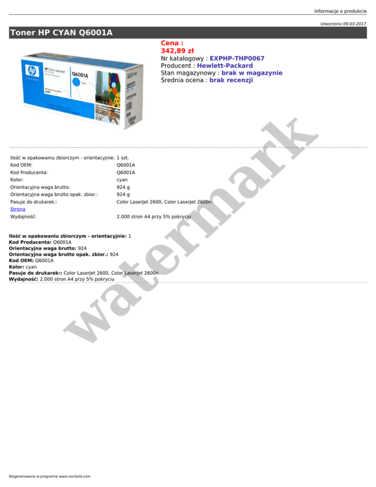 Informacje o produkcie Utworzono 09-03-2017 Toner HP CYAN Q6001A Cena : 342,89 zł er m ar k Nr katalogowy : EXPHP-THP0067 Producent : Hewlett-Packard Stan magazynowy : brak w magazynie Średnia ocena : brak recenzji Ilość w opakowaniu zbiorczym - orientacyjnie: 1 szt. Kod OEM: Q6001A Kod Producenta: Q6001A Kolor: cyan Orientacyjna waga brutto: Orientacyjna waga brutto opak. zbior.: Pasuje do drukarek:: 924 g 924 g Color LaserJet 2600, Color LaserJet 2600n Strona Wydajność: 2.000 stron A4 przy 5% pokryciu w at Ilość w opakowaniu zbiorczym - orientacyjnie: 1 Kod Producenta: Q6001A Orientacyjna waga brutto: 924 Orientacyjna waga brutto opak. zbior.: 924 Kod OEM: Q6001A Kolor: cyan Pasuje do drukarek:: Color LaserJet 2600, Color LaserJet 2600n Wydajność: 2.000 stron A4 przy 5% pokryciu Wygenerowano w programie www.oscGold.com