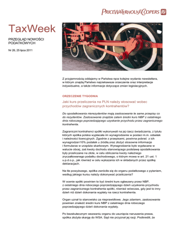 TaxWeek PRZEGLĄD NOWOŚCI PODATKOWYCH Nr 26, 25 lipca 2011 Z przyjemnością oddajemy w Państwa ręce kolejne wydanie newslettera, w którym znajdą Państwo najciekawsze orzeczenia oraz interpretacje indywidualne, a także informacje dotyczące zmian legislacyjnych. ORZECZENIE TYGODNIA Jaki kurs przeliczenia na PLN należy stosować wobec przychodów zagranicznych kontrahentów? Do opodatkowania nierezydentów mają zastosowanie te same przepisy co do rezydentów. Zastosowanie znajdzie zatem średni kurs NBP z ostatniego dnia roboczego poprzedzającego uzyskanie przychodu przez zagranicznego kontrahenta. Zagraniczni kontrahenci spółki wykonywali na jej rzecz świadczenia, z tytułu których spółka polska wypłacała im wynagrodzenie w postaci m.in. odsetek i należności licencyjnych. Zgodnie z przepisami, powinna pobrać z ich wynagrodzeń10% podatek u źródła,oraz złożyć stosowne informacje i formularze w urzędzie skarbowym. Wynagrodzenie było wypłacane w walucie obcej, zaś kwoty dochodu stanowiącego podstawę opodatkowania były przeliczane na złote, w celu obliczenia kwoty należnego zryczałtowanego podatku dochodowego, o którym mowa w art. 21 ust. 1 u.p.d.o.p., jak również w celu wykazania ich w składanych przez spółkę deklaracjach. Na tle powyższego, spółka zwróciła się do organu podatkowego z pytaniem, według jakiego kursu należy dokonywać przeliczenia? W ocenie spółki powinien to być średni kurs ogłaszany przez NBP, z ostatniego dnia roboczego poprzedzającego dzień uzyskania przychodu przez zagranicznego kontrahenta spółki, również wówczas, gdy jest to inny dzień niż dzień dokonania wypłaty na rzecz kontrahenta. Organ uznał to stanowisko za nieprawidłowe. Jego zdaniem, zastosowanie powinien znaleźć średni kurs NBP z ostatniego dnia roboczego poprzedzającego dzień dokonania wypłaty. Po bezskutecznym wezwaniu organu do usunięcia naruszenia prawa, spółka złożyła skargę do WSA. Sąd nie przyznał jej racji. Podkreślił, że TaxWeek Polska PwC Nr 26, 25 lipca 2011 Strona 2 w przedmiotowej sprawie występuje dualizm podmiotów – jeden realizuje przychód (jest podatnikiem), drugi zaś pełni obowiązki płatnika. Przepisy nie wskazują jednoznacznie, jaki kurs powinien znaleźć zastosowanie w tej sytuacji. Za decydującą okoliczność WSA uznał fakt, że spółka - jako płatnik - jest zobowiązana pobierać w dniu dokonania wypłaty zryczałtowany podatek dochodowy. Dzień wypłaty należności nierezydentowi musi być zatem potraktowany jako dzień uzyskania przez niego przychodu, w konsekwencji czego należy zastosować kurs waluty obcej z tego dnia. Spółka złożyła skargę kasacyjną. NSA uwzględnił ją. Zauważył, że interpretacja przepisów dokonana przez organ podatkowy i sąd I instancji stoi w sprzeczności z wykładnią celowościową, systemową, a nawet językową. Zdaniem sądu, ustawodawca, nakazując płatnikom pobranie zryczałtowanego podatku dochodowego w dniu dokonywania wypłaty podlegającej takiemu opodatkowaniu należności, przyjął zasadę poboru podatku u źródła. Sposób jego dokonania nie zmienia natomiast samego momentu powstania przychodu. W opinii NSA, zastosowanie znajdzie zatem średni kurs NBP z ostatniego dnia roboczego poprzedzającego uzyskanie przychodu przez zagranicznego kontrahenta. (Wyrok Naczelnego Sądu Administracyjnego z 2 czerwca 2011 r.) INTERPRETACJA TYGODNIA Potwierdzone przez kontrahentów zwrotki pocztowe a odbiór faktury korygującej Posiadanie zwrotek pocztowych potwierdzonych przez kontrahentów, z których jednoznacznie wynika, jakich faktur korygujących dotyczą, spełnia warunek posiadania potwierdzenia odbioru faktury korygującej przez nabywcę w świetle art. 29 ust. 4a u.p.t.u. i tym samym upoważnia do obniżenia podstawy opodatkowania VAT wynikającej z tych korekt. Spółka prowadzi na polskim rynku działalność w zakresie dystrybucji napojów alkoholowych i produktów winiarskich. Dostarcza je do hurtowni spożywczych, sieci marketów, sklepów spożywczych, restauracji oraz barów, zaś z tytułu zawieranych transakcji wystawia faktury VAT. W związku z tym, niekiedy musi dokonać korekty sprzedaży poprzez wystawienie faktur korygujących zmniejszających podstawę opodatkowania. W wielu przypadkach, spółka wysyła do kontrahentów faktury korygujące zmniejszające listem poleconym za potwierdzeniem odbioru (tzw. „zwrotka pocztowa”), na którym znajduje się informacja o numerze faktury korygującej zawartej w przesyłce. Kiedy kontrahent otrzyma przesyłkę, potwierdza jej odbiór umieszczając na zwrotce swój podpis i datę odbioru. Następnie zwrotka jest przesyłana do spółki, która na tej podstawie zamierza dokonywać obniżenia podstawy opodatkowania podatkiem VAT, wynikającej z wystawionej faktury korygującej. W związku z powyższym, spółka zwróciła się do organu podatkowego z wnioskiem o interpretację w którym zapytała, czy prawidłowy jest pogląd, że posiadanie przez nią zwrotek pocztowych potwierdzonych przez kontrahentów, z których jednoznacznie wynika, jakich faktur korygujących dotyczą, spełnia warunek posiadania potwierdzenia odbioru faktury korygującej przez nabywcę w świetle art. 29 ust. 4a u.p.t.u. Tym samym, TaxWeek Polska PwC Nr 26, 25 lipca 2011 Strona 3 spółka jest upoważniona do obniżenia podstawy opodatkowania VAT wynikającej z tych korekt. Spółka podkreśliła, że ustawodawca nie sprecyzował, w jakiej formie nabywca ma dokonać potwierdzenia odbioru faktury korygującej. Nie ma zatem przeszkód, by przybrało ono postać zwrotnego potwierdzenia odbioru (zwrotki pocztowej). Dodatkowo, ze względu na fakt, że na zwrotce jest wskazany numer faktury korygującej, która została wysłana w przesyłce, w prosty sposób można przypisać poszczególne potwierdzenia do konkretnych faktur zmniejszających. Dyrektor Izby Skarbowej przychylił się do wszystkich poglądów zapr