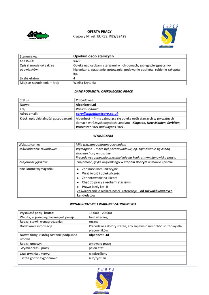 OFERTA PRACY Krajowy Nr ref. EURES: KBS/32429 Opiekun osób starszych 5329 Opieka nad osobami starszymi w ich domach, zabiegi pielęgnacyjnohigieniczne, sprzątanie, gotowanie, podawanie posiłków, robienie zakupów, itp. 4 Wielka Brytania Stanowisko: Kod ISCO: Opis stanowiska/ zakres obowiązków: Liczba etatów: Miejsce zatrudnienia – kraj: DANE PODMIOTU OFERUJĄCEGO PRACĘ Status: Nazwa: Kraj: Adres email: Krótki opis działalności gospodarczej: Pracodawca Alpenbest Ltd Wielka Brytania [email protected] Alpenbest - firma zajmująca się opieką osób starszych w prywatnych domach w różnych częściach Londynu - Kingston, New Malden, Surbiton, Worcester Park and Raynes Park. WYMAGANIA Wykształcenie: Doświadczenie zawodowe: Mile widziane związane z zawodem Wymagane - może być pozazawodowe, np. zajmowanie się osobą starszą/chorą w rodzinie. Pracodawca zapewnia przeszkolenie na konkretnym stanowisku pracy. Znajomość języka angielskiego w stopniu dobrym w mowie i piśmie. Znajomość języków: Inne istotne wymagania: Zdolności komunikacyjne Wrażliwość i opiekuńczość Zorientowanie na klienta Chęć do pracy z osobami starszymi Prawo jazdy kat. B Zaświadczenie o niekaralności i referencje – od zakwalifikowanych kandydatów WYNAGRODZENIE I WARUNKI ZATRUDNIENIA Wysokość pensji brutto: Waluta, w jakiej wypłacana jest pensja: Rodzaj stawki wynagrodzenia: Dodatkowe informacje: Nazwa firmy, z którą zostanie podpisana umowa: Rodzaj umowy: Wymiar czasu pracy Czas trwania umowy: Liczba godzin tygodniowo: 15.000 – 20.000 funt szterling roczna Pracodawca dołoży starań, aby zapewnić samochód służbowy dla pracowników Alpenbest Ltd umowa o pracę pełen etat nieokreślony 40h/tydzień Zmiany i praca w dni wolne: praca zmianowa, także w nocy - od poniedziałku do niedzieli Zakwaterowanie: Pomoc pracodawcy w znalezieniu zakwaterowania Data rozpoczęcia: do uzgodnienia z pracodawcą SPOSÓB SKŁADANIA WNIOSKU Wymagane dokumenty CV w języku angielskim należy przesyłać do doradcy EURES – WUP Białystok – z dopiskiem – opiekun osób starszych – Wielka Brytania - Alpenbest Dane teleadresowe doradcy EURES lub przedstawiciela pracodawcy: (nazwisko, adres, telefon, fax, e-mail itp.) Beata Chrościńska, email: [email protected] Tel. 85 7497 235, fax 85 7497 209 Data publikacji: Termin przedkładania podań o pracę / zakończenia ważności oferty: WAŻNOŚĆ 08.01.2013 r. Do odwołania Uprzejmie informujemy, że pracodawca skontaktuje się wyłącznie z wybranymi kandydatami. UWAGA: 1. Umowa z zagranicznym pracodawcą zostanie zawarta zgodnie z prawem kraju zatrudnienia. Oznacza to, że wszystkie roszczenia odnośnie do warunków, które obejmuje umowa, można kierować wyłącznie do odpowiedniego sądu w kraju zatrudnienia. Publiczne służby zatrudnienia (EURES) nie mogą pośredniczyć ani reprezentować pracownika w sądzie kraju zatrudnienia w przypadku sporu z pracodawcą. 2. Publiczne służby zatrudnienia (EURES) dokładają wszelkich starań, aby zapewnić rzetelność i wiarygodność ofert pracy zgłoszonych w lokalnym urzędzie pracy. Należy wyjaśnić, że oferta pracy została zgłoszona przez stronę trzecią i EURES nie odpowiada za ewentualne rozbieżności między warunkami pracy określonymi w ofercie pracy i warunkami oferowanymi przez potencjalnego pracodawcę. 3. Publiczne służby zatrudnienia (EURES) informują, że będą zbierać, przetwarzać i przekazywać potencjalnym pracodawcom zgodnie z przepisami dotyczącymi ochrony danych osobowych wszystkie dane osobowe dostarczone przez osoby poszukujące pracy.