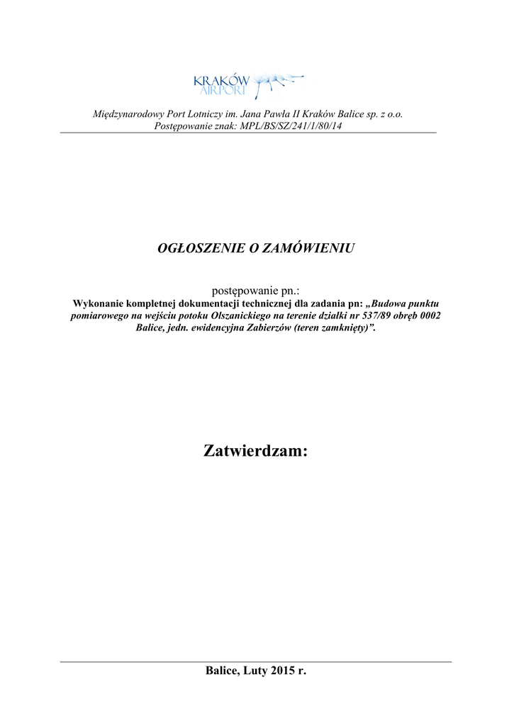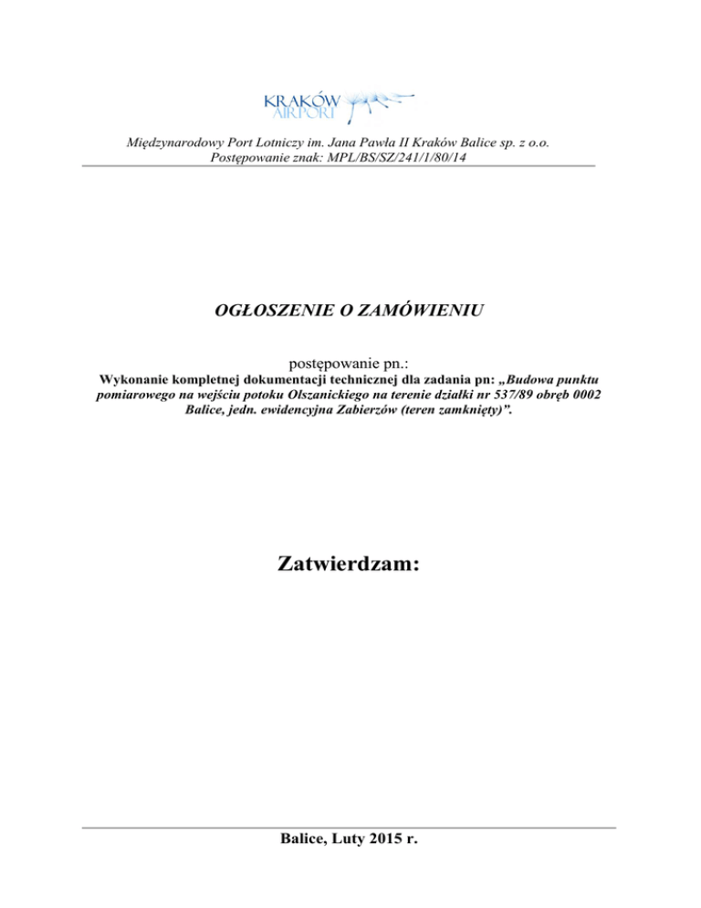 Międzynarodowy Port Lotniczy im. Jana Pawła II Kraków Balice sp. z o.o. Postępowanie znak: MPL/BS/SZ/241/1/80/14 OGŁOSZENIE O ZAMÓWIENIU postępowanie pn.: Wykonanie kompletnej dokumentacji technicznej dla zadania pn: „Budowa punktu pomiarowego na wejściu potoku Olszanickiego na terenie działki nr 537/89 obręb 0002 Balice, jedn. ewidencyjna Zabierzów (teren zamknięty)”. Zatwierdzam: Balice, Luty 2015 r. Międzynarodowy Port Lotniczy im. Jana Pawła II Kraków - Balice Sp. z o. o. I. NAZWA ORAZ ADRES ZAMAWIAJĄCEGO Nazwa Zamawiającego Adres REGON NIP KRS Znak postępowania Uwaga: w korespondencji kierowanej do Zamawiającego należy posługiwać się tym znakiem Godziny pracy Adres strony internetowej Międzynarodowy Port Lotniczy im. Jana Pawła II Kraków – Balice sp. z o. o. ul. kpt. M. Medweckiego 1, 32-083 Balice 351117055 676-13-36-952 0000008522 MPL/BS/SZ/241/1/80/14 od 700 do 1500 od poniedziałku do piątku za wyjątkiem dni ustawowo uznanych za dni wolne od pracy www.krakowairport.pl II. TRYB UDZIELENIA ZAMÓWIENIA Zamówienie sektorowe doprogowe udzielone zostanie w trybie aukcji elektronicznej na podstawie § 28(1) Regulaminu udzielania zamówień publicznych oraz doprogowych przez jednostki organizacyjne Międzynarodowego Portu Lotniczego im. Jana Pawła II KrakówBalice Sp. z o.o. na roboty budowlane, dostawy i usługi – wprowadzonego do stosowania w Spółce Uchwałą nr 30/155/06 z dnia 29 grudnia 2006 r. ( z późniejszymi zmianami).– dalej zwany Regulaminem udzielania zamówień oraz w oparciu o Regulamin korzystania z platformy zakupowej Logintrade oraz postanowienia niniejszego ogłoszenia. Tekst jednolity Regulaminu udzielania zamówień dostępny na stronie internetowej Zamawiającego pod adresem: http://www.krakowairport.pl/pl/lotnisko,c94/przetargi,c109/regulamin,a316.html, natomiast Regulaminu korzystania z platformy zakupowej Logintrade pod adresem: https://balice.logintrade.net/rejestracja/regulamin.html. Przepisy ustawy Prawo zamówień publicznych z dnia 29 stycznia 2004 r. nie mają zastosowania. III. OPIS PRZEDMIOTU ZAMÓWIENIA Część 1 – Sporządzenie dokumentacji projektowej, zawierającej w szczególności: a) b) c) d) e) Projekt budowlany, Projekty wykonawcze dla wszystkich branż objętych Projektem Budowlanym, Przedmiary robót, Kosztorysy inwestorskie, Specyfikacje techniczne wykonania i odbioru robót budowlanych. Postępowanie pn.: „Budowa punktu pomiarowego na wejściu potoku Olszanickiego na terenie działki nr 537/89 obręb 0002 Balice, jedn. ewidencyjna Zabierzów (teren zamknięty)”. Postępowanie znak: MPL/BS/SZ/241/1/80/14 2 Międzynarodowy Port Lotniczy im. Jana Pawła II Kraków - Balice Sp. z o. o. Wytyczne dotyczące punktu pomiarowego na wejściu potoku Olszanickiego: - budowa studni prowadzona będzie na istniejącym rurociągu Dn 800 będącym zarurowanym odcinkiem potoku Olszanickiego, - średnica studni Dn 2000, - głębokość studni dostosować tak aby rurociąg wraz z urządzeniem mierzącym znajdował się poniżej strefy przemarzania gruntu, - kręgi żelbetowe Dn 2000 osadzić na podmurówce z cegły kanalizacyjnej, klinkierowej kl. min 250 wymurowanej do wysokości 1-2 warstw ponad przewód kanalizacyjny, - wyniesienie studni ponad teren 0,5 m i wykonanie skarp o nachyleniu 1:2, - studnię należy wyposażyć we właz żeliwny typu D400, - przejście rurociągu przez ścianki nowej studni należy wykonać w sposób szczelny, - przepływomierz modułowy dostosowany do zabudowy w rurociągu Dn 800 o stopniu szczelności IP68, - modem GSM umożliwiający zdalną transmisję danych. Import wyników z przepływomierza oraz ich wizualizacja poprzez dołączone oprogramowanie. System musi być kompatybilny z istniejącymi na lotnisku modułami GSM i istniejącym oprogramowaniem odczytu przepływów, - panel słoneczny ok. 110 W (zasilanie buforowe) wraz z konstrukcją wsporczą, akumulator ok.100 Ahr, kabel połączeniowy do systemu, - izolowana szafa osłonowa przepływomierza oraz modem GSM wyposażony w grzałkę, fltr przeciwnapięciowy, zamek patentowy, Urządzenie pomiarowe należy dobrać tak, aby możliwe było zintegrowanie danych uzyskanych w wyniku pomiaru, z posiadanym przez MPL komputerowym „systemem podglądu i sterowania systemem odprowadzania wód opadowych z drogi startowej, dróg kołowania oraz płaszczyzn postojowych samolotów” firmy ABIS Sp. z o.o. Poniżej opis systemu z Instrukcji obsługi, konserwacji i eksploatacji instalacji elektrycznej. Postępowanie pn.: „Budowa punktu pomiarowego na wejściu potoku Olszanickiego na terenie działki nr 537/89 obręb 0002 Balice, jedn. ewidencyjna Zabierzów (teren zamknięty)”. Postępowanie znak: MPL/BS/SZ/241/1/80/14 3 Międzynarodowy Port Lotniczy im. Jana Pawła II Kraków - Balice Sp. z o. o. Część 2 - Uzyskanie w imieniu i na rzecz Zamawiającego stosownych uzgodnień, pozwoleń i decyzji, wymaganych obowiązującymi przepisami prawa, które umożliwiają realizację przedmiotowej inwestycji, a w szczególności: a) Opinii Zespołu Uzgodnień Dokumentacji Projektowej (dalej ZUDP), b) Decyzję Pozwolenia na Budowę (dalej PnB). Uzgodnienia, pozwolenia i decyzje będące w posiadaniu Zamawiającego: a) Uzgodnienie z JW1155, b) Uzgodnienie z JW4658, c) Uzgodnienie z Rejonowym Zarządem Infrastruktury w Krakowie, d) Zezwolenie Prezesa ULC na wprowadzenie zmiany eksploatacyjnej i technicznej cech lotniska Kraków-Balice, e) Uzgodnienie Dowódcy Generalnego Rodzajów Sił Zbrojnych, f) Decyzja o ustaleniu lokalizacji inwestycji celu publicznego, g) Decyzja pozwolenia wodnoprawnego na wykonanie studni pomiarowej. Postępowanie pn.: „Budowa punktu pomiarowego na wejściu potoku Olszanickiego na terenie działki nr 537/89 obręb 0002 Balice, jedn. ewidencyjna Zabierzów (teren zamknięty)”. Postępowanie znak: MPL/BS/SZ/241/1/80/14 4 Międzynarodowy Port Lotniczy im. Jana Pawła II Kraków - Balice Sp. z o. o. Jeżeli w toku uzys