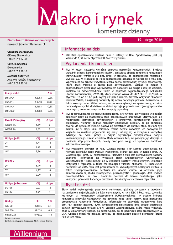 19 lutego 2016 Biuro Analiz Makroekonomicznych [email protected] Informacje na dziś Grzegorz Maliszewski Główny Ekonomista +48 22 598 22 38 US: Dziś opublikowane zostaną dane o inflacji w USA. Spodziewany jest jej wzrost do 1,3% r/r w styczniu z 0,7% r/r w grudniu. Wydarzenia i komentarze Urszula Kryńska Ekonomistka +48 22 598 20 10 PL: W lutym nastąpiła wyraźna poprawa nastrojów konsumenckich. Bieżący wskaźnik ufności konsumenckiej (BWUK), opisujący obecne tendencje konsumpcji indywidualnej wzrósł o 0,8 pkt. proc. w stosunku do poprzedniego miesiąca i wyniósł 6,2. W stosunku do roku poprzedniego oznacza to wzrost aż o 10,2 pkt. Wpłynęła na to przede wszystkim lepsza ocena oczekiwanej sytuacji finansowej, która drugi miesiąc z rzędu była optymistyczna. Wiązać to można z zapowiadanym przez rząd wprowadzeniem dodatków na drugie i kolejne dziecko. Znalazło to odzwierciedlenie także w poprawie wyprzedzającego wskaźnika ufności konsumenckiej (WWUK), który w lutym wzrósł do -8,2 pkt. z -10,9 pkt. w styczniu. To aż o 13,5 pkt. wyżej niż przed rokiem. Wzrosły wszystkie składowe indeksu WWUK, a najsilniej poprawiły się oceny dotyczące poziomu bezrobocia, a także oszczędzania. Widać zatem, że poprawa sytuacji na rynku pracy, a także perspektywa wypłat dodatków na dzieci sprzyja poprawie nastrojów gospodarstw domowych, co może wesprzeć konsumpcję prywatną. PL: Ze sprawozdania po lutowym posiedzeniu RPP wynika, że w ocenie większości członków Rady za stabilizacją stóp procentowych przemawia utrzymująca się niepewność dotycząca zewnętrznych i krajowych uwarunkowań polityki pieniężnej. Niemniej jednak niektórzy członkowie oceniali, że po obniżeniu awersji do ryzyka na świecie pojawi się przestrzeń do obniżek stóp, zaś inni byli zdania, że w ciągu kilku miesięcy trzeba będzie rozważyć ich podwyżki ze względu na możliwe pojawienie się presji inflacyjnej w związku z korzystną sytuację na rynku pracy i ryzyko wyraźnego przyspieszenia popytu konsumpcyjnego. Część członków Rady oceniała też, że podejmując decyzje o poziomie stóp procentowych, należy brać pod uwagę ich wpływ na stabilność sektora finansowego. PL: Prezydent powołał dr hab. Łukasza Hardta i dr Kamila Zubelewicza na nowych członków Rady Polityki Pieniężnej, którzy zastąpią w Radzie prof. A. Glapińskiego i prof. A. Kaźmierczaka. Pierwszy z nich jest kierownikiem Katedry Ekonomii Politycznej na Wydziale Nauk Ekonomicznych Uniwersytetu Warszawskiego i specjalizuje się w ekonomii kosztów transakcyjnych, ekonomii instytucji i regulacji, a także metodologii i filozofii ekonomii. K. Zubelewicz natomiast od 2015 roku jest prorektorem ds. dydaktycznych Collegium Civitas, a także współpracownikiem Centrum im. Adama Smitha. W obszarze jego zainteresowań są studia strategiczne, prozopografia i genealogia. Jest wysoce prawdopodobne, że prof. Glapiński powróci do banku centralnego, jako kandydat, ponieważ kadencja prezesa M. Belki upływa w czerwcu tego roku. Mateusz Sutowicz Analityk rynków finansowych +48 22 598 22 36 Kursy walut Δ% EUR/PLN 4,3763 -0,6% USD/PLN 3,9478 0,0% CHF/PLN 3,9653 -0,8% EUR/USD 1,1088 -0,5% Rynek Pieniężny (%) Δ bps WIBOR 1M 1,59 0 WIBOR 3M 1,69 0 Obligacje PL (%) Δ bps 2Y 1,44 -4 5Y 2,22 -3 10Y 2,96 -4 IRS PLN (%) Δ bps 2Y 1,49 -3 5Y 1,77 -4 10Y 2,29 -2 Obligacje bazowe (%) Δ bps DE 10Y 0,23 -2 US 10Y 1,79 3 Giełdy pkt. Δ% WIG 30 2068,6 0,4 S&P 500 1917,8 -0,5 Nikkei 225 15967,2 -1,4 Źródło: Reuters Rynki na dziś Złoty nadal wykorzystuje pozytywny sentyment globalny związany z łagodnym nastawieniem największych banków centralnych, w tym EBC i Fed, oraz czynniku krajowym tj. komentarzy wicepremiera M.Morawieckiego, w ocenie którego konwersja kredytów walutowych nie powinna mieć takiej formy, jaką pierwotnie proponowała Kancelaria Prezydenta. Informacje te pozwalają utrzymywać kurs EUR/PLN poniżej poziomu 4,40. Wydarzeniem dzisiejszego dnia będzie publikacja danych dotyczących inflacji CPI w Stanach Zjednoczonych, która może wpłynąć, choć w umiarkowany sposób, na oczekiwania, co do podwyżek stóp procentowych w USA. Obecnie rynek nie zakłada powrotu do normalizacji polityki pieniężnej przez Fed w tym roku. Zamknięcia dnia poprzedniego godz. 16.30, zmiana dzienna `Makro i rynek komentarz dzienny str. 1 Rynek krajowy Kursy walutowe EUR/PLN i EUR/USD 4,50 1,14 4,45 1,12 4,40 4,35 1,10 4,30 1,08 4,25 1,06 4,20 4,15 1,04 EURPLN EURUSD /prawa skala/ Źródło: Reuters Rentowności polskich obligacji [%] 3,8 Czwartek przyniósł kontynuację łagodnego umocnienia złotego, po którym kurs EUR/PLN przejściowo zniżkował do poziomu 4,3708 tj. minimum z 15 stycznia – dnia, gdy agencja ratingowa Standard and Poor’s ogłosiła obniżkę oceny wiarygodności Polski. Wsparciem dla polskiej waluty, poza łagodną retoryką największych banków centralnych wyrażoną między innymi wczorajszymi minutes ze styczniowego posiedzenia Europejskiego Banku Centralnego, pozostawały komentarze M.Morawieckiego, w ocenie którego konwersja kredytów walutowych nie powinna mieć takiej formy jaką pierwotnie proponowała Kancelaria Prezydenta. Wczoraj na dzień przed kończącą się kadencją dwóch członków Rady Polityki Pieniężnej prezydent wyznaczył następców A.Glapińskiego i A.Kaźmierczaka. Nowymi przedstawicielami w RPP zostali Ł.Hardt i K.Zubelewicz. Rynek długu nie zareagował jednak na tę informację. Najważniejszym wydarzeniem wczorajszej sesji na rynku SPW była aukcja na której Ministerstwo Finansów sprzedało obligacje PS0421 za 4,36 mld PLN przy popycie 7,32 mld PLN i rentowności 2,219% oraz obligacje WZ0120 za 1,67 mld PLN przy popycie 4,44 mld PLN. Resort zdecydował ponadto o zorganizowaniu aukcji uzupełniającej, na której sprzedał obligacje WZ0120 za 0,40 mld PLN przy popycie 1,42 mld PLN oraz PS0421 za 0,81 mld PLN przy popycie 1,85 mld