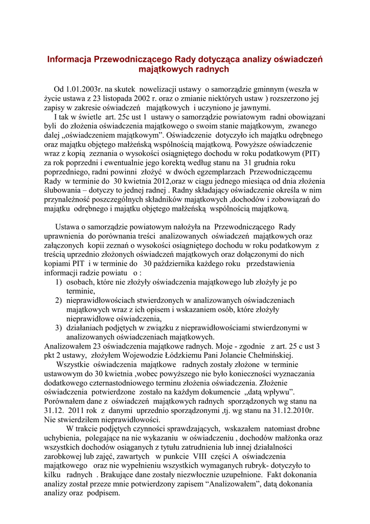 Informacja Przewodniczącego Rady dotycząca analizy oświadczeń majątkowych radnych Od 1.01.2003r. na skutek nowelizacji ustawy o samorządzie gminnym (weszła w życie ustawa z 23 listopada 2002 r. oraz o zmianie niektórych ustaw ) rozszerzono jej zapisy w zakresie oświadczeń majątkowych i uczyniono je jawnymi. I tak w świetle art. 25c ust 1 ustawy o samorządzie powiatowym radni obowiązani byli do złożenia oświadczenia majątkowego o swoim stanie majątkowym, zwanego dalej „oświadczeniem majątkowym”. Oświadczenie dotyczyło ich majątku odrębnego oraz majątku objętego małżeńską wspólnością majątkową. Powyższe oświadczenie wraz z kopią zeznania o wysokości osiągniętego dochodu w roku podatkowym (PIT) za rok poprzedni i ewentualnie jego korektą według stanu na 31 grudnia roku poprzedniego, radni powinni złożyć w dwóch egzemplarzach Przewodniczącemu Rady w terminie do 30 kwietnia 2012,oraz w ciągu jednego miesiąca od dnia złożenia ślubowania – dotyczy to jednej radnej . Radny składający oświadczenie określa w nim przynależność poszczególnych składników majątkowych ,dochodów i zobowiązań do majątku odrębnego i majątku objętego małżeńską wspólnością majątkową. Ustawa o samorządzie powiatowym nałożyła na Przewodniczącego Rady uprawnienia do porównania treści analizowanych oświadczeń majątkowych oraz załączonych kopii zeznań o wysokości osiągniętego dochodu w roku podatkowym z treścią uprzednio złożonych oświadczeń majątkowych oraz dołączonymi do nich kopiami PIT i w terminie do 30 października każdego roku przedstawienia informacji radzie powiatu o : 1) osobach, które nie złożyły oświadczenia majątkowego lub złożyły je po terminie, 2) nieprawidłowościach stwierdzonych w analizowanych oświadczeniach majątkowych wraz z ich opisem i wskazaniem osób, które złożyły nieprawidłowe oświadczenia, 3) działaniach podjętych w związku z nieprawidłowościami stwierdzonymi w analizowanych oświadczeniach majątkowych. Analizowałem 23 oświadczenia majątkowe radnych. Moje - zgodnie z art. 25 c ust 3 pkt 2 ustawy, złożyłem Wojewodzie Łódzkiemu Pani Jolancie Chełmińskiej. Wszystkie oświadczenia majątkowe radnych zostały złożone w terminie ustawowym do 30 kwietnia ,wobec powyższego nie było konieczności wyznaczania dodatkowego czternastodniowego terminu złożenia oświadczenia. Złożenie oświadczenia potwierdzone zostało na każdym dokumencie „datą wpływu”. Porównałem dane z oświadczeń majątkowych radnych sporządzonych wg stanu na 31.12. 2011 rok z danymi uprzednio sporządzonymi ,tj. wg stanu na 31.12.2010r. Nie stwierdziłem nieprawidłowości. W trakcie podjętych czynności sprawdzających, wskazałem natomiast drobne uchybienia, polegające na nie wykazaniu w oświadczeniu , dochodów małżonka oraz wszystkich dochodów osiąganych z tytułu zatrudnienia lub innej działalności zarobkowej lub zajęć, zawartych w punkcie VIII części A oświadczenia majątkowego oraz nie wypełnieniu wszystkich wymaganych rubryk- dotyczyło to kilku radnych . Brakujące dane zostały niezwłocznie uzupełnione. Fakt dokonania analizy został przeze mnie potwierdzony zapisem “Analizowałem”, datą dokonania analizy oraz podpisem. W związku z tym, że nie stwierdziłem nieprawidłowości, nie powziąłem podejrzenia ,że którakolwiek z osób składających oświadczenie podała w nim nieprawdę lub zataiła prawdę, nie było potrzeby wystąpienia do dyrektora urzędu kontroli skarbowej właściwego ze względu na miejsce zamieszkania osoby składającej oświadczenie z wnioskiem o kontrolę jej oświadczenia majątkowego ( upoważnienie do tego daje mi art. 25 c ust 9 ustawy o samorządzie powiatowym). Na podstawie art. 25c ust 6 ustawy przekazałem jeden egzemplarz oświadczeń majątkowych radnych, do Urzędu Skarbowego w Pabianicach . – W dniu 12 października br. otrzymałem pismo od Naczelnika Urzędu Skarbowego w Pabianicach, w którym informuje mnie o realizacji uprawnień oraz obowiazków zawartych w ustawie o samorządzie powiatowym. Stosownie do postanowień art 25 c ust 6 – dokonując analizy oświadczeń majątkowych radnych - stwierdził, że przekazane przeze mnie oświadczenia majątkowe 23 radnych powiatu pod względem formalnym nie zawierały nieprawidłowości, lecz nieliczne z nich wymagały złożenia odpowiednich wyjaśnień i korekt. Zgodnie z art. 25 d ust.1 informacje zawarte w oświadczeniu majątkowym są jawne, z wyłączeniem informacji o adresie zamieszkania składającego oświadczenie oraz o miejscu położenia nieruchomości. W związku z powyższym, po dokonaniu analizy oraz po oddzieleniu części tajnej, część jawna była udostępniona wszystkim zainteresowanym na ich życzenie oraz dziennikarzom prasy. Część jawna została również przekazana Informatykowi Powiatowemu, w celu zamieszczenia jej na stronie podmiotowej Biuletynu Informacji Publicznej. Zeskanowanie oświadczeń majątkowych zagwarantowało zachowanie takiej formy, w jakiej zostały one przekazane, co zdecydowanie uwiarygodniło ich treść. Adres internetowy do sprawdzenia : www. powiat.pabianice.bip. info.pl Przewodniczący Rady Powiatu Pabianickiego /-/ Florian Wlaźlak