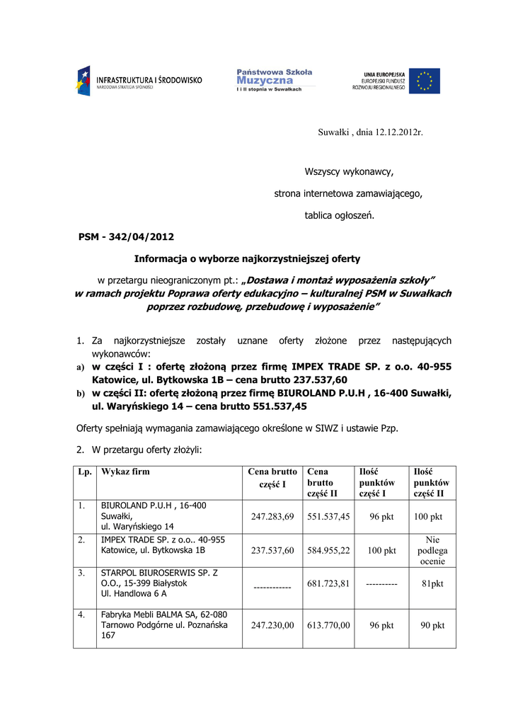 Suwałki , dnia 12.12.2012r. Wszyscy wykonawcy, strona internetowa zamawiającego, tablica ogłoszeń. PSM - 342/04/2012 Informacja o wyborze najkorzystniejszej oferty w przetargu nieograniczonym pt.: „Dostawa i montaż wyposażenia szkoły” w ramach projektu Poprawa oferty edukacyjno – kulturalnej PSM w Suwałkach poprzez rozbudowę, przebudowę i wyposażenie” 1. Za najkorzystniejsze zostały uznane oferty złożone przez następujących wykonawców: a) w części I : ofertę złożoną przez firmę IMPEX TRADE SP. z o.o. 40-955 Katowice, ul. Bytkowska 1B – cena brutto 237.537,60 b) w części II: ofertę złożoną przez firmę BIUROLAND P.U.H , 16-400 Suwałki, ul. Waryńskiego 14 – cena brutto 551.537,45 Oferty spełniają wymagania zamawiającego określone w SIWZ i ustawie Pzp. 2. W przetargu oferty złożyli: Lp. Wykaz firm 1. 2. 3. 4. BIUROLAND P.U.H , 16-400 Suwałki, ul. Waryńskiego 14 IMPEX TRADE SP. z o.o.. 40-955 Katowice, ul. Bytkowska 1B STARPOL BIUROSERWIS SP. Z O.O., 15-399 Białystok Ul. Handlowa 6 A Fabryka Mebli BALMA SA, 62-080 Tarnowo Podgórne ul. Poznańska 167 Cena brutto część I Cena brutto część II Ilość punktów część I Ilość punktów część II 247.283,69 551.537,45 96 pkt 100 pkt 237.537,60 584.955,22 100 pkt Nie podlega ocenie ------------ 681.723,81 ---------- 81pkt 247.230,00 613.770,00 96 pkt 90 pkt 3. W części II z postępowania wykluczono wykonawcę IMPEX TRADE SP. z o.o. 40-955 Katowice, ul. Bytkowska 1B na podstawie art. 24 ust 2 pkt. 4 ustawy Pzp. Wymieniony wykonawca nie załączył do oferty atestu na stoliki i krzesła szkole oraz atestu wytrzymałościowego na stół konferencyjny. Wykonawca został wezwany na podstawie art. 26 ust 3 ustawy Pzp do uzupełnienia w/w dokumentów. W wyznaczonym terminie żądane atesty nie zostały dostarczone, co powoduje niemożliwość potwierdzenia spełnienia warunków udziału w postępowaniu. Nie dostarczenie atestów powoduje również konieczność odrzucenia oferty na podstawie art. 89 ust. 1 pkt. 2 ustawy Pzp, gdyż treść oferty nie odpowiada treści SIWZ. 4. Podpisanie umów z wybranymi wykonawcami nastąpi zgodnie z art. 94 ust 1 pkt. 1 ustawy Pzp.