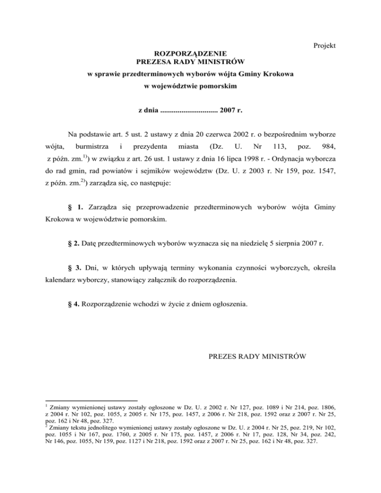 Projekt ROZPORZĄDZENIE PREZESA RADY MINISTRÓW w sprawie przedterminowych wyborów wójta Gminy Krokowa w województwie pomorskim z dnia .............................. 2007 r. Na podstawie art. 5 ust. 2 ustawy z dnia 20 czerwca 2002 r. o bezpośrednim wyborze wójta, burmistrza i prezydenta miasta (Dz. U. Nr 113, poz. 984, z późn. zm.1)) w związku z art. 26 ust. 1 ustawy z dnia 16 lipca 1998 r. - Ordynacja wyborcza do rad gmin, rad powiatów i sejmików województw (Dz. U. z 2003 r. Nr 159, poz. 1547, z późn. zm.2)) zarządza się, co następuje: § 1. Zarządza się przeprowadzenie przedterminowych wyborów wójta Gminy Krokowa w województwie pomorskim. § 2. Datę przedterminowych wyborów wyznacza się na niedzielę 5 sierpnia 2007 r. § 3. Dni, w których upływają terminy wykonania czynności wyborczych, określa kalendarz wyborczy, stanowiący załącznik do rozporządzenia. § 4. Rozporządzenie wchodzi w życie z dniem ogłoszenia. PREZES RADY MINISTRÓW 1 Zmiany wymienionej ustawy zostały ogłoszone w Dz. U. z 2002 r. Nr 127, poz. 1089 i Nr 214, poz. 1806, z 2004 r. Nr 102, poz. 1055, z 2005 r. Nr 175, poz. 1457, z 2006 r. Nr 218, poz. 1592 oraz z 2007 r. Nr 25, poz. 162 i Nr 48, poz. 327. 2 Zmiany tekstu jednolitego wymienionej ustawy zostały ogłoszone w Dz. U. z 2004 r. Nr 25, poz. 219, Nr 102, poz. 1055 i Nr 167, poz. 1760, z 2005 r. Nr 175, poz. 1457, z 2006 r. Nr 17, poz. 128, Nr 34, poz. 242, Nr 146, poz. 1055, Nr 159, poz. 1127 i Nr 218, poz. 1592 oraz z 2007 r. Nr 25, poz. 162 i Nr 48, poz. 327. Załącznik do rozporządzenia Prezesa Rady Ministrów z dnia .................. r. (poz. .........) KALENDARZ WYBORCZY Lp. Termin wykonania czynności wyborczej Treść czynności wyborczej 1 1 w dniu wejścia w życie rozporządzenia 2 - 3 2 do 18 czerwca 2007 r. - 3 do 20 czerwca 2007 r. - 4 do 25 czerwca 2007 r. - 5 - 6 do 11 lipca 2007 r. (do godz. 24:00) do 12 lipca 2007 r. 7 do 16 lipca 2007 r. - - - 8 do 23 lipca 2007 r. - 9 od 23 lipca 2007 r. - 10 11 3 sierpnia 2007 r. o godz. 24:00 4 sierpnia 2007 r. - 12 5 sierpnia 2007 r. godz. 6.00 - 20.00 - podanie do publicznej wiadomości, w formie obwieszczenia Wojewody, rozporządzenia Prezesa Rady Ministrów w sprawie przedterminowych wyborów wójta Gminy Krokowa podanie do publicznej wiadomości, w formie obwieszczenia, informacji o siedzibie gminnej komisji wyborczej, zawiadomienie Komisarza Wyborczego o utworzeniu komitetów wyborczych zgłaszanie kandydatów do składu gminnej komisji wyborczej powołanie przez Komisarza Wyborczego gminnej komisji wyborczej zgłaszanie gminnej komisji wyborczej do zarejestrowania kandydatów na wójta zgłaszanie kandydatów do składu obwodowych komisji wyborczych powołanie obwodowych komisji wyborczych, podanie do publicznej wiadomości, w formie obwieszczenia, informacji o: a) numerach i granicach obwodów głosowania, b) wyznaczonych siedzibach obwodowych komisji wyborczych, składanie przez pełnomocników komitetów wyborczych wniosków o przydział nieodpłatnego czasu antenowego w programach telewizji publicznej i publicznego radia podanie do publicznej wiadomości, w drodze rozplakatowania, obwieszczenia gminnej komisji wyborczej o zarejestrowanych kandydatach na wójta, na którym umieszczone są, w kolejności alfabetycznej nazwisk: nazwiska, imiona, wiek, wykształcenie, miejsce zamieszkania, nazwa komitetu zgłaszającego kandydata oraz nazwa partii politycznej, do której należy kandydat, sporządzenie spisu wyborców rozpoczęcie nieodpłatnego rozpowszechniania audycji wyborczych w programach telewizji publicznej i publicznego radia zakończenie kampanii wyborczej przekazanie przewodniczącym obwodowych komisji wyborczych spisów wyborców przeprowadzenie głosowania UZASADNIENIE Zarządzenie wyborów przedterminowych uzasadnia wygaśnięcie mandatu wójta gminy Krokowa wskutek jego śmierci. Przepis art. 26 ust. 1 pkt 7 ustawy z dnia 20 czerwca 2002 roku o bezpośrednim wyborze wójta, burmistrza i prezydenta miasta (Dz. U. Nr 113, poz. 984, z późn. zm.) stanowi, iż mandat wójta wygasa wskutek jego śmierci. Wygaśnięcie mandatu w przypadkach określonych w art. 26 ust. 1 pkt 1-7 stwierdza rada gminy, w drodze uchwały, najpóźniej po upływie miesiąca od dnia wystąpienia przesłanek odnoszących taki skutek. Rada Gminy Krokowa podjęła uchwałę Nr X/55/2007 w sprawie stwierdzenia wygaśnięcia mandatu Wójta na posiedzeniu w dniu 16 maja 2007 roku. W myśl art. 5 ust. 2 ustawy o bezpośrednim wyborze wójta, burmistrza i prezydenta miasta, przedterminowe wybory wójta zarządza, w drodze rozporządzenia, Prezes Rady Ministrów w trybie określonym w art. 26 ustawy z dnia 16 lipca 1998 r. - Ordynacja wyborcza do rad gmin, rad powiatów i sejmików województw (Dz. U. z 2003 r. Nr 159, poz. 1547, z późn. zm.). Z uwagi na terminy czynności wyborczych nie jest możliwe zachowanie 14-dniowego vacatio legis. W przedmiotowym przypadku uzasadnionym pozostaje skorzystanie z możliwości skrócenia ww. terminu, przewidzianej w art. 4 ust. 2 ustawy z dnia 20 lipca 2000 r. o ogłaszaniu aktów normatywnych i niektórych innych aktów prawnych (Dz. U. z 2005 r. Nr 190, poz. 1606, z późn. zm.). Wskutek orzeczenia Trybunału Konstytucyjnego z dnia 11 maja 2007 r. (sygn. akt K 2/07, ogłoszonego w Dzienniku Ustaw Nr 85, poz. 571) utracił moc obowiązującą art. 10 ustawy z dnia 18 października 2006 r. o ujawnianiu informacji o dokumentach organów bezpieczeństwa państwa z lat 1944 – 1990 oraz treści tych dokumentów (Dz. U. z 2007 r. Nr 63, poz. 425), jak również załączniki nr 1 i 2 do tejże ustawy. W związku z powyższym, w treści czynności wyborczej określonej numerem 9 w kalendarzu wyborczym została pominięta informacja dotycząca oświadczeń lustracyjnych stwierdzających fakt pracy lub służby w organach bezpieczeństwa państwa lub współpracy z nimi, pomimo obowiązującego brzmienia art. 8 ust. 1 pkt 1a ustawy o bezpośrednim wyb