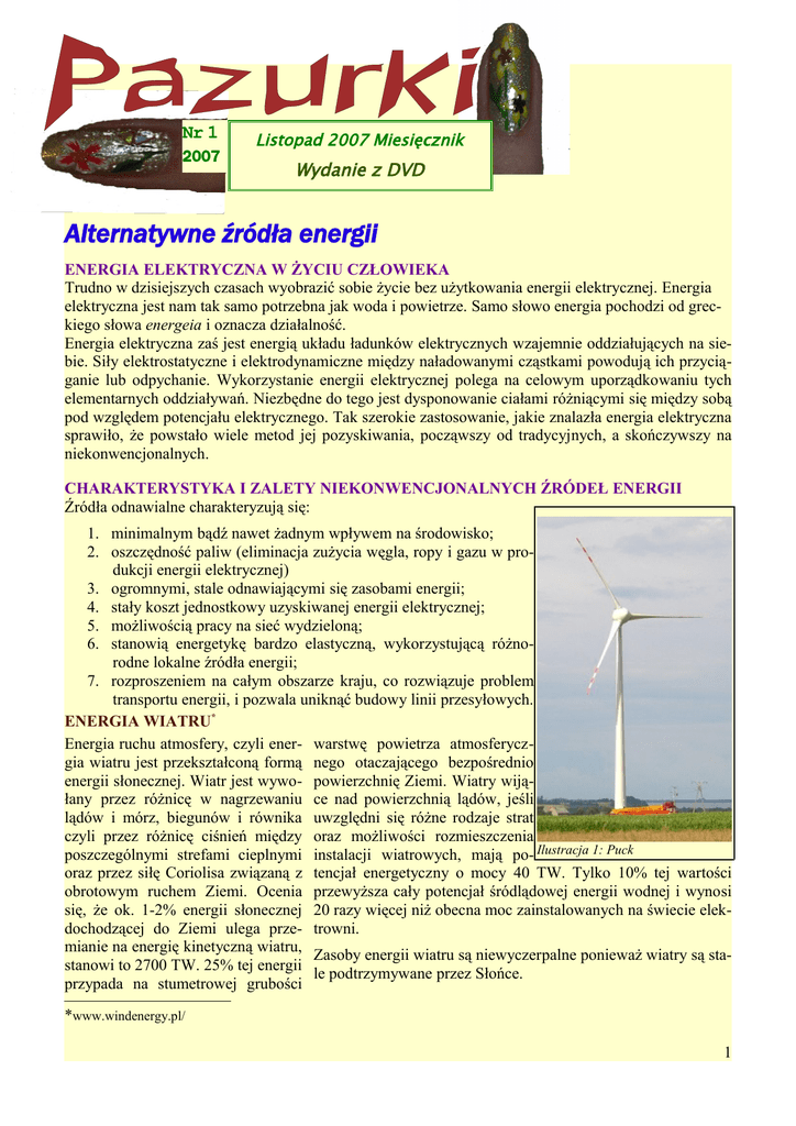 Nr 1 2007 Listopad 2007 Miesięcznik Wydanie z DVD Alternatywne źródła energii ENERGIA ELEKTRYCZNA W ŻYCIU CZŁOWIEKA Trudno w dzisiejszych czasach wyobrazić sobie życie bez użytkowania energii elektrycznej. Energia elektryczna jest nam tak samo potrzebna jak woda i powietrze. Samo słowo energia pochodzi od greckiego słowa energeia i oznacza działalność. Energia elektryczna zaś jest energią układu ładunków elektrycznych wzajemnie oddziałujących na siebie. Siły elektrostatyczne i elektrodynamiczne między naładowanymi cząstkami powodują ich przyciąganie lub odpychanie. Wykorzystanie energii elektrycznej polega na celowym uporządkowaniu tych elementarnych oddziaływań. Niezbędne do tego jest dysponowanie ciałami różniącymi się między sobą pod względem potencjału elektrycznego. Tak szerokie zastosowanie, jakie znalazła energia elektryczna sprawiło, że powstało wiele metod jej pozyskiwania, począwszy od tradycyjnych, a skończywszy na niekonwencjonalnych. CHARAKTERYSTYKA I ZALETY NIEKONWENCJONALNYCH ŹRÓDEŁ ENERGII Źródła odnawialne charakteryzują się: 1. minimalnym bądź nawet żadnym wpływem na środowisko; 2. oszczędność paliw (eliminacja zużycia węgla, ropy i gazu w produkcji energii elektrycznej) 3. ogromnymi, stale odnawiającymi się zasobami energii; 4. stały koszt jednostkowy uzyskiwanej energii elektrycznej; 5. możliwością pracy na sieć wydzieloną; 6. stanowią energetykę bardzo elastyczną, wykorzystującą różnorodne lokalne źródła energii; 7. rozproszeniem na całym obszarze kraju, co rozwiązuje problem transportu energii, i pozwala uniknąć budowy linii przesyłowych. ENERGIA WIATRU* Energia ruchu atmosfery, czyli ener- warstwę powietrza atmosferyczgia wiatru jest przekształconą formą nego otaczającego bezpośrednio energii słonecznej. Wiatr jest wywo- powierzchnię Ziemi. Wiatry wijąłany przez różnicę w nagrzewaniu ce nad powierzchnią lądów, jeśli lądów i mórz, biegunów i równika uwzględni się różne rodzaje strat czyli przez różnicę ciśnień między oraz możliwości rozmieszczenia poszczególnymi strefami cieplnymi instalacji wiatrowych, mają po- Ilustracja 1: Puck oraz przez siłę Coriolisa związaną z tencjał energetyczny o mocy 40 TW. Tylko 10% tej wartości obrotowym ruchem Ziemi. Ocenia przewyższa cały potencjał śródlądowej energii wodnej i wynosi się, że ok. 1-2% energii słonecznej 20 razy więcej niż obecna moc zainstalowanych na świecie elekdochodzącej do Ziemi ulega prze- trowni. mianie na energię kinetyczną wiatru, Zasoby energii wiatru są niewyczerpalne ponieważ wiatry są stastanowi to 2700 TW. 25% tej energii le podtrzymywane przez Słońce. przypada na stumetrowej grubości *www.windenergy.pl/ 1 W przypadku wiatrów wiejących Wady: nad otwartym morzem, tam gdzie Zużycie gruntu głębokość pozwala na instalowanie Znaczne koszty siłowni wiatrowych, ich moc ener- Mała koncentracja energii getyczną ocenia się na 20 TW Konieczność magazynowania energii . ENERGIA SPADKU WÓD Znanym i od dawna wy- cjału energetycznego rzek. Rozwój elektrowni korzystywanym surow- wodnych - czystych dla otoczenia, niezależnych cem energetycznym jest od wydobycia i transportu paliw - ograniczony jest "biały węgiel". jedynie wymogami odpowiednich warunków zewnętrznych (terenowych i geologicznych) oraz zależy od wielkości kapitału posiadanego przez inElektrownia Włocławek westora. Najwięcej pieniędzy pochłania budowa Ilustracja 2: Włocławek Tak nazywa się w przenośni przemieszczające się obiektów hydrotechnicznych, nieco mniej - ich masy wody rzecznej i morskiej. Spośród elektrow- wyposażenie. ni wodnych najbardziej rozpowszechnione są zasi- Charakterystyczne dla tego typu elektrowni są nalane energią kinetyczną rzek. Do rzadkości należą tomiast znikome koszty eksploatacji (wynoszące wciąż elektrownie wykorzystujące energię pły- średnio ok. 0,5% łącznych nakładów inwestycyjwów morskich. Opracowywane są projekty mor- nych rocznie) oraz wysoka sprawność energetyczskich elektrowni falowych. na (90-95%). Najobficiej obdarzona "białym węglem" - w sto- Wady: sunku do powierzchni kontynentu - jest Europa, najskromniej Australia. Dotychczas zagospodaro- Awarie zapór wodnych wano energetycznie ok. 15% całkowitego poten- Zakłócenia ekologiczne ENERGIA SŁONECZNA* Energia promieniowania ności. słonecznego stanowi najGęstość energii słonecznej na granicy atmosfery większe źródło energii, wynosi 1,39 kW/m3. Okrąg średnicy równej którym dysponuje człośrednicy Ziemi uzyskuje, zatem łącznie ok. 178 wiek. Wszystkie rodzaje 000 TW. Jednakże nie cała ilość tej energii docieźródeł energii są pochodra do powierzchni Ziemi, jest ona częściowo bonymi energii słonecznej wiem odbijana, rozpraszana, pochłaniana w atpobieranej teraz lub pomosferze. branej przed milionami Wady: lat. Energia słoneczna o . 9 mocy ok. 81 10 MW Znaczne koszty ogrzewa kulę ziemską, z Zużycie gruntu i potrzeba specjalnych materia. 9 łów tego 27 10 MW przypada Rozproszenie na lądy. Ciepło nisko Światowe zapotrzebowanie na moc wszystkich potemperaturostaci energii jest rzędu 0,01.109 MW. Na podsta- we Dłoń redakcyjna: wie tych danych widzimy wchodzące w grę zależRedaktor naczelny: Teresa Ryba Kontakt: [email protected] Nakład 100egz. *www.energiasloneczna.com 2