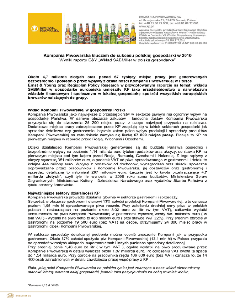 Kompania Piwowarska kluczem do sukcesu polskiej gospodarki w 2010 Wyniki raportu E&Y „Wkład SABMiller w polską gospodarkę” Około 4,7 miliarda złotych oraz ponad 67 tysięcy miejsc pracy jest generowanych bezpośrednio i pośrednio przez wpływy z działalności Kompanii Piwowarskiej w Polsce. Ernst & Young oraz Regioplan Policy Research w przygotowanym raporcie na temat wkładu SABMiller w gospodarkę europejską umieściły KP jako przedsiębiorstwo o największym wkładzie finansowym i społecznym w lokalną gospodarkę spośród wszystkich europejskich browarów naleŜących do grupy. Wkład Kompanii Piwowarskiej w gospodarkę Polski Kompania Piwowarska jako największe z przedsiębiorstw w sektorze piwnym ma ogromny wpływ na gospodarkę Państwa. W samym obszarze zakupów i łańcucha dostaw Kompania Piwowarska przyczynia się do stworzenia 25 200 miejsc pracy, z czego najwięcej przypada na rolnictwo. Dodatkowo miejsca pracy zabezpieczone przez KP znajdują się w takich sektorach gospodarki jak sprzedaŜ detaliczna czy gastronomia. Łącznie zatem pełen wpływ produkcji i sprzedaŜy produktów Kompanii Piwowarskiej na zatrudnienie zamyka się liczbą 67 800 miejsc pracy. Plasuje to KP na pierwszym miejscu w raporcie przed Rosją, Włochami i Czechami. Dzięki działalności Kompanii Piwowarskiej generowane są do budŜetu Państwa pośrednio i bezpośrednio wpływy na poziomie 1,14 miliarda euro tytułem podatków oraz akcyzy, co stawia KP na pierwszym miejscu pod tym kątem przed Rosją, Rumunią, Czechami i Holandią. Z tego wpływy z akcyzy wynoszą 351 milionów euro, a podatek VAT od piwa sprzedawanego w gastronomii i detalu to kolejne 444 miliony euro. Wpływy z podatków od dochodów, wynagrodzeń oraz składki społeczne odprowadzane przez pracowników i Kompanię Piwowarską, jej dostawców oraz gastronomię i sprzedaŜ detaliczną to natomiast 287 milionów euro. Łącznie jest to kwota przekraczająca 4,7 miliarda złotych*, czyli tyle ile wynosiła w 2008 roku suma budŜetów: Ministerstwa Spraw Zagranicznych, Ministerstwa Kultury i Dziedzictwa Narodowego oraz wydatków Skarbu Państwa z tytułu ochrony środowiska. NajwaŜniejsze sektory działalności KP Kompania Piwowarska prowadzi działania głównie w sektorze gastronomi i sprzedaŜy. SprzedaŜ w obszarze gastronomii stanowi 13% całości produkcji Kompanii Piwowarskiej, a to oznacza poziom 1,95 mln hl sprzedawanego piwa rocznie. Przy załoŜeniu średniej ceny piwa w polskich pubach i restauracjach na poziomie około 3,02 euro za litr (w tym VAT), całkowite wydatki konsumentów na piwa Kompanii Piwowarskiej w gastronomii wynoszą wtedy 589 milionów euro ( w tym VAT) - wydatki na piwo netto to 483 miliony euro ( przy stawce VAT 22%). Przy średnim obrocie w gastronomii na poziomie 19 500 euro (bez VAT) na osobę, otrzymujemy 24 800 miejsc pracy w gastronomii dzięki Kompanii Piwowarskiej. W sektorze sprzedaŜy detalicznej podobnie moŜna ocenić znaczenie Kompanii jak w przypadku gastronomi. Około 87% całości spoŜycia piw Kompanii Piwowarskiej (13,1 mln hl) w Polsce przypada na sprzedaŜ w małych sklepach, supermarketach i innych punktach sprzedaŜy detalicznej. Przy średniej cenie 1,43 euro za litr ( w tym VAT ), ogólne wydatki na piwo produkowane przez Kompanie Piwowarską w detalu wynoszą około 1,87 miliarda euro. Po odliczeniu VAT kwota ta spada do 1,54 miliarda euro. Przy obrocie na pracownika rzędu 106 800 euro (bez VAT) oznacza to, Ŝe 14 400 osób zatrudnionych w detalu zawdzięcza pracę współpracy z KP . Rola, jaką pełni Kompania Piwowarska na polskim rynku jest znacząca a nasz wkład ekonomiczny stanowi istotny element całej gospodarki, jednak taka pozycja niesie za sobą równieŜ wielką *Kurs euro 4,13 zł: XII.09 odpowiedzialność. Jako lider musimy być przykładem najlepszych praktyk w kontekście zachowań, kreować trendy, tworzyć wzorce itp. JednakŜe nasze działania nie odnoszą się wyłącznie do sprzedaŜy piwa – musimy być teŜ wzorcowym uczestnikiem Ŝycia społecznego, preferowanym pracodawcą i odpowiedzialnym producentem alkoholu. Dlatego powinniśmy robić i robimy wszystko aby z lidera stać się mistrzem we wszystkich obszarach w jakich działamy – mówi Gary Haigh Dyrektor Generalny KP. Metodologia badania Badania koncentrują się na gospodarczym, regionalnym i społecznym wpływie browarów SABMiller w 9 państwach członkowskich UE oraz Rosji. W 2009 r. Ernst & Young przeprowadził badania wpływu produkcji i sprzedaŜy piwa SABMiller. Badanie zostało zlecone przez SABMiller Europa i dotyczyło 10 krajów: Czech, Węgier, Włoch, Holandii, Polski, Rumunii, Rosji, Słowacji, Hiszpanii i Wielkiej Brytanii. Analiza objęła rok 2008. Jeśli dane za ten rok nie były dostępne, korzystano z danych za 2007, a w szczególnych przypadkach za rok 2006. Przedstawione w raporcie wyniki dotyczące wpływu gospodarczego i regionalnego zostały obliczone na podstawie modelu stworzonego przez Ernst & Young. Z tego powodu wyniki te nie są bezpośrednią reprezentacją i zaleŜą od decyzji podjętych przez Ernst & Young. Gospodarczy wpływ SABMiller, podzielono na trzy rodzaje wpływów: pośredni, bezpośredni i indukowany. Pobierz raport E&Y: „Wkład SABMiller w polską gospodarkę” >>> Pobierz pełną wersję raportu E&Y: „The Contribution made by SABMiller to the European Economy” (wersja EN) >>> Do Redaktora: Kompania Piwowarska - Lider branŜy piwowarskiej w Polsce Kompania Piwowarska jest największym przedsiębiorstwem piwowarskim w Polsce. Kilkusetletnie doświadczenia w warzeniu piwa, nowoczesna technologia i rygorystyczne przestrzeganie zasad produkcji na światowym poziomie (World Class Manufacturing) gwarantują najwyŜszą jakość jej produktów. Do portfela marek naleŜy m.in. Tyskie (ulubione piwo Polaków), śubr (druga marka w Polsce pod względem wielkości sprzedaŜy), Lech, Dębowe Mocne, Redd's, Wojak, a takŜe międzynarodo