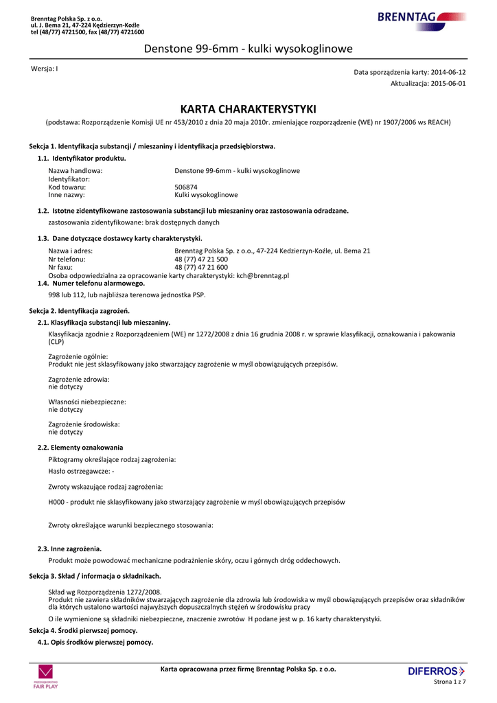 Brenntag Polska Sp. z o.o. ul. J. Bema 21, 47-224 Kędzierzyn-Koźle tel (48/77) 4721500, fax (48/77) 4721600 Denstone 99-6mm - kulki wysokoglinowe Wersja: I Data sporządzenia karty: 2014-06-12 Aktualizacja: 2015-06-01 KARTA CHARAKTERYSTYKI (podstawa: Rozporządzenie Komisji UE nr 453/2010 z dnia 20 maja 2010r. zmieniające rozporządzenie (WE) nr 1907/2006 ws REACH) Sekcja 1. Identyfikacja substancji / mieszaniny i identyfikacja przedsiębiorstwa. 1.1. Identyfikator produktu. Nazwa handlowa: Identyfikator: Kod towaru: Inne nazwy: Denstone 99-6mm - kulki wysokoglinowe 506874 Kulki wysokoglinowe 1.2. Istotne zidentyfikowane zastosowania substancji lub mieszaniny oraz zastosowania odradzane. zastosowania zidentyfikowane: brak dostępnych danych 1.3. Dane dotyczące dostawcy karty charakterystyki. Nazwa i adres: Brenntag Polska Sp. z o.o., 47-224 Kedzierzyn-Koźle, ul. Bema 21 Nr telefonu: 48 (77) 47 21 500 Nr faxu: 48 (77) 47 21 600 Osoba odpowiedzialna za opracowanie karty charakterystyki: [email protected] 1.4. Numer telefonu alarmowego. 998 lub 112, lub najbliższa terenowa jednostka PSP. Sekcja 2. Identyfikacja zagrożeń. 2.1. Klasyfikacja substancji lub mieszaniny. Klasyfikacja zgodnie z Rozporządzeniem (WE) nr 1272/2008 z dnia 16 grudnia 2008 r. w sprawie klasyfikacji, oznakowania i pakowania (CLP) Zagrożenie ogólnie: Produkt nie jest sklasyfikowany jako stwarzający zagrożenie w myśl obowiązujących przepisów. Zagrożenie zdrowia: nie dotyczy Własności niebezpieczne: nie dotyczy Zagrożenie środowiska: nie dotyczy 2.2. Elementy oznakowania Piktogramy określające rodzaj zagrożenia: Hasło ostrzegawcze: Zwroty wskazujące rodzaj zagrożenia: H000 - produkt nie sklasyfikowany jako stwarzający zagrożenie w myśl obowiązujących przepisów Zwroty określające warunki bezpiecznego stosowania: 2.3. Inne zagrożenia. Produkt może powodować mechaniczne podrażnienie skóry, oczu i górnych dróg oddechowych. Sekcja 3. Skład / informacja o składnikach. Skład wg Rozporządzenia 1272/2008. Produkt nie zawiera składników stwarzających zagrożenie dla zdrowia lub środowiska w myśl obowiązujących przepisów oraz składników dla których ustalono wartości najwyższych dopuszczalnych stężeń w środowisku pracy O ile wymienione są składniki niebezpieczne, znaczenie zwrotów H podane jest w p. 16 karty charakterystyki. Sekcja 4. Środki pierwszej pomocy. 4.1. Opis środków pierwszej pomocy. Karta opracowana przez firmę Brenntag Polska Sp. z o.o. Strona 1 z 7 Brenntag Polska Sp. z o.o. ul. J. Bema 21, 47-224 Kędzierzyn-Koźle tel (48/77) 4721500, fax (48/77) 4721600 Denstone 99-6mm - kulki wysokoglinowe Wdychanie: W razie narażenia inhalacyjnego w przypadku złego samopoczucia skontaktować się z lekarzem. Kontakt ze skórą: W razie kontaktu ze skórą w przypadku objawów podrażnienia skontaktować się z lekarzem. Kontakt z oczami: W razie zanieczyszczenia oczu w przypadku objawów podrażnienia skontaktować się z lekarzem. Spożycie: W razie połknięcia, w przypadku złego samopoczucia skontaktować się z lekarzem. 4.2. Najważniejsze ostre i opóźnione objawy oraz skutki narażenia. brak dostępnych danych 4.3. Wskazania dotyczące wszelkiej natychmiastowej pomocy lekarskiej i szczególnego postępowania z poszkodowanym. brak dostępnych danych Sekcja 5. Postępowanie w przypadku pożaru. 5.1. Środki gaśnicze. Pożary w obecności produktu gasić środkami odpowiednimi dla palących się materiałów 5.2. Szczególne zagrożenia związane z substancją lub mieszaniną. Produkt niepalny 5.3. Informacje dla straży pożarnej. brak dostępnych danych Sekcja 6. Postępowanie w przypadku niezamierzonego uwolnienia do środowiska. 6.1. Indywidualne środki ostrożności, wyposażenie ochronne i procedury w sytuacjach awaryjnych. Unikać wzniecania pyłów. 6.2. Środki ostrożności w zakresie ochrony środowiska. brak dostępnych danych 6.3. Metody i materiały zapobiegające rozprzestrzenianiu się skażenia i służące do usuwania skażenia. Rozsypany produkt zebrać mechanicznie do zamykanego pojemnika i przekazać do zniszczenia. 6.4. Odniesienia do innych sekcji. Informacje dotyczące odpowiedniego sprzętu ochrony osobistej podano w sekcji 8. Usuwać zgodnie z zaleceniami przedstawionymi w sekcji 13 Sekcja 7. Postępowanie z substancjami i mieszaninami oraz ich magazynowanie. 7.1. Środki ostrożności dotyczące bezpiecznego postępowania. Unikać wzniecania pyłów. 7.2. Warunki bezpiecznego magazynowania, łącznie z informacjami dotyczącymi wszelkich wzajemnych niezgodności. Magazynować w zamkniętych opakowaniach. Chronić przed wilgocią, promieniowaniem słonecznym i innymi czynnikami środowiskowymi. 7.3. Szczególne zastosowania końcowe. brak dostępnych danych Sekcja 8. Kontrola narażenia / środki ochrony indywidualnej. 8.1. Parametry dotyczące kontroli. Najwyższe dopuszczalne stężenia: NDS, NDSCh - nie oznaczono (wg Rozporządzenia MPiPS z dn. 29 listopada 2002 ; Dz.U. Nr 217, poz. 1833 z późniejszymi zmianami) Zalecenia dotyczące procedury monitoringu zawartości składników niebezpiecznych w powietrzu – metodyka pomiarów: -Rozporządzenie Ministra Zdrowia z dnia 20 kwietnia 2005 r. w sprawie badań i pomiarów czynników szkodliwych dla zdrowia w środowisku pracy (Dz.U. Nr 73, poz.645) -PN-89/Z-01001/06. Ochrona czystości powietrza. Nazwy, określenia i jednostki. Terminologia dotycząca badań jakości powietrza na stanowiskach pracy. -PN Z-04008-7:2002. Ochrona czystości powietrza. Pobieranie próbek. Zasady pobierania próbek powietrza w środowisku pracy i interpretacja wyników. Karta opracowana przez firmę Brenntag Polska Sp. z o.o. Strona 2 z 7 Brenntag Polska Sp. z o.o. ul. J. Bema 21, 47-224 Kędzierzyn-Koźle tel (48/77) 4721500, fax (48/77) 4721600 Denstone 99-6mm - kulki wysokoglinowe -PN-EN-689: 2002. Powietrze na stanowiskach pracy – wytyczne oceny narażenia inhalacyjnego na czynniki chemiczne p
