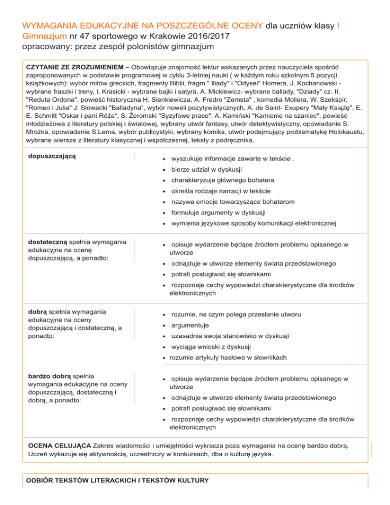 WYMAGANIA EDUKACYJNE NA POSZCZEGÓLNE OCENY dla uczniów klasy I Gimnazjum nr 47 sportowego w Krakowie 2016/2017 opracowany: przez zespół polonistów gimnazjum CZYTANIE ZE ZROZUMIENIEM – Obowiązuje znajomość lektur wskazanych przez nauczyciela spośród zaproponowanych w podstawie programowej w cyklu 3letniej nauki ( w każdym roku szkolnym 5 pozycji książkowych): wybór mitów greckich, fragmenty Biblii, fragm." Iliady" i "Odysei" Homera, J. Kochanowski wybrane fraszki i treny, I. Krasicki wybrane bajki i satyra, A. Mickiewicz wybrane ballady, "Dziady" cz. II, "Reduta Ordona", powieść historyczna H. Sienkiewicza, A. Fredro "Zemsta" , komedia Moliera, W. Szekspir, "Romeo i Julia" J. Słowacki "Balladyna", wybór noweli pozytywistycznych, A. de Saint Exupery "Mały Książę", E. E. Schmitt "Oskar i pani Róża", S. Żeromski "Syzyfowe prace", A. Kamiński "Kamienie na szaniec", powieść młodzieżowa z literatury polskiej i światowej, wybrany utwór fantasy, utwór detektywistyczny, opowiadanie S. Mrożka, opowiadanie S.Lema, wybór publicystyki, wybrany komiks, utwór podejmujący problematykę Holokaustu, wybrane wiersze z literatury klasycznej i współczesnej, teksty z podręcznika. dopuszczającą wyszukuje informacje zawarte w tekście . bierze udział w dyskusji charakteryzuje głównego bohatera określa rodzaje narracji w tekście nazywa emocje towarzyszące bohaterom formułuje argumenty w dyskusji wymienia językowe sposoby komunikacji elektronicznej dostateczną spełnia wymagania edukacyjne na ocenę dopuszczającą, a ponadto: opisuje wydarzenie będące źródłem problemu opisanego w utworze odnajduje w utworze elementy świata przedstawionego potrafi posługiwać się słownikami rozpoznaje cechy wypowiedzi charakterystyczne dla środków elektronicznych dobrą spełnia wymagania edukacyjne na oceny dopuszczającą i dostateczną, a ponadto: rozumie, na czym polega przesłanie utworu argumentuje uzasadnia swoje stanowisko w dyskusji wyciąga wnioski z dyskusji rozumie artykuły hasłowe w słownikach bardzo dobrą spełnia wymagania edukacyjne na oceny dopuszczającą, dostateczną i dobrą, a ponadto: opisuje wydarzenie będące źródłem problemu opisanego w utworze odnajduje w utworze elementy świata przedstawionego potrafi posługiwać się słownikami rozpoznaje cechy wypowiedzi charakterystyczne dla środków elektronicznych OCENA CELUJĄCA Zakres wiadomości i umiejętności wykracza poza wymagania na ocenę bardzo dobrą. Uczeń wykazuje się aktywnością, uczestniczy w konkursach, dba o kulturę języka. ODBIÓR TEKSTÓW LITERACKICH I TEKSTÓW KULTURY dopuszczającą analizuje schemat tworzenia opisu, opowiadania, streszczenia, listu, charakterystyki sporządza opis miejsca, przeżyć lub przedmiotu tworzy samodzielnie notatkę opowiada poznany tekst charakteryzuje rodzaje literackie dostrzega różnice między rodzajami literackimi przyporządkowuje gatunki literackie do rodzajów pisze wypracowanie na temat tworzy na podstawie tekstu ramowy plan wydarzeń określa sposób prowadzenia narracji zna środki artystycznego wyrazu określa nadawcę i adresata wypowiedzi dostateczną spełnia wymagania edukacyjne na ocenę dopuszczającą, a ponadto: omawia wyznaczniki poszczególnych rodzajów literackich opisuje obrazy tworzy pisemną formę wypowiedzi na zadany temat dostrzega elementy wspólne dla różnych tekstów analizuje wiersz określa główny temat utworu rozpoznaje zastosowane w utworze środki artystyczne dobrą spełnia wymagania edukacyjne na oceny dopuszczającą i dostateczną, a ponadto: wymienia najważniejsze cechy antyku, średniowiecza, renesansu, baroku i oświecenia interpretuje obrazy redaguje pisemną formę wypowiedzi zgodnie ze schematem kompozycyjnym odpowiada samodzielnie na postawione pytania omawia na czym polegają i czemu służą analiza i interpretacja bardzo dobrą spełnia wymagania edukacyjne na oceny dopuszczającą, dostateczną i dobrą, a ponadto: objaśnia, na czym polega aktualność wskazanych utworów omawia nawiązania do mitologii we współczesnych tekstach literackich Posługuje się sprawnie różnymi formami notatek Wykazuje kreatywność w tworzeniu wypowiedzi pisemnych i ustnych samodzielnie redaguje pytania do tekstu rozpoznaje intencję wypowiedzi OCENA CELUJĄCA Zakres wiadomości i umiejętności wykracza poza wymagania na ocenę bardzo dobrą. Uczeń wykazuje się aktywnością, uczestniczy w konkursach, dba o kulturę języka. WIEDZA O JĘZYKU dopuszczającą rozpoznaje frazeologizmy rozpoznaje wyrazy podstawowe i pochodne rozpoznaje odmienne i nieodmienne części mowy i poprawnie się nimi posługuje potrafi wskazać w tekście i zbudować samodzielnie zdanie dostateczną spełnia wymagania edukacyjne na ocenę dopuszczającą, a ponadto: podaje źródło frazeologizmu opisuje budowę słowotwórczą wyrazu tworzy rodzinę wyrazów rozpoznaje formę wyrazu rozróżnia zdanie i równoważnik zdania dobrą spełnia wymagania edukacyjne na oceny dopuszczającą i dostateczną, a ponadto: wyjaśnia znaczenie frazeologizmu rozpoznaje typy formantów stosuje poprawne formy wyrazów odmieniających się nietypowo rozróżnia rodzaje zdań i potrafi je zbudować bardzo dobrą spełnia wymagania edukacyjne na oceny dopuszczającą, dostateczną i dobrą, a ponadto: posługuje się frazeologizmami wyodrębnia rdzeń, wskazuje oboczności świadomie używa różnych form wyrazu w wypowiedziach ustnych i pisemnych rozróżnia i potrafi zbudować zdanie z orzeczeniem w formie nieosobowej, wykrzyknienie, zawiadomienie OCENA CELUJĄCA Zakres wiadomości i umiejętności wykracza poza wymagania na ocenę bardzo dobrą. Uczeń wykazuje się aktywnością, uczestniczy w konkursach, dba o kulturę języka.