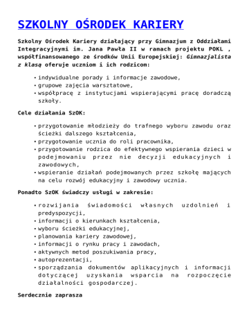 SZKOLNY OŚRODEK KARIERY Szkolny Ośrodek Kariery działający przy Gimnazjum z Oddziałami Integracyjnymi im. Jana Pawła II w ramach projektu POKL , współfinansowanego ze środków Unii Europejskiej: Gimnazjalista z klasą oferuje uczniom i ich rodzicom: indywidualne porady i informacje zawodowe, grupowe zajęcia warsztatowe, współpracę z instytucjami wspierającymi pracę doradczą szkoły. Cele działania SzOK: przygotowanie młodzieży do trafnego wyboru zawodu oraz ścieżki dalszego kształcenia, przygotowanie ucznia do roli pracownika, przygotowanie rodzica do efektywnego wspierania dzieci w podejmowaniu przez nie decyzji edukacyjnych i zawodowych, wspieranie działań podejmowanych przez szkołę mających na celu rozwój edukacyjny i zawodowy ucznia. Ponadto SzOK świadczy usługi w zakresie: rozwijania świadomości własnych uzdolnień i predyspozycji, informacji o kierunkach kształcenia, wyboru ścieżki edukacyjnej, planowania kariery zawodowej, informacji o rynku pracy i zawodach, aktywnych metod poszukiwania pracy, autoprezentacji, sporządzania dokumentów aplikacyjnych i informacji dotyczącej uzyskania wsparcia na rozpoczęcie działalności gospodarczej. Serdecznie zaprasza Sylwia Petecka – Nowak doradca zawodowy Szkolny Ośrodek Kariery Poniedziałki: 12.00 – 17.30 Piątki: 13.30 – 18.00 Pani Sylwia: „Uczniowie mają możliwość w szkole nieodpłatnie skorzystać z grupowego i indywidualnego poradnictwa zawodowego w dobrze wyposażonym gabinecie. Po wysokostandaryzowanym badaniu uczeń otrzyma Indywidualną Kartę Opisu z określonymi 9 blokami zainteresowań i proponowanym kierunkiem dalszego kształcenia”. A co na to uczniowie? Marta: „Jestem zainteresowana pracą na platformie elektronicznej pod kierunkiem doradcy zawodowego .Z moją grupą zadaniową zakładamy firmę uczniowską, teraz wirtualną, ale kto wie, może w przyszłości młodsi koledzy skorzystają z naszych pomysłów. Pracy jest sporo, bo planowanie, opis i kalkulowanie zajmuje dużo czasu”. Paulina: „Cieszę się, ze mam okazję przebadania moich zainteresowań, bo nie wiem jeszcze, którą szkołę wybiorę. Czekam niecierpliwie na wyniki”. 001 002 SOCJOTERAPIA Uczniowie na zajęciach rozpoznają i nazywają emocje, uczą się pokojowego rozwiązywania konfliktów, wyrażania uczuć, ćwiczą umiejętności radzenia sobie z napięciem, poznają techniki relaksacyjne. Ćwiczenia te ułatwiają nawiązywanie pozytywnych relacji interpersonalnych. Zajęcia prowadzi terapeuta – pan Piotr Więckowicz. Oto co mówi o atmosferze panującej na zajęciach: Pan Piotr: „ Nie wszyscy aktywnie uczestniczyli w pierwszych zajęciach. To zrozumiałe, że Ci młodzi ludzie musieli mnie trochę poznać i zobaczyć, czym jest socjoterapia, że to nie są typowe szkolne zajęcia, na których będą musieli uczyć się poprawnej pisowni czy matematycznych wzorów.Każdy coś tu znalazł: jedni sposoby konstruktywnej komunikacji, inni umiejętność wyrażania siebie czy relaksację opartą na muzykoterapii (to się chyba wszystkim najbardziej podoba!). Odczuwam ogromną radość widząc osobę, która na początku naszych spotkań była mocno wycofana i wstydliwa, a z czasem nabrała coraz większej pewności siebie i bez obaw wyraża swoje zdanie!” Poznajmy też zdanie uczestników: Paulina: „Zajęcia, na które uczęszczam są dla mnie świetną odskocznią od tego, co mam w szkole na co dzień . Najbardziej podoba mi się „relaksik” na karimatach przy pięknych odgłosach natury”. Sebastian: „Na początku nie chciało mi się przychodzić na socjoterapię. Uważałem, że takie zajęcia nie są mi potrzebne. Dzisiaj myślę, że powinny odbywać się w każdej szkole”. 001 002 003