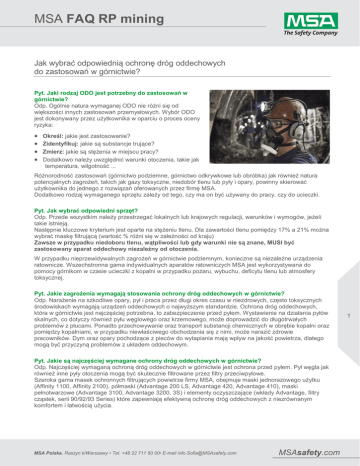 MSA FAQ RP mining Jak wybrać odpowiednią ochronę dróg oddechowych do zastosowań w górnictwie? Pyt. Jaki rodzaj ODO jest potrzebny do zastosowań w górnictwie? Odp. Ogólnie natura wymaganej ODO nie różni się od większości innych zastosowań przemysłowych. Wybór ODO jest dokonywany przez użytkownika w oparciu o proces oceny ryzyka: Określ: jakie jest zastosowanie? Zidentyfikuj: jakie są substancje trujące? Zmierz: jakie są stężenia w miejscu pracy? Dodatkowo należy uwzględnić warunki otoczenia, takie jak temperatura, wilgotność ... Różnorodność zastosowań (górnictwo podziemne, górnictwo odkrywkowe lub obróbka) jak również natura potencjalnych zagrożeń, takich jak gazy toksyczne, niedobór tlenu lub pyły i opary, powinny skierować użytkownika do jednego z rozwiązań oferowanych przez firmę MSA. Dodatkowo rodzaj wymaganego sprzętu zależy od tego, czy ma on być używany do pracy, czy do ucieczki. Pyt. Jak wybrać odpowiedni sprzęt? Odp. Przede wszystkim należy przestrzegać lokalnych lub krajowych regulacji, warunków i wymogów, jeżeli takie istnieją. Następnie kluczowe kryterium jest oparte na stężeniu tlenu. Dla zawartości tlenu pomiędzy 17% a 21% można wybrać maskę filtrującą (wartość % różni się w zależności od kraju) Zawsze w przypadku niedoboru tlenu, wątpliwości lub gdy warunki nie są znane, MUSI być zastosowany aparat oddechowy niezależny od otoczenia. W przypadku nieprzewidywalnych zagrożeń w górnictwie podziemnym, konieczne są niezależne urządzenia ratownicze. Wszechstronna gama indywidualnych aparatów ratowniczych MSA jest wykorzystywana do pomocy górnikom w czasie ucieczki z kopalni w przypadku pożaru, wybuchu, deficytu tlenu lub atmosfery toksycznej. Pyt. Jakie zagrożenia wymagają stosowania ochrony dróg oddechowych w górnictwie? Odp. Narażenie na szkodliwe opary, pył i praca przez długi okres czasu w niezdrowych, często toksycznych środowiskach wymagają urządzeń oddechowych o najwyższym standardzie. Ochrona dróg oddechowych, która w górnictwie jest najczęściej potrzebna, to zabezpieczenie przed pyłem. Wystawienie na działania pyłów skalnych, co dotyczy również pyłu węglowego oraz krzemowego, może doprowadzić do długotrwałych problemów z płucami. Ponadto przechowywanie oraz transport substancji chemicznych w obrębie kopalni oraz pomiędzy kopalniami, w przypadku niewłaściwego obchodzenia się z nimi, może narazić zdrowie pracowników. Dym oraz opary pochodzące z pieców do wytapiania mają wpływ na jakość powietrza, dlatego mogą być przyczyną problemów z układem oddechowym. Pyt. Jakie są najczęściej wymagane ochrony dróg oddechowych w górnictwie? Odp. Najczęściej wymaganą ochroną dróg oddechowych w górnictwie jest ochrona przed pyłem. Pył węgla jak również inne pyły otoczenia mogą być skutecznie filtrowane przez filtry przeciwpyłowe. Szeroka gama masek ochronnych filtrujących powietrze firmy MSA, obejmuje maski jednorazowego użytku (Affinity 1100, Affinity 2100), półmaski (Advantage 200 LS, Advantage 420, Advantage 410), maski pełnotwarzowe (Advantage 3100, Advantage 3200, 3S) i elementy oczyszczające (wkłady Advantage, filtry cząstek, serii 90/92/93 Series) które zapewniają efektywną ochronę dróg oddechowych z niezrównanym komfortem i łatwością użycia. MSA Polska, Raszyn k/Warszawy • Tel. +48 22 711 50 00• E-mail [email protected] MSAsafety.com 1 Spawanie, cięcie płomieniowe, stosowanie rozpuszczalników, używanie paliw, materiałów wybuchowych lub inne działania mogą wytwarzać lotne skażenia, które wymagają stosowania masek wyposażonych we wkład(y) do usuwania skażeń takich jak pył, mgła, opary, substancje organiczne i gazy toksyczne. W takich przypadkach wymagana ochrona dla górnika będzie zależna od pomiarów substancji niebezpiecznych, które jest zazwyczaj wykonywane lokalnie za pomocą linii próbkujących lub przyrządów przenośnych. Niektóre typy cząsteczek spotykanych w kopalniach, takie jak azbest w kopalniach azbestu, miał węgla kamiennego wytwarzany w górnictwie chodnikowym oraz radionuklidy w kopalniach uranu mogą wymagać użycia aparatu oddechowego z nadciśnieniem, wyposażonego w wysoce wydajny filtr cząstek stałych. Wymogi te spełniają maski filtrujące z wymuszonym obiegiem powietrza (PAPR), które dostarczają filtrowane powietrze do kaptura, dopasowanej maski lub zintegrowanego helmu z maską pełnotwarzową. maski pełnotwarzowej wpinanej do hełmu. Pyt. Jak sprawdzić, czy aparat oddechowy jest noszony poprawnie? Odp. Każda osoba nosząca aparat powinna w miarę możliwości wykonać nadciśnieniowy lub podciśnieniowy test szczelności noszonego urządzenia (należy zapoznać się z instrukcją obsługi). Zaleca się, a w niektórych przypadkach jest to obowiązkowe, aby każdy użytkownik został poddany testowi dopasowania zgodnie z EN 529, aby upewnić się, że urządzenie jest idealnie dopasowane do twarzy użytkownika. Pyt. Kiedy należy wymieniać filtry? Odp. Filtr cząstek ma specjalne oznaczenie wskazujące, czy może on być stosowany jeden raz lub wiele razy. Elementy filtrujące są zazwyczaj oznaczone jako NR (nie nadające się do ponownego użycia), co oznacza, że ich użycie jest ograniczone tylko do jednej zmiany i ich wydajność może spaść w określonych warunkach. Muszą one być wymienione po maks. 8 godzinach zgodnie z instrukcją producenta. Filtry cząstek oznaczone jako R (nadające się do ponownego użycia) mogą być używane dłużej niż przez jedną zmianę. Filtr zatyka się stopniowo i musi być wymieniony, gdy opór oddechowy wyraźnie wzrośnie. 2 MSA Polska, Raszyn k/Warszawy • Tel. +48 22 711 50 00• E-mail [email protected] MSAsafety.com
