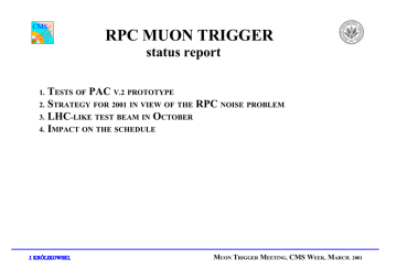C M S R P C M U O N T R IG G E R sta tu s r e p o r t T 1 . S 2 . 3 . 4 . P A C E S T S O F T R A T E G Y I L H C -L IK E M P A C T J. K R Ó L IK O W S K I , O N F O R T E S T T H E V .2 P R O T O T Y P E 2 0 0 1 IN B E A M V IE W IN O O F T H E R P C N O IS E P R O B L E M C T O B E R S C H E D U L E M U O N T R IG G E R M E E T IN G , C M S W E E K , M A R C H . 2 0 0 1 C M S E X T E N S IV E F > O U R T > T W O T E S T S W E R R O R S IN O F T H E M T A H E R E - T H E O - A R E N E IN P U T 9 -T H T W T O F T H E J. K R Ó L IK O W S K I , P A C W 9 T H E E T A G W E R E F O U N D . P A C A S IC S F O S T A G E S O F U S E T H E . R T E S T S IT H S E R IO U S E R R O R S : P T ) IS N O T O P E R A T IO N A L R E G IS T E R S , U S E D L U T S O L V E S T H E L O G IC IN P U T W C A U T IO N ). (L O W J D E S IG N C O U L D M O R E M A S K S A N D L O A D IN G H E O B L O C K IN T E R F E R E N C E > IN S O M E R E P E R F O R M E D . A S IC T H E H IS M E A N S T H A T (E X E R C IS IN G > E R E F O R S G IV E S R A N D O M T H E C L O C K . S W P E R F O R M M U O N Y E T P R O G R A M M IN G R E S U L T S . IT C H IN G P R O B L E M . S E E M S T O - N O T O K . T R IG G E R T M O F T H E E E T IN G , U N D E R S T O O D , O F H IS IS D U E C L O C K C M S W T O T H E D U R IN G E E K , M A R C H . 2 0 0 1 C M S S C T R A T E G Y O N C L U S IO N S O F T H E F O R 2 0 0 1 IN R P C N O IS E W V IE W O F T H E R P C O R K S H O P A N D N O IS E P R O B L E M S U B S E Q U E N T S C R P C n o is e m a y b e le s s o f a p ro b le m th a n d e c la re d in S e p t. 2 0 0 0 . T h e re a re , h o w e v e r, to o m a n y u n c e rta in tie s to b e c o n fid e n t. S trin g e n t Q u a lity C o n tro l c rite ria a re n e e d e d fo r th e R P C s . P re s e n tly th e y a re n o t w e ll d e fin e d . T h e w a y to a p p ro a c h th e m is to u s e p re -p ro d u c tio n o f R P C , w h ic h w ill g iv e 2 0 fu ll s c a le c h a m b e rs b y J u n e : Q C C rite ria fo r th e o n g o in g te s t p ro d u c tio n o f 2 0 fu ll s c a le R P C s : a v e ra g e n o is e < 1 0 H z /c m 2 , n o is e a t th e w o rs t s trip < 1 5 H z /c m 2 . c rite ria a re to b e w ritte n u p b y G . Ia s e lli, s till n o t a v a ila b le . O n e c h a m b e r fro m th is p re -p ro d u c tio n w ill b e c a re fu lly m e a s u re d , th e n o ile d a n d m e a s u re d a g a in . E x te n s iv e s im u la tio n o f th e trig g e r p e rfo rm a n c e w ith e x tra R P C p la n e s s h o w s th a t o n e c a n n o t d ra s tic a lly im p ro v e trig g e r p e rfo rm a n c e . S o m e im p ro v e m e n t is o f c o u rs e p o s s ib le , a n d w e a re w o rk in g o n th a t. Ø § § Ø Ø J. K R Ó L IK O W S K I , M U O N T R IG G E R M E E T IN G , C M S W E E K , M A R C H . 2 0 0 1 trigger rate at 25 GeV (Hz) Trigger rate vs RPC noise 10 8 10 7 10 6 3/4 10 5 4/6 10 4 10 3 10 towers 0-9 5/7 on ti uc 2 ed r e 7th plane is 10 C RP no points - detailed simulation 1 10 -1 lines - analytical calculation -2 hatched areas - safety margins 10 -3 10 5 10 50 100 500 1000 2 RPC noise (Hz/cm ) M o r e p la n e s ? M o r e c o m p lic a te d P A C a lg o r ith m ? C M S M o re R P C p la n e s in th e b a rre l s e e m to b e ru le d o u t. T h e re m ig h t b e o n e e x tra p la n e in th e e n d c a p s . T h e lo w p T b a rre l p la n e s m a y b e Ø u s e d in th e h ig h p T a lg o rith m , re s u ltin g in m o re c o m p lic a te d P A C d e s ig n . S e v e ra l o p tio n s a re b e in g s tu d ie d in W a rsa w . P A C A S I C w ill b e c o n v e r te d to 0 .2 5 Ø ìm , w ith p o s s ib ility o f im p le m e n tin g m o r e in v o lv e d a lg o r ith m ( e .g . w ith m o r e R P C p la n e s ). P o s itiv e o u tc o m e o f th e R P C n o is e Ø w o r k s h o p : s ta tio n 1 R P C s in th e b a rre l w ill b e p la c e d a t lo w e r ra d ii in c re a s in g g e o m e tric a l a c c e p ta n c e . Ø J. K R Ó L IK O W S K I , M U O N T R IG G E R M E E T IN G , C M S W E E K , M A R C H . 2 0 0 1 New proposed RPC geometry R (cm) 800 Drift Tubes RPC new RPC 700 600 500 moved RPC 400 300 200 100 CSC 0 0 200 400 600 800 1000 1200 Z (cm) Barrel — inner RB1 moved ~30cm inwards. Trigger uses 4/6 coincidences. Endcap — new RPC plane at RE2. Trigger uses 4/5 coincidences. L H C C M S Ø Ø o o o o o Ø -L IK E 2 5 n s L H C -lik e F irs t te s t o f th e 6 R P C s a n d F E L in k B o a rd s , S p litte rs , T rig g e r B o a rd , R e a d o u t B o a rd C o m m o n e ffo rt J. K R Ó L IK O W S K I , T E S T B E A M O IN C T O B E R b e a m a v a ila b le in 2 C p e r io d in G I F ( 2 4 .1 0 - 4 .1 1 ) c o m p le te p ro to ty p e R P C trig g e r c h a in : B , o f g ro u p s fro m B a ri, H e ls in k i, K o re a , a n d W a rs a w . M U O N T R IG G E R M E E T IN G , C M S W E E K , M A R C H . 2 0 0 1 C M S IM P A C T o n th e M IL E S T O N E S a n d S C H E D U L E W ith r e s p e c t to th e s c h e d u le d is c u s s e d in th e T D R th e R P C tr ig g e r p r o je c t h a s a c c u m u la te d d e la y o f 2 m o n th s , d e p e n d in g o n th e ta s k s . T h e d e la y is , a n d r e d e s ig n 1 . P A C tr ig th e R P C n o is R P C -p r e -p r o 2 . S p litte r s 3 . T B d e p J. K R Ó L IK O W S K I , a t le a s t p a r tia lly , d u e to th e o p tim o f : g e r p r o c e s s o r (s till in th e flu id s ta e d is c u s s io n ; e x p e c te d to fir m u p d u c tio n r e s u lts in J u n e 2 0 0 1 ), s p e c ific a tio n fin a liz e d 2 w e e k s a e n d s o n P A C a n d S p litte r s . M U O N T R IG G E R -5 iz a tio n te a fte r a fte r M g o , E E T IN G , C M S W E E K , M A R C H . 2 0 0 1 Recently completed Warsaw CMS notes CMS IN-2001/007 Sorting Tree and Ghostbuster for RPC Muon Trigger CMS IN-2001/004 Alternative Implementation of Pattern Comparator Trigger based on SRAM CMS IN-2001/003 Study on Additional RPC Planes for the Muon Trigger CMS IN-2001/002 PAttern Comparat