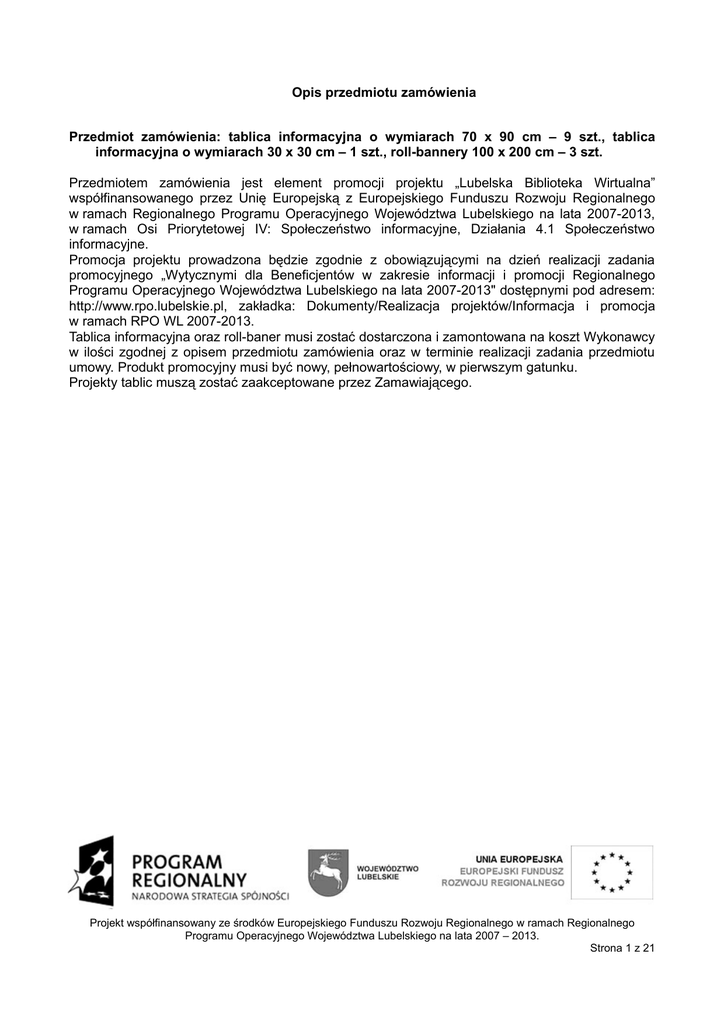 Opis przedmiotu zamówienia Przedmiot zamówienia: tablica informacyjna o wymiarach 70 x 90 cm – 9 szt., tablica informacyjna o wymiarach 30 x 30 cm – 1 szt., roll-bannery 100 x 200 cm – 3 szt. Przedmiotem zamówienia jest element promocji projektu „Lubelska Biblioteka Wirtualna” współfinansowanego przez Unię Europejską z Europejskiego Funduszu Rozwoju Regionalnego w ramach Regionalnego Programu Operacyjnego Województwa Lubelskiego na lata 2007-2013, w ramach Osi Priorytetowej IV: Społeczeństwo informacyjne, Działania 4.1 Społeczeństwo informacyjne. Promocja projektu prowadzona będzie zgodnie z obowiązującymi na dzień realizacji zadania promocyjnego „Wytycznymi dla Beneficjentów w zakresie informacji i promocji Regionalnego Programu Operacyjnego Województwa Lubelskiego na lata 2007-2013" dostępnymi pod adresem: http://www.rpo.lubelskie.pl, zakładka: Dokumenty/Realizacja projektów/Informacja i promocja w ramach RPO WL 2007-2013. Tablica informacyjna oraz roll-baner musi zostać dostarczona i zamontowana na koszt Wykonawcy w ilości zgodnej z opisem przedmiotu zamówienia oraz w terminie realizacji zadania przedmiotu umowy. Produkt promocyjny musi być nowy, pełnowartościowy, w pierwszym gatunku. Projekty tablic muszą zostać zaakceptowane przez Zamawiającego. Projekt współfinansowany ze środków Europejskiego Funduszu Rozwoju Regionalnego w ramach Regionalnego Programu Operacyjnego Województwa Lubelskiego na lata 2007 – 2013. Strona 1 z 21 Przedmiot zamówienia obejmuje zaprojektowanie i dostawę z montażem: 1. TABLICA INFORMACYJNA/PAMIĄTKOWA 70 x 90 cm – 9 szt. Zakres prac: zaprojektowanie (dwa projekty), wykonanie i montaż tablic informacyjnych w lokalizacjach realizacji projektu. Projekt podlega akceptacji Zamawiającego. Wymiary: format 70 cm x 90 cm, grubość minimum 3 mm. Materiał: tablice zostaną wykonane z trwałego materiału, w technologii odpornej na uszkodzenia i warunki atmosferyczne. Konstrukcja: do postawienia na metalowym stelażu lub zawieszenia na ścianach na zewnątrz/wewnątrz budynków za pomocą czterech kołków rozporowych. Montaż: Dokładne miejsce montażu wskaże Zamawiający. Adresy lokalizacji w której ma zostać umieszczona tablica informacyjna zawiera załącznik nr 1. Tablica informacyjna powinna być umieszczona w miejscu najbardziej widocznym, zapewniającym dostęp jak największej liczbie osób. Tło: białe. Nadruk: pełny kolor. Obowiązkowa treść tablicy: nazwa Beneficjenta, rodzaj i tytuł projektu, logo Narodowej Strategii Spójności (dla Programu Regionalnego), herb Województwa Lubelskiego z dopiskiem „Województwo Lubelskie” z prawej strony znaku, emblemat Unii Europejskiej z dopiskiem „Unia Europejska” z lewej strony znaku z dopiskiem przy znaku Unii Europejskiej „Europejski Fundusz Rozwoju Regionalnego”, hasło programu: „Twój pomysł, europejskie pieniądze” umieszczone poza ciągiem znaków, opis „Regionalny Program Operacyjny Województwa Lubelskiego na lata 2007 – 2013”. Sposób przygotowania: tablica informacyjna ma być tak przygotowana, by po zakończeniu realizacji Projektu służyła Zamawiającemu, jako tablica pamiątkowa, dla których wymagania zostały określone w „Wytycznych dla Beneficjentów w zakresie informacji i promocji Regionalnego Programu Operacyjnego Województwa Lubelskiego na lata 2007-2013". Ilość: 9 sztuk. Projekt współfinansowany ze środków Europejskiego Funduszu Rozwoju Regionalnego w ramach Regionalnego Programu Operacyjnego Województwa Lubelskiego na lata 2007 – 2013. Strona 2 z 21 2. TABLICA INFORMACYJNA 30 x 30 cm - 1 szt. Zakres prac: zaprojektowanie (dwa projekty), wykonanie i montaż tablicy informacyjnej w lokalizacjach realizacji projektu. Projekt podlega akceptacji Zamawiającego. Wymiary: format 30 cm x 30 cm, grubość minimum 3 mm. Materiał: tablica zostanie wykonana z trwałego materiału, w technologii odpornej na uszkodzenia i warunki atmosferyczne. Konstrukcja: do postawienia na metalowym stelażu lub zawieszenia na ścianach na zewnątrz/wewnątrz budynku za pomocą czterech kołków rozporowych. Stelaż: noga wykonana z profilu aluminiowego, podstawa stalowa. Montaż: Dokładne miejsce montażu wskaże Zamawiający. Adres lokalizacji w której ma zostać umieszczona tablica informacyjna zawiera załącznik nr 1. Tablica informacyjna powinna być zamieszczona w miejscu najbardziej widocznym, zapewniającym dostęp jak największej liczbie osób. Tło: białe. Nadruk: pełny kolor. Obowiązkowa treść tablicy: nazwa Beneficjenta, rodzaj i tytuł projektu, napis Biuro Projektu Lubelska Biblioteka Wirtualna logo Narodowej Strategii Spójności (dla Programu Regionalnego), herb Województwa Lubelskiego z dopiskiem „Województwo Lubelskie” z prawej strony znaku, emblemat Unii Europejskiej z dopiskiem „Unia Europejska” z lewej strony znaku z dopiskiem przy znaku Unii Europejskiej „Europejski Fundusz Rozwoju Regionalnego”, hasło programu: „Twój pomysł, europejskie pieniądze” umieszczone poza ciągiem znaków, opis „Regionalny Program Operacyjny Województwa Lubelskiego na lata 2007 – 2013”. Ilość: 1 sztuka. Projekt współfinansowany ze środków Europejskiego Funduszu Rozwoju Regionalnego w ramach Regionalnego Programu Operacyjnego Województwa Lubelskiego na lata 2007 – 2013. Strona 3 z 21 3. ROLL- BANERY 100 x 200 cm - 3 szt. Zakres prac: zaprojektowanie (dwa projekty), wydruk, dostawa. Projekt podlega akceptacji Zamawiającego. Wymiary: 100 cm x 200 cm. Tło i kolor napisów: pełny kolor jednostronnie. Konstrukcja: z anodowanego aluminium, składany aluminiowy maszt, dwie listwy mocujące z zapięciem typu CLIP. Kasetka powinna posiadać system pozwalający na wysuwanie grafiki. Kasetka z systemem samozwijającym się, sprężynowym i dwiema nóżkami. Futerał z wkładką ochronną i rączką do przenoszenia. Obowiązkowa treść roll-banera: nazwa Beneficjenta, tytuł projektu