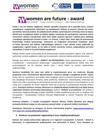 Każdy z nas zna kobiety wyjątkowe, których specyfika przejawia się w sposobie bycia, cechach zawodowych, osiągnięciach rodzinnych czy zawodowych. Kobiety są wzorem, kluczem do zmian, od wieków stanowią bodziec do podejmowania działań, systematycznie zmieniają świat na lepszy. Wśród tych szczególnych kobiet są kobiety będące motywacją do wychodzenia naprzeciw swoim marzeniom i planom zawodowym; takie które dzięki swojemu uporowi i ciężkiej pracy zakładają i zarządzają największymi firmami w kraju i na świecie, a także takie, które dążą do promowania konkretnego modelu biznesowego, nastawione na osiągnięcie korzystnych rezultatów. Jeżeli w Twoim otoczeniu jest kobieta odpowiadająca jednemu z tych opisów warto podkreślić jej wyjątkowość i ogłosić światu, że nie tylko w Twoim otoczeniu, mieście, województwie jest kimś niezwykłym. A może to Ty jesteś kobietą wyjątkową? Kobiety bardzo często przyczyniają się do pozytywnego rozwoju gospodarki regionu oraz spójności społecznej, niestety wyjątkowo rzadko jest to zauważane, a jeszcze rzadziej właściwie doceniane. Dlatego weź udział w konkursie „KOBIETY SĄ PRZYSZŁOŚCIĄ”, który organizowany jest z myślą o wyróżnieniu i uhonorowaniu społecznego i gospodarczego zaangażowania kobiet oraz firm przyczyniających się do poprawy jakości życia i pracy kobiet na terenie województwa podkarpackiego. Nominuj kandydatki lub sama weź udział w organizowanym przez nas konkursie. Wysyłaj propozycje wraz z formularzami zgłoszeniowymi i startuj w wyścigu o wyjątkowy prestiż i sławę! Zależy nam na wyróżnieniu tych kobiet, które osiągnęły sukces w biznesie (otwierając własną firmę lub zarządzając kluczowymi firmami), opinii publicznej, działalności charytatywnej. Interesują nas także firmy, które zapewniają na tyle korzystne warunki pracy zatrudnionym w nich kobietom, że nie myślą one o wyjeździe do innych regionów Polski lub za granicę w poszukiwania lepszego miejsca pracy. Zwycięzcy konkursu zostaną odznaczeni na międzynarodowej konferencji oraz będą twarzą regionalnej kampanii promocyjno-wizerunkowej. Konkurs “Kobiety są przyszłością” jest jednym z elementów międzynarodowego projektu WOMEN. Projekt współfinansowany jest ze środków Unii Europejskiej – Europejskiego Funduszu Rozwoju Regionalnego w ramach Programu dla Europy Środkowej. Partnerzy projektu z 5 krajów europejskich (Austria, Niemcy, Polska, Słowenia oraz Węgry) prowadzą działania mające na celu poprawę sytuacji kobiet w regionach słabiej rozwiniętych. Dodatkowe informacje są dostępne na stronie internetowej projektu: www.women-project.eu oraz www.rarr.rzeszow.pl/projekty/women 1. Konkurs na poziomie regionalnym oraz międzynarodowym Konkurs ten zostaje jednocześnie ogłoszony w 6 regionach europejskich: w Saxonii – Anhalt w Niemczech, w województwach podkarpackim oraz pomorskim w Polsce, Trans Danubian na 1 Węgrzech, Steiermark w Austrii oraz Pomuruje w Słowenii . W województwie podkarpackim konkurs jest przeprowadzany przez Rzeszowską Agencję Rozwoju Regionalnego S.A. Ul. Szopena 51 35-959 Rzeszów Osoby do kontaktu: Agnieszka Kojder-Walaszek [email protected] tel. : 17 867 62 44 (07:30 – 15:30) Katarzyna Gelmuda [email protected] tel. : 17 867 62 44 (07:30 – 15:30) Blanka Kopeć [email protected] tel.: 17 867 62 75 (07:30 – 15:30) Zarówno partner projektu jak i lider projektu nie ponoszą odpowiedzialności ani zobowiązań w stosunku do Wnioskodawców (osoba nominowana lub/i nominująca). Wszyscy partnerzy projektu zobowiązują się do przestrzegania ochrony praw osobowych zgodnie z obowiązującymi przepisami krajowymi. Dane będą wykorzystywane jedynie na potrzeby niniejszego konkursu, organizowango w ramach projektu WOMEN. 2. Kategorie konkursu oraz kryteria Konkurs będzie organizowany w 3 równoważnych kategoriach. W ramach każdej kategorii wyboru zwyciężczyń dokona jury, w skład którego będą wchodzić wyłącznie kobiety. Jury reprezentowane będzie przez kobiety z różnych środowisk: pracujące matki, które godzą życie osobiste wraz z zawodowym, młode absolwentki uczelni oraz kobiety wkraczające na rynek pracy. Dla kobiet tych obce nie są różne wyzwania, które czyhają na nie na rynku pracy oraz ogólnie w życiu, dlatego też najlepiej będą mogły zweryfikować formularze zgłaszanych kandydatek oraz ich profile. W skład międzynarodowego jury wejdą przedstawicielki z 5 krajów europejskich, Austrii, Niemiec, Polski, Słowenii oraz Węgier. Jury ma pełną swobodę wyboru zwyciężczyń konkursu. Niemniej jednak, celem wsparcia jury wprowadzono poniższe kategoria wraz z kryteriami, jednakże nie wszystkie kategorie muszą mieć zastosowanie do każdej zgłoszonej kandydatki. A. KOBIETA WZÓR to KOBIETA, która: Założyła lub/i przyczynia się do realizacji wizji firmy/instytucji/stowarzyszenia ; ma duży wpływ na proces decyzyjny/ zarządzanie; ma duży wpływ na kierunek strategiczny firmy/ instytucji/stowarzyszenia lub wspiera rozwój biznesu, ma wpływ na szerszą publiczność (osoba opiniotwórcza) 2 przyczynia się do rozwiązywania społecznych, gospodarczych oraz ekologicznych problemów w swoim regionie pomaga innym ludziom w regionie (np.: dzieci, kobiety, itp.) swoją osobą reprezentuje nadzwyczajną oraz silną osobowość FIRMA PRZYJAZNA KOBIETOM to FIRMA, która: sprzyja godzeniu pracy oraz rodziny (oferuje elastyczny czas pracy, przedszkole przy firmie, możliwość pracowania z domu, itp.); posiada funkcjonująca politykę równych wynagrodzeń na tym samych stanowiskach dla mężczyzn jak i dla kobiet; wspiera rozwój kariery zawodowej kobiet inwestuje w rozwój pracowników - kobiet (edukacja, rozwój zawodowy); charakteryzuje się odpowiedzialnością społeczną; posiada akceptowalny odsetek zatrudnionych kobiet ; w której kobiety mają kluczowe/kierownicze stanowiska w tej 