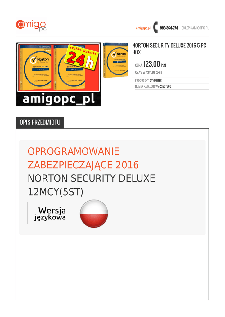 amigopc.pl 883-364-274 [email protected] NORTON SECURITY DELUXE 2016 5 PC BOX CENA: 123,00 PLN CZAS WYSYŁKI: 24H PRODUCENT: SYMANTEC NUMER KATALOGOWY: 21357600 OPIS PRZEDMIOTU OPROGRAMOWANIE ZABEZPIECZAJĄCE 2016 NORTON SECURITY DELUXE 12MCY(5ST) NORTON SECURITY DELUXE TO WYJĄTKOWE NARZĘDZIE SŁUŻĄCE DO SKUTECZNEJ WALKI Z RÓŻNORODNYMI, NAWET NAJNOWSZYMI RODZAJAMI ZAGROŻEŃ. Z JEGO POMOCĄ OCHRONISZ WSZYSTKIE TYPY URZĄDZEŃ, NA KTÓRYCH PRZECHOWYWANE SĄ TWOJE POUFNE DANE I ZA POMOCĄ KTÓRYCH ŁĄCZYSZ SIĘ Z INTERNETEM, NIEZALEŻNIE OD ICH SYSTEMU OPERACYJNEGO. OPRÓCZ TRADYCYJNEJ OCHRONY ANTYWIRUSOWEJ OPROGRAMOWANIE ZAPEWNIA SZCZEGÓLNE ZABEZPIECZENIA TOŻSAMOŚCI UŻYTKOWNIKÓW I DOKONYWANYCH PRZEZ NICH TRANSAKCJI ONLINE. Wykrywamy, analizujemy i powstrzymujemy więcej zagrożeń niż kiedykolwiek wcześniej Ile czasu potrzeba, aby destrukcyjne oprogramowanie zainfekowało nowy komputer? Jeśli używasz bezpłatnych lub innych mniej skutecznych programów zabezpieczających, może to potrwać bardzo krótko. Cyberprzestępcy stosują coraz bardziej zaawansowane metody i dysponują różnymi narzędziami umożliwiającymi uzyskanie dostępu do danych. Inne programy zabezpieczające często nie dają możliwości zwalczania nowych zagrożeń. Programy Norton oferują takie funkcje. Gdy zagrożenia są coraz poważniejsze, nasze programy działają jeszcze skuteczniej. Nasze zespoły specjalistów ds. zabezpieczeń stale analizują nowe zagrożenia i opracowują nowe sposoby ochrony urządzeń Skupiamy się wyłącznie na zabezpieczeniach i oferujemy jedne z najlepiej ocenianych usług na świecie. . Oferujemy klientom korzyści dzięki połączeniu zaangażowania i dogłębnej wiedzy specjalistycznej. Programy Norton pokonały konkurencję w wielu rzetelnych testach porównawczych. Tylko programy Norton zostały wyróżnione 34 nagrodami redakcji PC Magazine, w tym 11 razy z rzędu — to więcej niż w przypadku jakiejkolwiek innej firmy z branży zabezpieczeń.1 Co to oznacza dla użytkowników? Zakup programu Norton Security daje dostęp do czołowych na rynku funkcji zabezpieczających. To takie proste Dajemy gwarancję ochrony. Program Norton Security z kopią zapasową jest tak niezawodny, że oferujemy gwarancję ochrony antywirusowej: jeśli jedno z Twoich urządzeń zostanie zainfekowane wirusem, którego nie da się usunąć, zwrócimy Ci pieniądze Ochrona obejmująca wiele urządzeń i systemów operacyjnych zapewnia bezpieczeństwo Twoich danych w każdym miejscu. Częstsze korzystanie z Internetu i przechowywanie większych ilości informacji osobistych wymaga skuteczniejszych zabezpieczeń. Oglądasz filmy lub robisz zakupy na tablecie? Płacisz rachunki lub sprawdzasz stan konta na smartfonie? Twoje informacje osobiste znajdują się w wielu miejscach. Chroń swoją prywatność w każdej sytuacji. Program Norton Security Deluxe to jedno proste rozwiązanie, które zapewnia ochronę komputerów, smartfonów i tabletów z wieloma systemami operacyjnymi: Windows, Mac, Android i iOS, a nawet Windows 10. Co więcej, tylko program Norton informuje jeszcze przed pobraniem ze Sklepu Google Play aplikacji dla systemu Android, czy wpłynie ona na czas pracy baterii albo zawiera potencjalne zagrożenia lub destrukcyjny kod OPROGRAMOWANIE SKLEPU INTERNETOWEGO