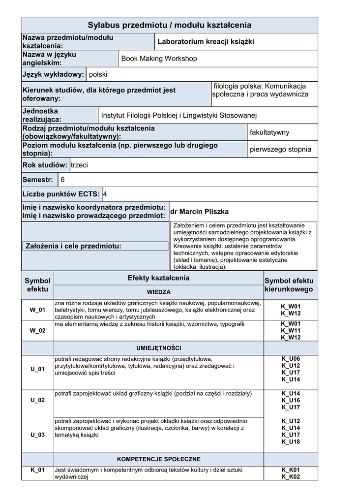 Sylabus przedmiotu / modułu kształcenia Nazwa przedmiotu/modułu kształcenia: Nazwa w języku angielskim: Laboratorium kreacji książki Book Making Workshop Język wykładowy: polski Kierunek studiów, dla którego przedmiot jest oferowany: filologia polska: Komunikacja społeczna i praca wydawnicza Jednostka Instytut Filologii Polskiej i Lingwistyki Stosowanej realizująca: Rodzaj przedmiotu/modułu kształcenia fakultatywny (obowiązkowy/fakultatywny): Poziom modułu kształcenia (np. pierwszego lub drugiego pierwszego stopnia stopnia): Rok studiów: trzeci Semestr: 6 Liczba punktów ECTS: 4 Imię i nazwisko koordynatora przedmiotu: dr Marcin Pliszka Imię i nazwisko prowadzącego przedmiot: Założeniem i celem przedmiotu jest kształtowanie umiejętności samodzielnego projektowania książki z wykorzystaniem dostępnego oprogramowania. Kreowanie książki: ustalenie parametrów technicznych, wstępne opracowanie edytorskie (skład i łamanie), projektowanie estetyczne (okładka, ilustracja). Założenia i cele przedmiotu: Symbol efektu W_01 Efekty kształcenia WIEDZA zna różne rodzaje układów graficznych książki naukowej, popularnonaukowej, beletrystyki, tomu wierszy, tomu jubileuszowego, książki elektronicznej oraz czasopism naukowych i artystycznych ma elementarną wiedzę z zakresu historii książki, wzornictwa, typografii W_02 Symbol efektu kierunkowego K_W01 K_W12 K_W01 K_W11 K_W12 UMIEJĘTNOŚCI U_01 potrafi redagować strony redakcyjne książki (przedtytułowa, przytytułowa/kontrtytułowa, tytułowa, redakcyjna) oraz zredagować i umiejscowić spis treści K_U06 K_U12 K_U17 K_U14 potrafi zaprojektować układ graficzny książki (podział na części i rozdziały) K_U14 K_U16 K_U17 potrafi zaprojektować i wykonać projekt okładki książki oraz odpowiednio skomponować układ graficzny (ilustracja, czcionka, barwy) w korelacji z tematyką ksiązki K_U12 K_U14 K_U17 K_U18 U_02 U_03 KOMPETENCJE SPOŁECZNE K_01 Jest świadomym i kompetentnym odbiorcą tekstów kultury i dzieł sztuki wydawniczej K_K01 K_K02 Zna ograniczenia swojej wiedzy i dostrzega potrzebę dalszego kształcenia Forma i typy zajęć: K_K03 K_K08 K_K11 laboratorium (30 godzin) Wymagania wstępne i dodatkowe: Podstawowa znajomość obsługi programów z pakietu Microsoft Office. Elementarne wiadomości z zakresu historii książki i druku. Treści modułu kształcenia: 1. Zajęcia organizacyjne i wprowadzenie do tematu. - wstępna praca przy komputerze. 2. Teoretyczny namysł nad formowaniem kształtu książki. - projektowanie książki jako zawartej graficznie i logicznie całości, - redaktor w relacjach z autorem, - sugestie autorskie i otrzymanie ostatecznego kształtu pracy. 3. Rozpoznajemy układ graficzny książki. - elementy składowe książki: strony redakcyjne(przedtytułowa, przytytułowa/kontrtytułowa, tytułowa, redakcyjna), - spis treści i jego umiejscowienie, - graficzny podział na części i rozdziały. 4. Uwarunkowania graficzne różnych typów książek. - beletrystyka, książka naukowa i popularnonaukowa, druk bibliofilski, tomy jubileuszowe (i ich specyfika), czasopisma naukowe i artystyczne – cechy koncepcji graficznej i typografii. 5. Wokół szczegółów: okładka i strony tytułowe. - wzornictwo i grafika okładki i jej przełożenie na strony tytułowe oraz wnętrze książki. 6. Rozlokowanie informacji redakcyjnych w książce (dawniej i dziś). - praca przy komputerze. 7. Ilustracja w książce i ozdobniki (typy zróżnicowane pod względem projektowanej grupy odbiorców). - specyfika ilustracji książkowej ze względu na charakter publikacji. - ornamentyka i inicjały, - dobór ilustracji. 8. Projektowanie okładki. - praca z odpowiednim programem (Corel DRAW lub Office Publisher) umożliwiającym tworzenie własnych kompozycji, - wykorzystywanie ilustracji (praca z podstawowym programem do obróbki zdjęć, np. Office Picture Manager) - dobór czcionki, - wykonywanie projektów. 9. Okładka a strony tytułowe i ornamentyka. - korelacja układu graficznego okładki i stron tytułowych. 10. Książka papierowa a książka w internecie. - przegląd i porównanie. Literatura podstawowa: Phil Baines, Andrew Haslam: Pismo i typografia. Warszawa 2010. Robert Chwałowski: Typografia typowej książki. Gliwice 2002. Janusz Dunin: Wstęp do edytorstwa. Łódź 2003. Michael Mitchell, Susan Wightman: Typografia książki. Podręcznik projektanta. Kraków 2012. Robin Williams: Mistrzowskie stosowanie czcionek. Gliwice 2003. Literatura dodatkowa: Filip Trzaska: Poradnik redaktora. Warszawa 1976. Współczesne polskie drukarstwo i grafika książki. Mały słownik encyklopedyczny. Wrocław 1982. Planowane formy/działania/metody dydaktyczne: praca przy komputerze; elementy wykładu; prezentacja Sposoby weryfikacji efektów kształcenia osiąganych przez studenta: Wszystkie efekty kształcenia zweryfikowane zostaną podczas sprawdzania końcowej pracy zaliczeniowej, tj. własnego projektu okładki i stron tytułowych książki w postaci wydruku oraz na bieżąco w trakcie uczestnictwa w zajęciach Forma i warunki zaliczenia: Warunek uzyskania zaliczenia przedmiotu: najwyżej dwie nieusprawiedliwione nieobecności i spełnienie każdego z opisanych niżej warunków: 1/ Przygotowanie do zajęć i aktywność – ocena na bieżąco w trakcie trwania zajęć. 2/ Zaliczenie projektu: własny projekt okładki i stron tytułowych książki w formacie cyfrowym; punktacja –0-25 (2,0) 26-30 (3,0) 31-35 (3,5) 36-41 (4,0) 42-46 (4,5) 47-50 (5,0) Bilans punktów ECTS: Aktywność Obciążenie studenta Udział w ćwiczeniach 30 godz. Samodzielne przygotowanie się do ćwiczeń 30 godz. Udział w konsultacjach godz. z przedmiotu 3 godz. Samodzielne przygotowanie się do zaliczenia 20 godz. Sumaryczne obciążenie pracą studenta 83 godz. Punkty ECTS za przedmiot 4 ECTS