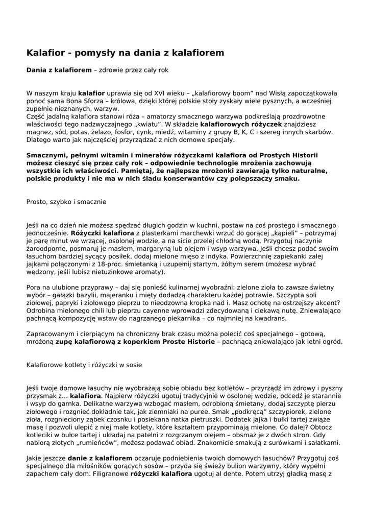 Kalafior - pomysły na dania z kalafiorem Dania z kalafiorem – zdrowie przez cały rok W naszym kraju kalafior uprawia się od XVI wieku – „kalafiorowy boom” nad Wisłą zapoczątkowała ponoć sama Bona Sforza – królowa, dzięki której polskie stoły zyskały wiele pysznych, a wcześniej zupełnie nieznanych, warzyw. Część jadalną kalafiora stanowi róża – amatorzy smacznego warzywa podkreślają prozdrowotne właściwości tego nadzwyczajnego „kwiatu”. W składzie kalafiorowych różyczek znajdziesz magnez, sód, potas, żelazo, fosfor, cynk, miedź, witaminy z grupy B, K, C i szereg innych skarbów. Dlatego warto jak najczęściej przyrządzać z nich domowe specjały. Smacznymi, pełnymi witamin i minerałów różyczkami kalafiora od Prostych Historii możesz cieszyć się przez cały rok – odpowiednie technologie mrożenia zachowują wszystkie ich właściwości. Pamiętaj, że najlepsze mrożonki zawierają tylko naturalne, polskie produkty i nie ma w nich śladu konserwantów czy polepszaczy smaku. Prosto, szybko i smacznie Jeśli na co dzień nie możesz spędzać długich godzin w kuchni, postaw na coś prostego i smacznego jednocześnie. Różyczki kalafiora z plasterkami marchewki wrzuć do gorącej „kąpieli” – potrzymaj je parę minut we wrzącej, osolonej wodzie, a na sicie przelej chłodną wodą. Przygotuj naczynie żaroodporne, posmaruj je masłem, margaryną lub olejem i wsyp warzywa. Jeśli chcesz podać swoim łasuchom bardziej sycący posiłek, dodaj mielone mięso z indyka. Powierzchnię zapiekanki zalej jajkami połączonymi z 18-proc. śmietanką i uzupełnij startym, żółtym serem (możesz wybrać wędzony, jeśli lubisz nietuzinkowe aromaty). Pora na ulubione przyprawy – daj się ponieść kulinarnej wyobraźni: zielone zioła to zawsze świetny wybór – gałązki bazylii, majeranku i mięty dodadzą charakteru każdej potrawie. Szczypta soli ziołowej, papryki i ziołowego pieprzu to nieodzowna kropka nad i. Masz ochotę na ostrzejszy akcent? Odrobina mielonego chili lub pieprzu cayenne wprowadzi zdecydowaną i ciekawą nutę. Zniewalająco pachnącą kompozycję wstaw do nagrzanego piekarnika – co najmniej na kwadrans. Zapracowanym i cierpiącym na chroniczny brak czasu można polecić coś specjalnego – gotową, mrożoną zupę kalafiorową z koperkiem Proste Historie – pachnącą zniewalająco jak letni ogród. Kalafiorowe kotlety i różyczki w sosie Jeśli twoje domowe łasuchy nie wyobrażają sobie obiadu bez kotletów – przyrządź im zdrowy i pyszny przysmak z… kalafiora. Najpierw różyczki ugotuj tradycyjnie w osolonej wodzie, odcedź je starannie i wsyp do garnka. Delikatne warzywa wzbogać masłem, odrobioną śmietany, dodaj szczyptę pierzu ziołowego i rozgnieć dokładnie tak, jak ziemniaki na puree. Smak „podkręcą” szczypiorek, zielone zioła, rozgnieciony ząbek czosnku i posiekana natka pietruszki. Dodatek jajka i bułki tartej zwiąże masę i pozwoli ulepić z niej małe kotlety, które kształtem przypominają mielone. Co dalej? Obtocz kotleciki w bułce tartej i układaj na patelni z rozgrzanym olejem – obsmaż je z dwóch stron. Gdy nabiorą złotych „rumieńców”, możesz podawać obiad. Znakomicie smakują z surówkami i sałatkami. Jakie jeszcze danie z kalafiorem oczaruje podniebienia twoich domowych łasuchów? Przygotuj coś specjalnego dla miłośników gorących sosów – przyda się świeży bulion warzywny, który wypełni zapachem cały dom. Filigranowe różyczki kalafiora ugotuj al dente. Potem utrzyj gładką masę z 12-proc. śmietany i kilku łyżek mąki, połącz je z odrobiną rosołu i wlej do pozostałego bulionu. Przez kilka minut gotuj aromatyczny krem – często mieszaj – masa powinna mieć aksamitną konsystencję. Znakomity, gęstawy sos to idealna polewa dlavróżyczek ułożonych w naczyniu do zapiekania wysmarowanym olejem. Jeszce nieco wonnych ziół – świeżych lub suszonych, odrobina rozkruszonego, żółtego sera na wierzch i przysmak niemal gotowy. Pora włożyć go do piekarnika – poczekaj, aż górna warstwa rozkosznie się zarumieni i proś bliskich na smaczny posiłek i niekończące się rozmowy przy rodzinnym stole. Powered by TCPDF (www.tcpdf.org)