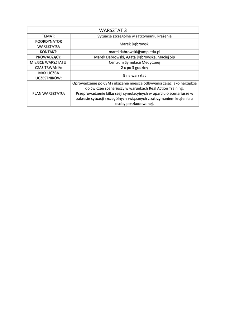 WARSZTAT 3 TEMAT: KOORDYNATOR WARSZTATU: KONTAKT: PROWADZĄCY: MIEJSCE WARSZTATU: CZAS TRWANIA: MAX LICZBA UCZESTNIKÓW: PLAN WARSZTATU: Sytuacje szczególne w zatrzymaniu krążenia Marek Dąbrowski [email protected] Marek Dąbrowski, Agata Dąbrowska, Maciej Sip Centrum Symulacji Medycznej 2 x po 3 godziny 9 na warsztat Oprowadzenie po CSM i ukazanie miejsca odbywania zajęć jako narzędzia do ćwiczeń scenariuszy w warunkach Real Action Training. Przeprowadzenie kilku sesji symulacyjnych w oparciu o scenariusze w zakresie sytuacji szczególnych związanych z zatrzymaniem krążenia u osoby poszkodowanej.