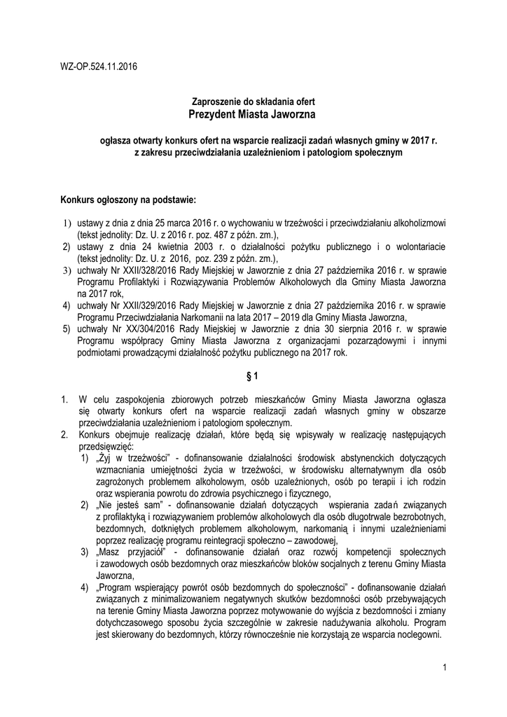 WZ-OP.524.11.2016 Zaproszenie do składania ofert Prezydent Miasta Jaworzna ogłasza otwarty konkurs ofert na wsparcie realizacji zadań własnych gminy w 2017 r. z zakresu przeciwdziałania uzależnieniom i patologiom społecznym Konkurs ogłoszony na podstawie: 1) ustawy z dnia z dnia 25 marca 2016 r. o wychowaniu w trzeźwości i przeciwdziałaniu alkoholizmowi (tekst jednolity: Dz. U. z 2016 r. poz. 487 z późn. zm.), 2) ustawy z dnia 24 kwietnia 2003 r. o działalności pożytku publicznego i o wolontariacie (tekst jednolity: Dz. U. z 2016, poz. 239 z późn. zm.), 3) uchwały Nr XXII/328/2016 Rady Miejskiej w Jaworznie z dnia 27 października 2016 r. w sprawie Programu Profilaktyki i Rozwiązywania Problemów Alkoholowych dla Gminy Miasta Jaworzna na 2017 rok, 4) uchwały Nr XXII/329/2016 Rady Miejskiej w Jaworznie z dnia 27 października 2016 r. w sprawie Programu Przeciwdziałania Narkomanii na lata 2017 – 2019 dla Gminy Miasta Jaworzna, 5) uchwały Nr XX/304/2016 Rady Miejskiej w Jaworznie z dnia 30 sierpnia 2016 r. w sprawie Programu współpracy Gminy Miasta Jaworzna z organizacjami pozarządowymi i innymi podmiotami prowadzącymi działalność pożytku publicznego na 2017 rok. §1 1. 2. W celu zaspokojenia zbiorowych potrzeb mieszkańców Gminy Miasta Jaworzna ogłasza się otwarty konkurs ofert na wsparcie realizacji zadań własnych gminy w obszarze przeciwdziałania uzależnieniom i patologiom społecznym. Konkurs obejmuje realizację działań, które będą się wpisywały w realizację następujących przedsięwzięć: 1) „Żyj w trzeźwości” - dofinansowanie działalności środowisk abstynenckich dotyczących wzmacniania umiejętności życia w trzeźwości, w środowisku alternatywnym dla osób zagrożonych problemem alkoholowym, osób uzależnionych, osób po terapii i ich rodzin oraz wspierania powrotu do zdrowia psychicznego i fizycznego, 2) „Nie jesteś sam” - dofinansowanie działań dotyczących wspierania zadań związanych z profilaktyką i rozwiązywaniem problemów alkoholowych dla osób długotrwale bezrobotnych, bezdomnych, dotkniętych problemem alkoholowym, narkomanią i innymi uzależnieniami poprzez realizację programu reintegracji społeczno – zawodowej, 3) „Masz przyjaciół” - dofinansowanie działań oraz rozwój kompetencji społecznych i zawodowych osób bezdomnych oraz mieszkańców bloków socjalnych z terenu Gminy Miasta Jaworzna, 4) „Program wspierający powrót osób bezdomnych do społeczności” - dofinansowanie działań związanych z minimalizowaniem negatywnych skutków bezdomności osób przebywających na terenie Gminy Miasta Jaworzna poprzez motywowanie do wyjścia z bezdomności i zmiany dotychczasowego sposobu życia szczególnie w zakresie nadużywania alkoholu. Program jest skierowany do bezdomnych, którzy równocześnie nie korzystają ze wsparcia noclegowni. 1 3. 4. 5. Oferent zobowiązany jest do złożenia tylko jednej oferty, z zaznaczeniem, iż nie można łączyć zadań o których mowa w ust. 2 pkt 1 – 4. Zakres przedmiotowy zadania o którym mowa w ust. 2 pkt 1 będzie realizowany poprzez wspieranie działalności środowisk abstynenckich oraz zwiększenie dostępności i podniesienie jakości pomocy dla członków rodzin z problemem alkoholowym: 1) przeciwdziałanie nawrotom alkoholowym towarzyszącym zespołowi zależności alkoholowej poprzez zagospodarowanie czasu wolnego i udzielanie wsparcia trzeźwiejącym i ich rodzinom, 2) zapewnienie zajęć terapeutycznych osobom uzależnionym i współuzależnionym, które będą ich potrzebowały, 3) propagowanie trzeźwego stylu życia w instytucjach i stowarzyszeniach działających na terenie miasta m.in. w Dziennym Domu Pomocy Społecznej, Domu Pomocy Społecznej, Noclegowniach, 4) ograniczanie szkód społecznych, ekonomicznych i zdrowotnych wynikających z nadużywania alkoholu i alkoholizmu podopiecznych, 5) promowanie abstynencji jako stylu życia, 6) korygowanie zachowań ryzykownych osób uzależnionych, 7) organizacja czasu wolnego dla trzeźwych alkoholików i ich rodzin z terenu miasta w formie zajęć: sportowych, kulturalno – oświatowych, festynów rodzinnych, innych działań, 8) propagowanie działalności klubu wśród mieszkańców Gminy Miasta Jaworzna 9) zorganizowanie w ramach Ogólnopolskiego Dnia Trzeźwości działań promujących trzeźwy styl życia, 10) prowadzenie punktu konsultacyjnego dla osób uzależnionych i ich rodzin, 11) zaproponowane przez Oferenta formy rehabilitacji w tym np. dofinansowanie zajęć rehabilitacyjnych w trakcie obozu terapeutycznego. Zakres przedmiotowy zadania o którym mowa w ust. 2 pkt 2 będzie realizowany poprzez zwiększenie oferty działań zmierzających do aktywizacji zawodowej i społecznej osób uzależnionych od środków odurzających, substancji psychotropowych i NSP: 1) przygotowanie i opracowanie wsparcia w postaci organizacji warsztatów kształtowania umiejętności interpersonalnych, oraz konstruktywnych postaw życiowych (w tym warsztaty grupowe, grupy wsparcia, prowadzenie konsultacji indywidualnych) w oparciu o karty potwierdzenia usług doradczych oraz dzienniki zajęć, 2) prowadzenie poradnictwa specjalistycznego w zakresie uzależnień, wsparcia psychologicznego i zawodowego, 3) umożliwienie oraz pomoc uczestnikom zadania w: a) poszukiwaniu zatrudnienia, b) przygotowaniu i opracowaniu dokumentów aplikacyjnych, 4) przeprowadzanie w ramach zadania zajęć dodatkowych podnoszących kwalifikacje uczestników zadania, 5) świadczenie usługi obejmującej następujące zakresy: a) działania terapeutyczne poprzez: ̵ udzielanie porad osobom uzależnionym o dostępnych rozwiązaniach w leczeniu uzależnień, ̵ udzielanie pomocy w przygotowaniu dokumentacji związanej ze skierowaniem do właściwych zakładów lecznictwa, opieki zdrowotnej, ̵ organizowanie dla w/w możliwości spędzania wolnego czasu, b) działania edukacyjno – pomocowe poprzez: ˗ organizowanie kurs