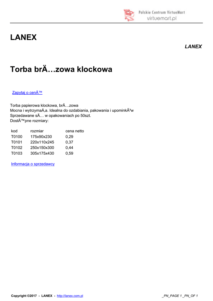 LANEX LANEX Torba brÄ…zowa klockowa Zapytaj o cenÄ™ Torba papierowa klockowa, brÄ…zowa Mocna i wytrzymaÅ‚a. Idealna do ozdabiania, pakowania i upominków Sprzedawane sÄ… w opakowaniach po 50szt. DostÄ™pne rozmiary: kod T0100 T0101 T0102 T0103 rozmiar 175x90x230 220x110x245 250x150x300 305x175x430 cena netto 0,29 0,37 0,44 0,59 Informacja o sprzedawcy Copyright ©2017 - LANEX - http://lanex.com.pl _PN_PAGE 1 _PN_OF 1