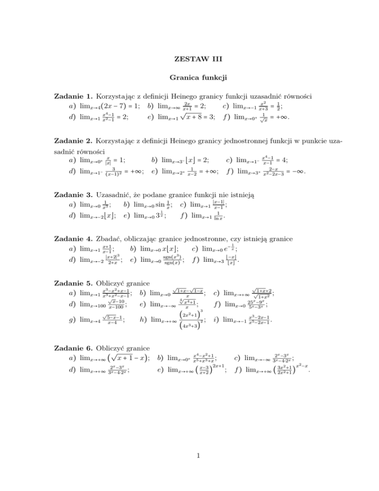 ZESTAW III Granica funkcji Zadanie 1. Korzystając z definicji